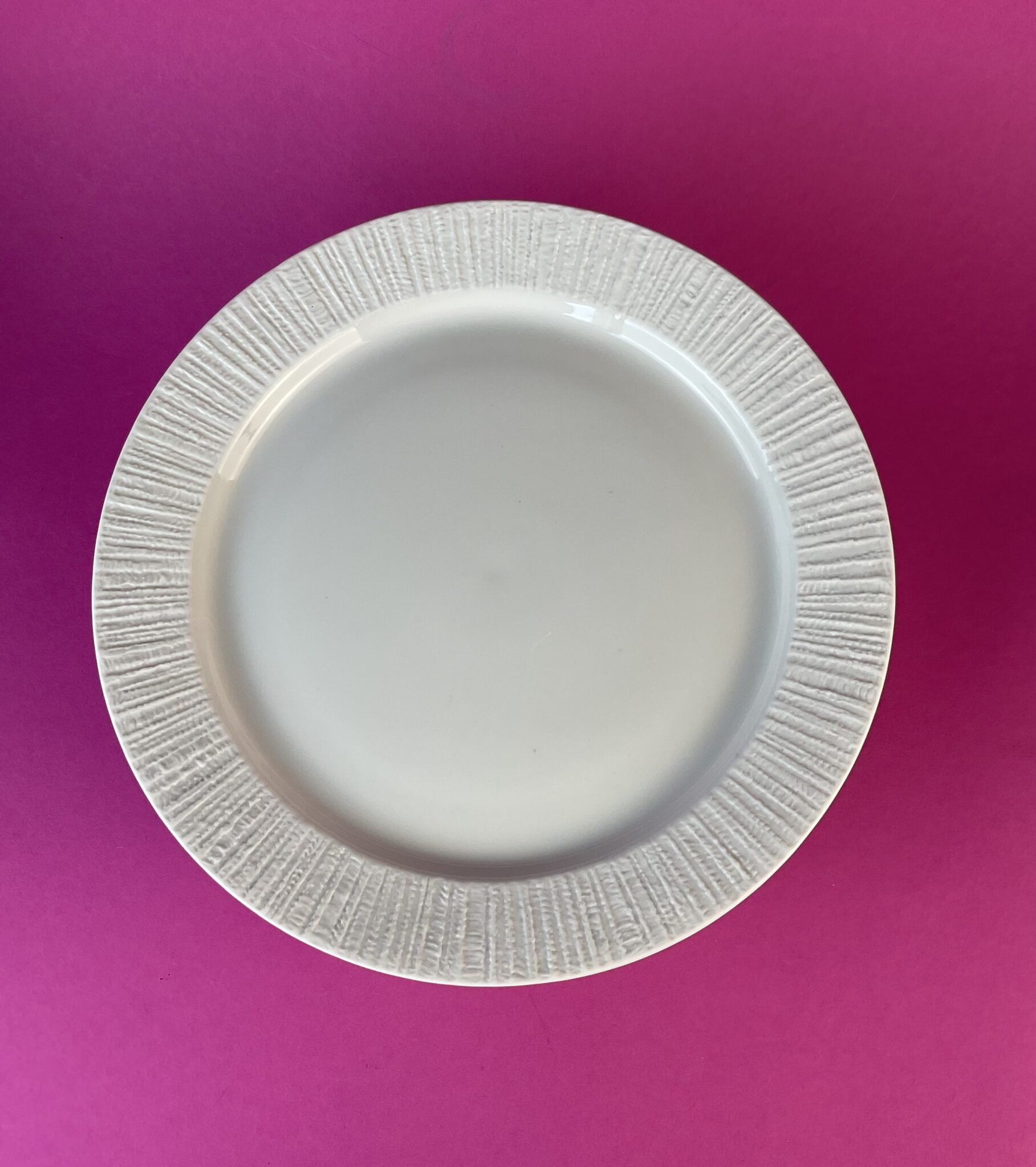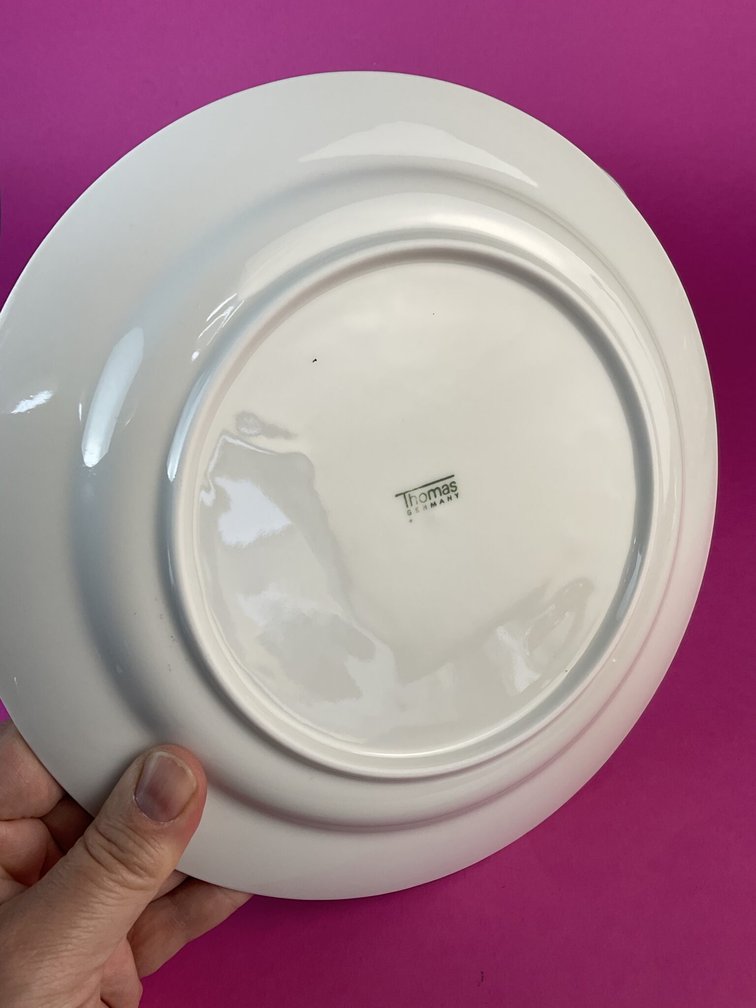 weisses Porzellan, Spiegel glasiert, runder Teller mit matter Fahne (Biskuitporzellan), auf der Unterseite gemarkt mit unterglasurblauer Fabriksmarke „Thomas Germany“, tadelloser Erhaltungszustand