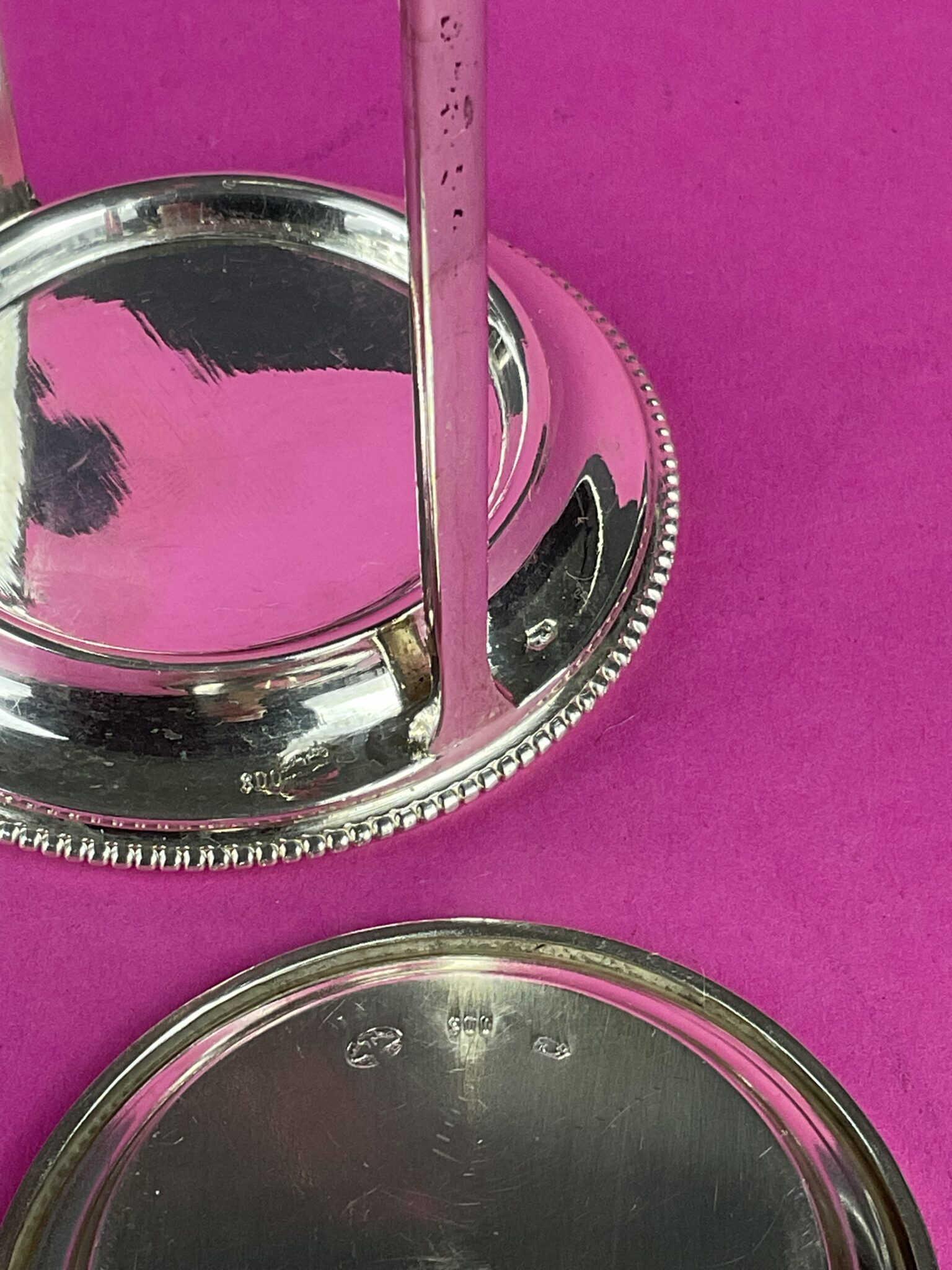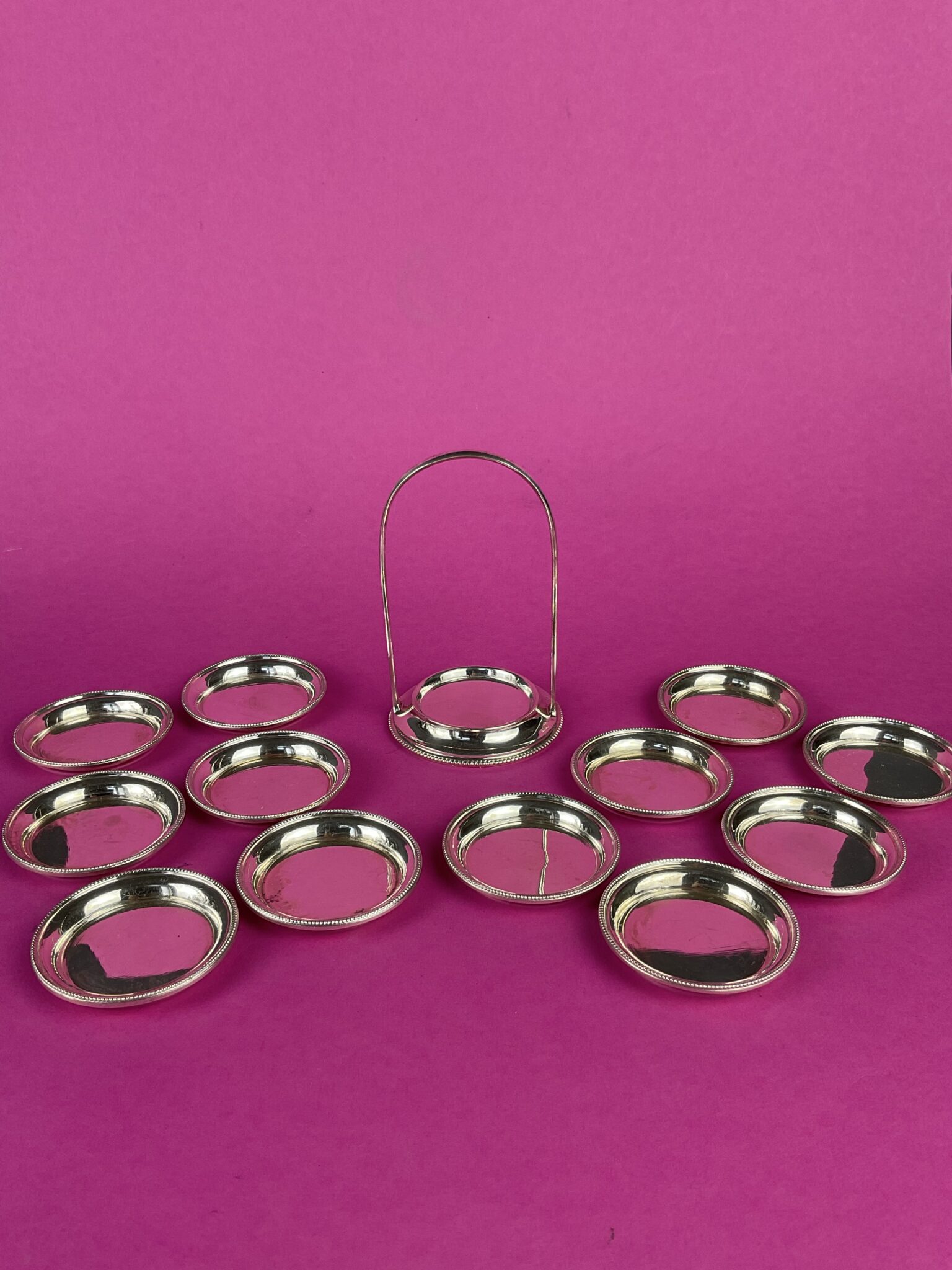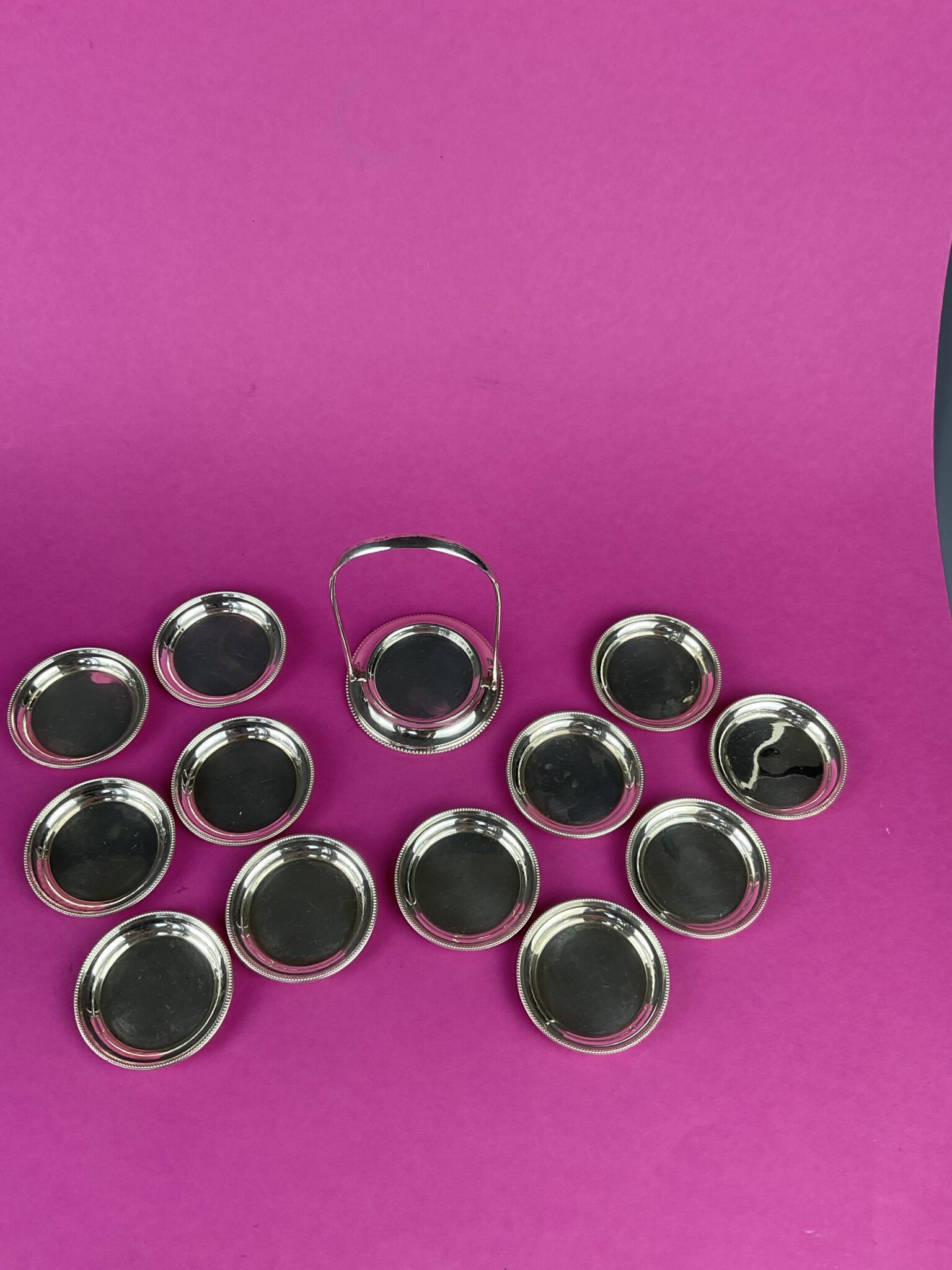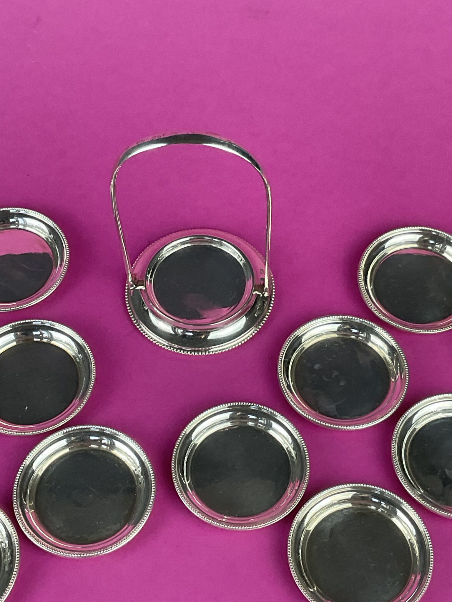 Silber, 12 runde Teller mit umlaufendem Perlrand in Halterung, alle Teile gemarkt mit Wiener Tukankopf nach 1922, Feingehalt 800, Firmenzeichen Moritz Österreicher, tadelloser Erhaltungszustand