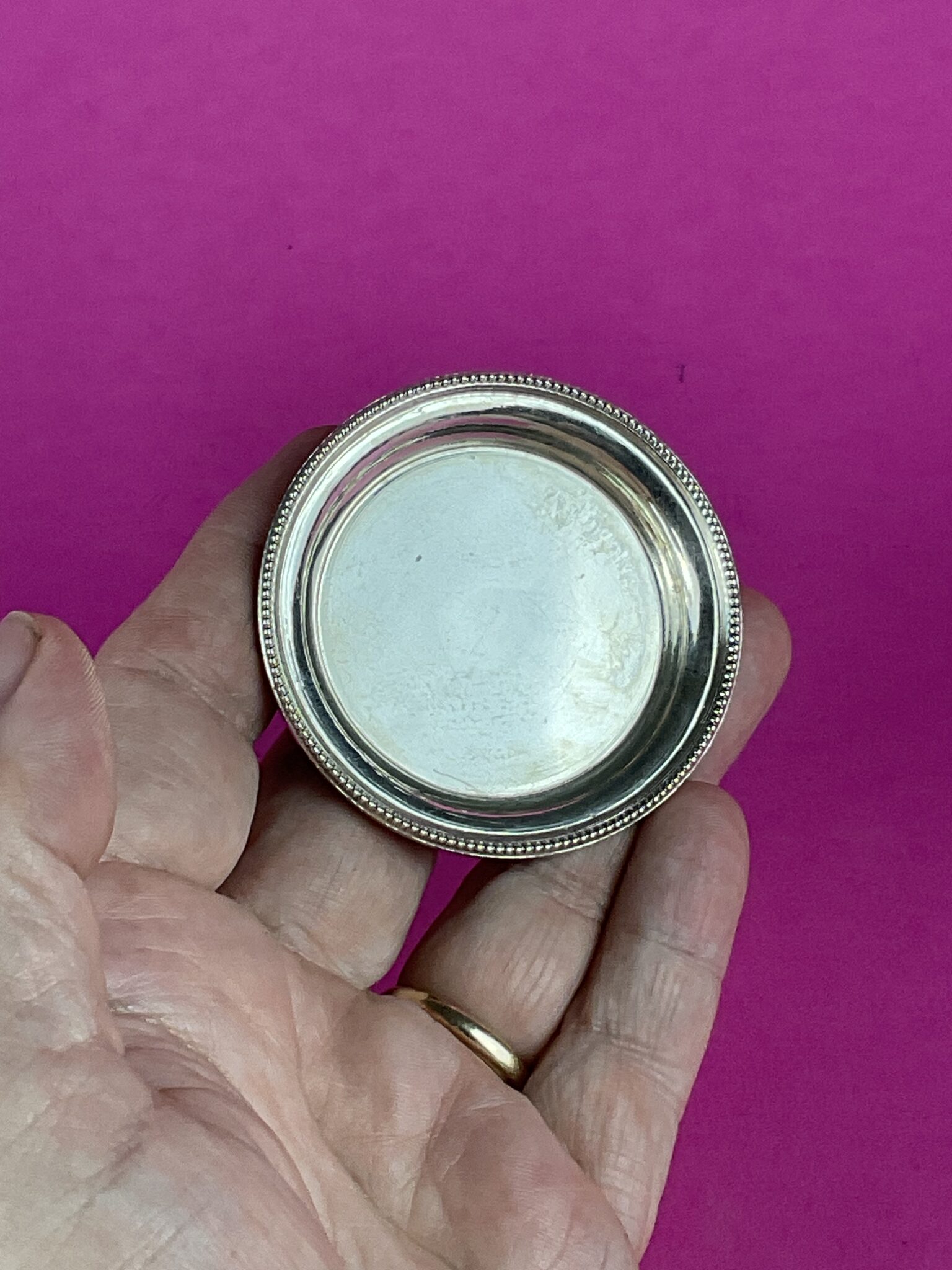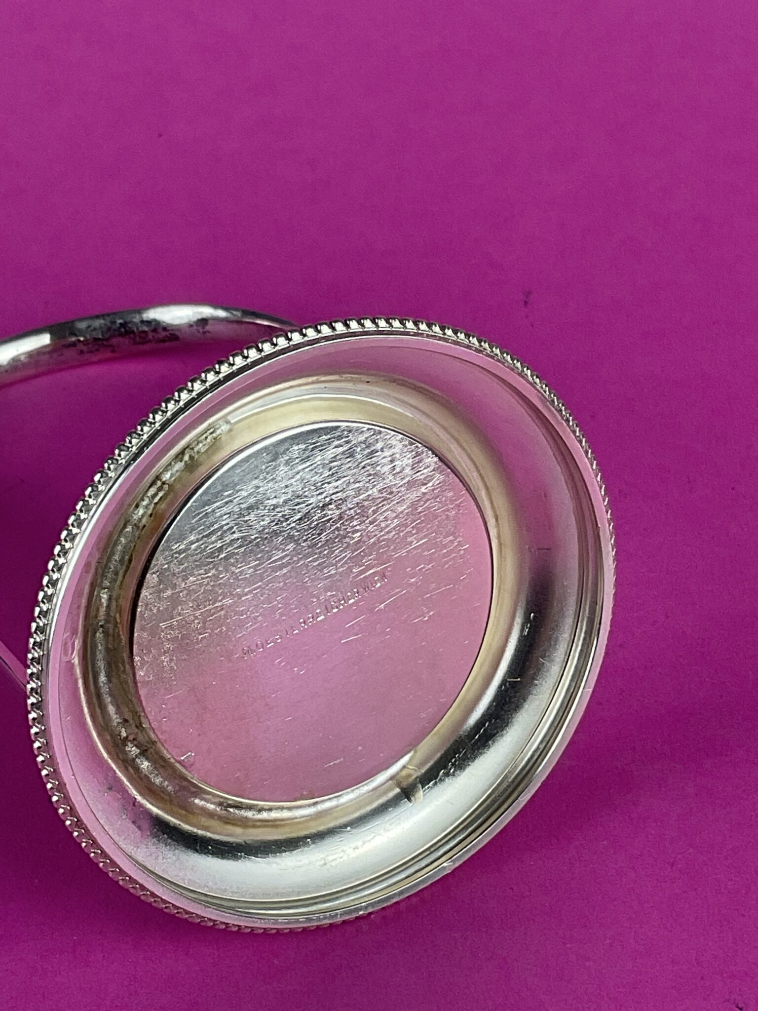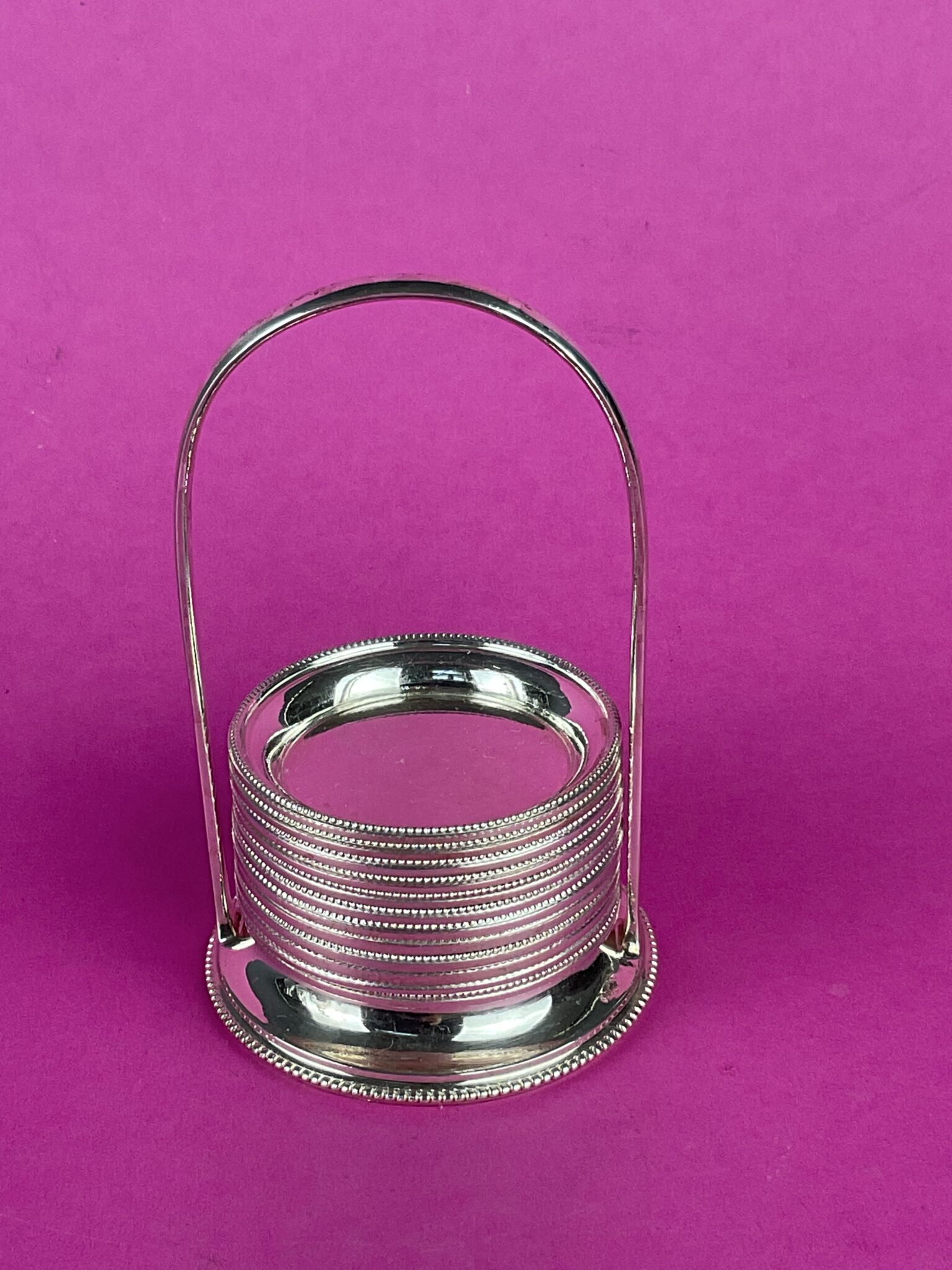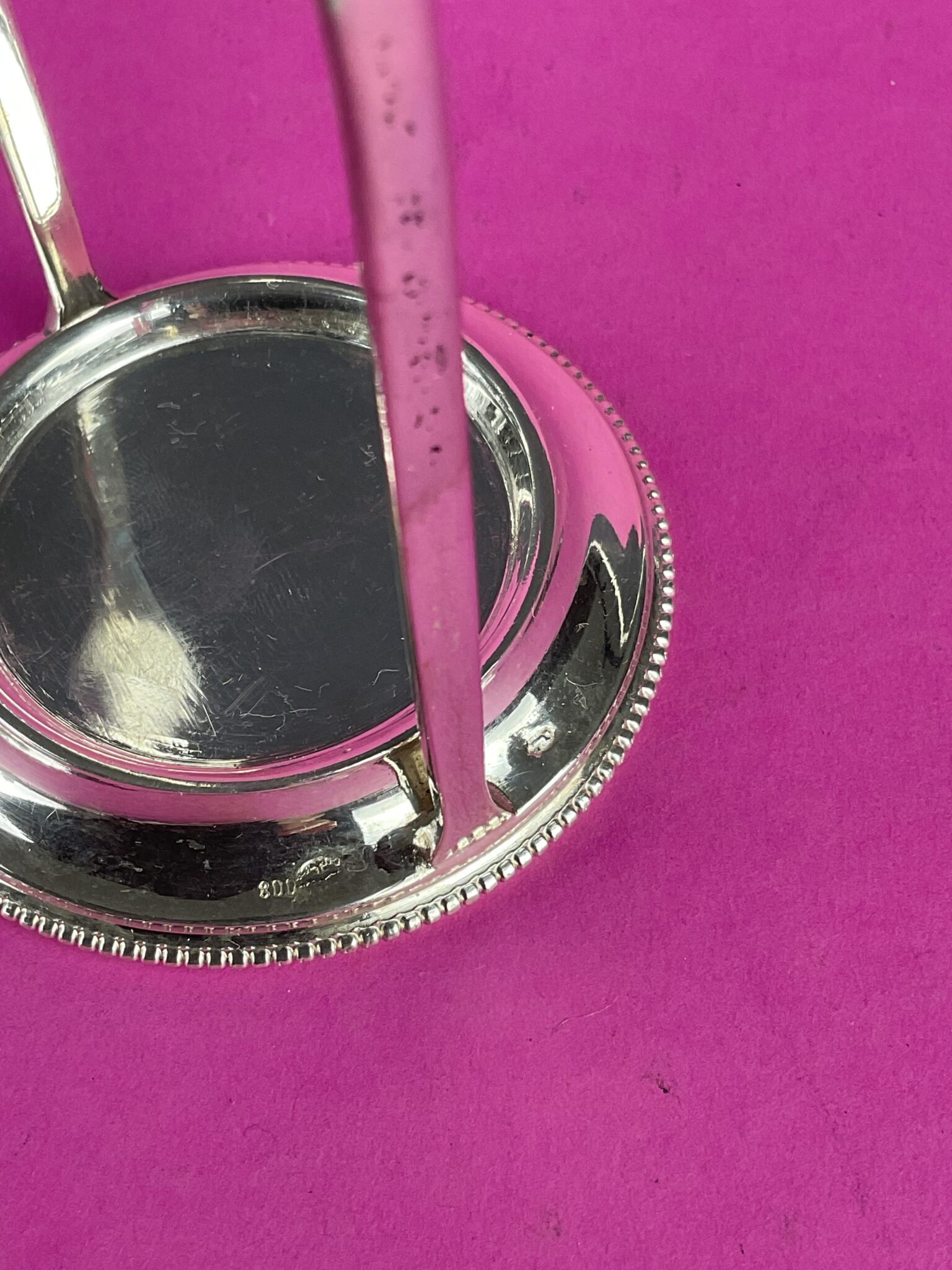 Silber, 12 runde Teller mit umlaufendem Perlrand in Halterung, alle Teile gemarkt mit Wiener Tukankopf nach 1922, Feingehalt 800, Firmenzeichen Moritz Österreicher, tadelloser Erhaltungszustand