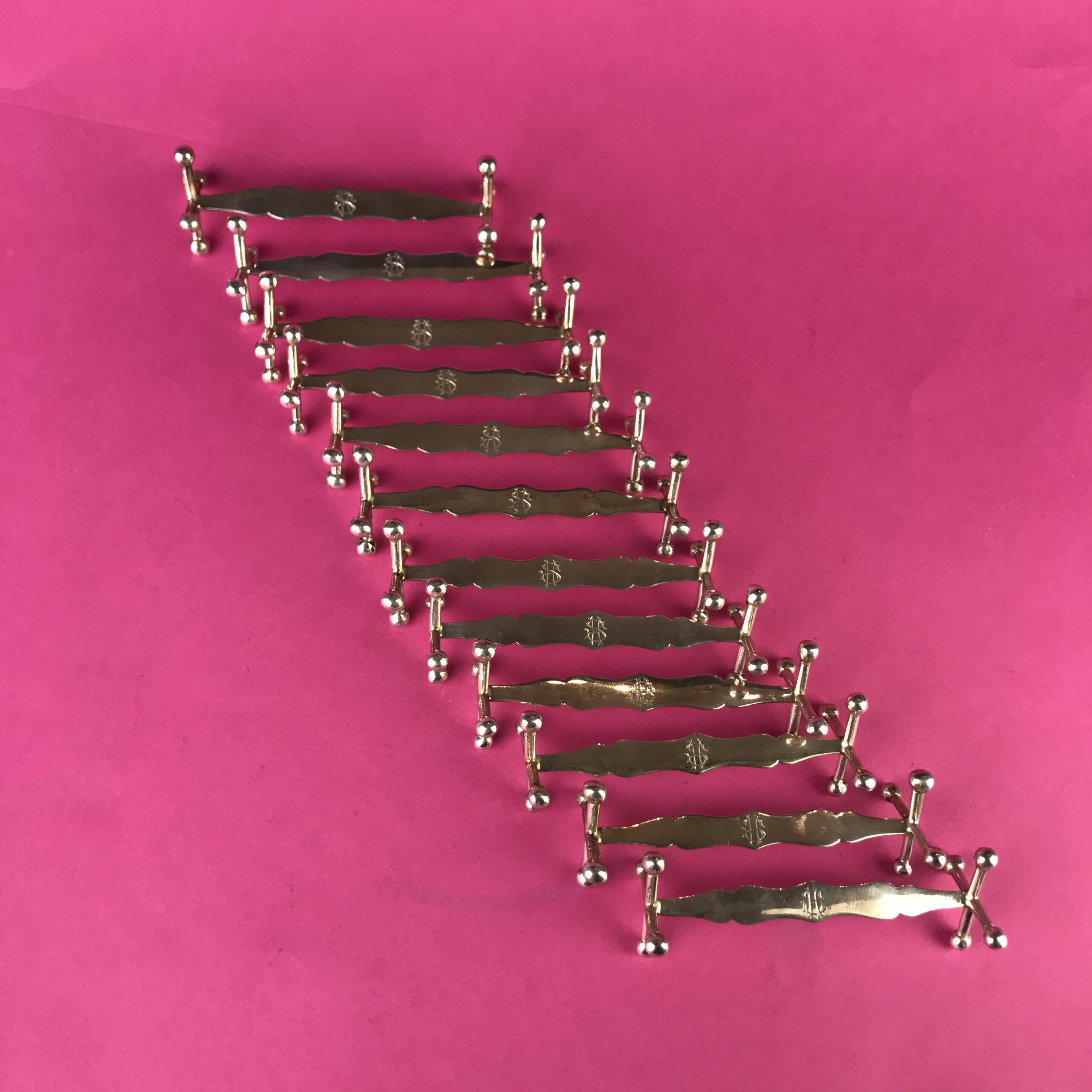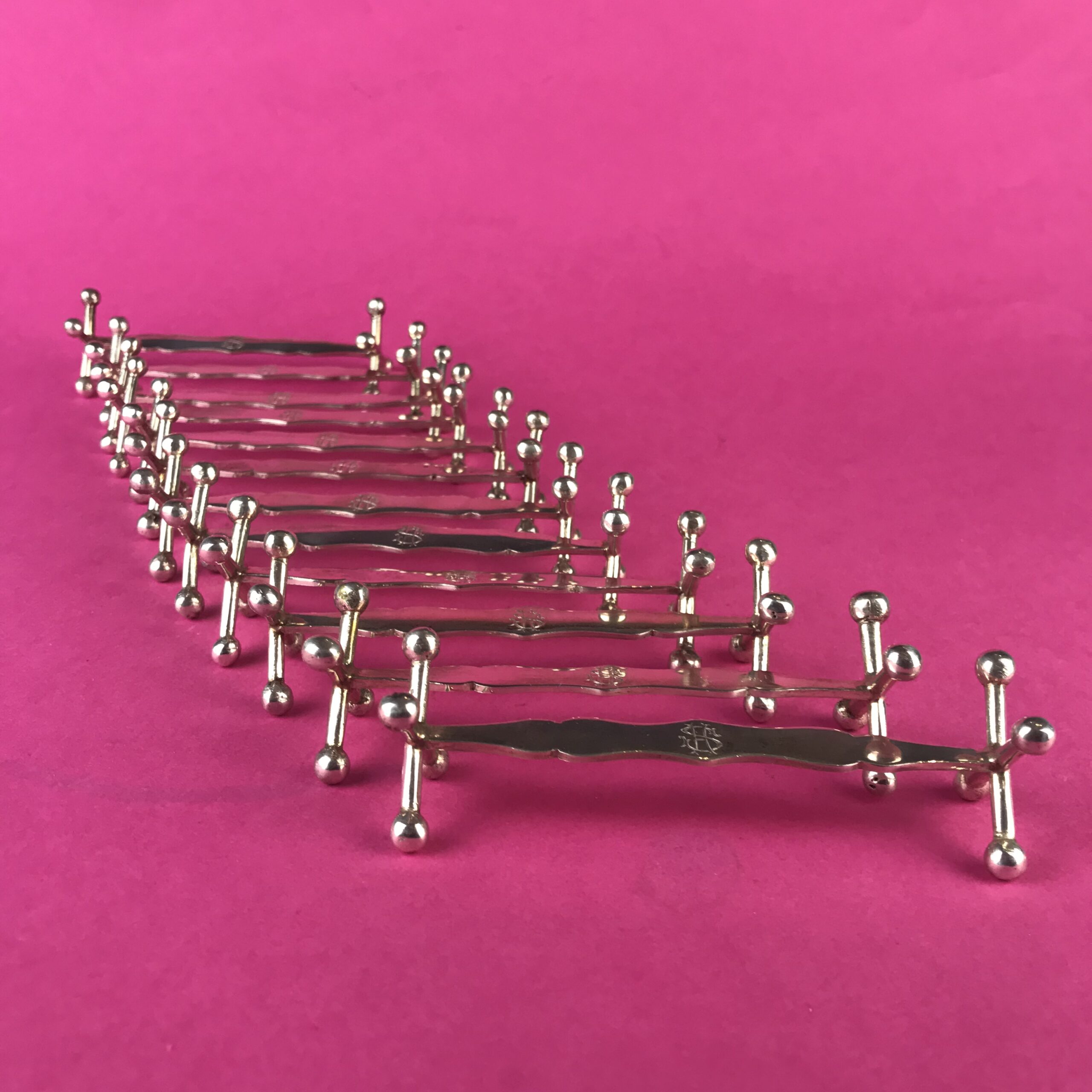 Annettes Etikette: Nicht vergessen: das Messer wird beim Eindecken der Tafel nicht sofort auf die Messerbank gelegt, sondern erst nach Verwendung dort abgelegt, um die Tischdecke nicht zu verschmutzen. Erfunden wurde die Messerbank im saucenreichen Frankreich. Doch auch asiatische Stäbchen können stilvoll abgelegt werden. Ein Satz von 12 identen silbernen Messerbänken ist eher selten.