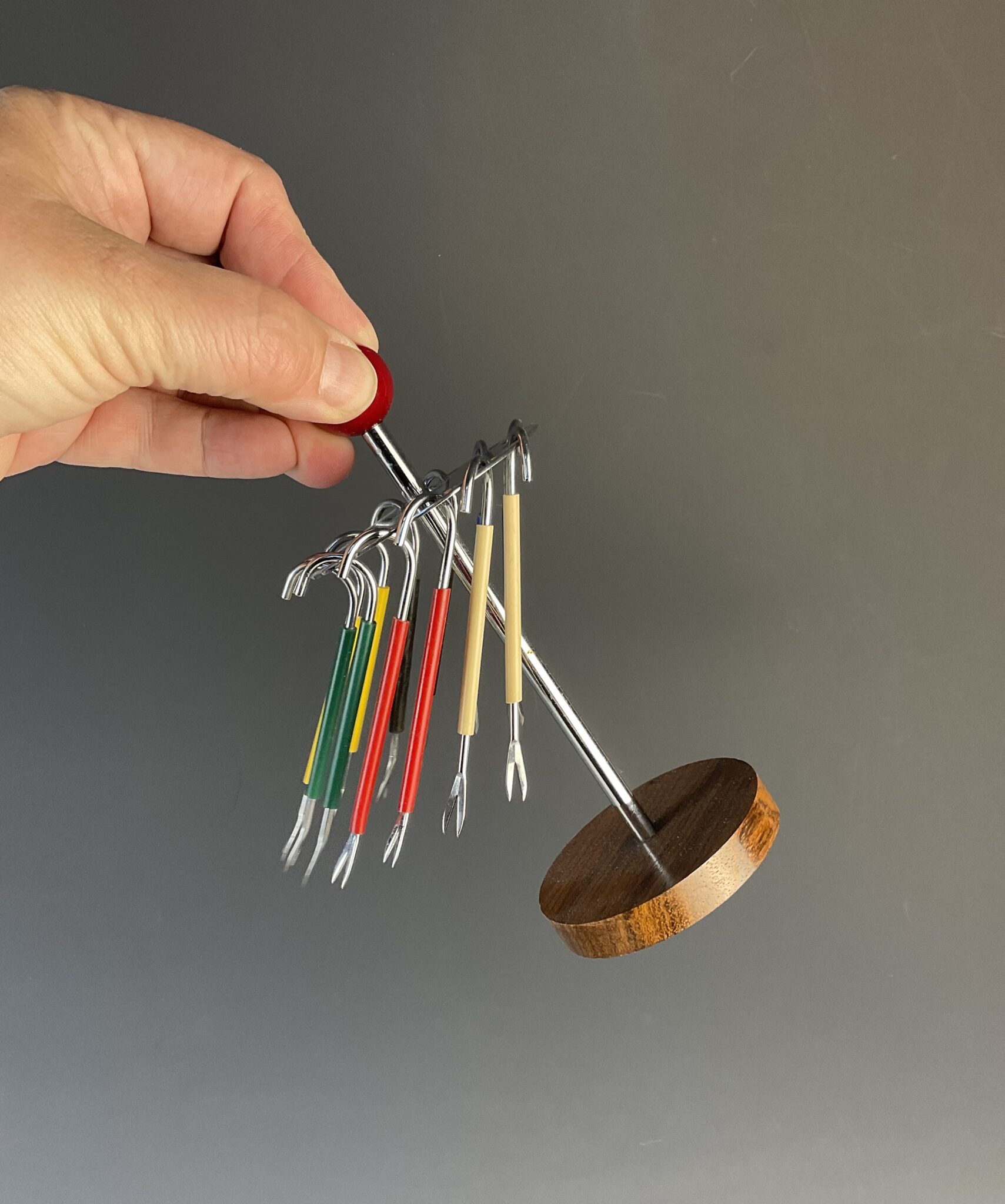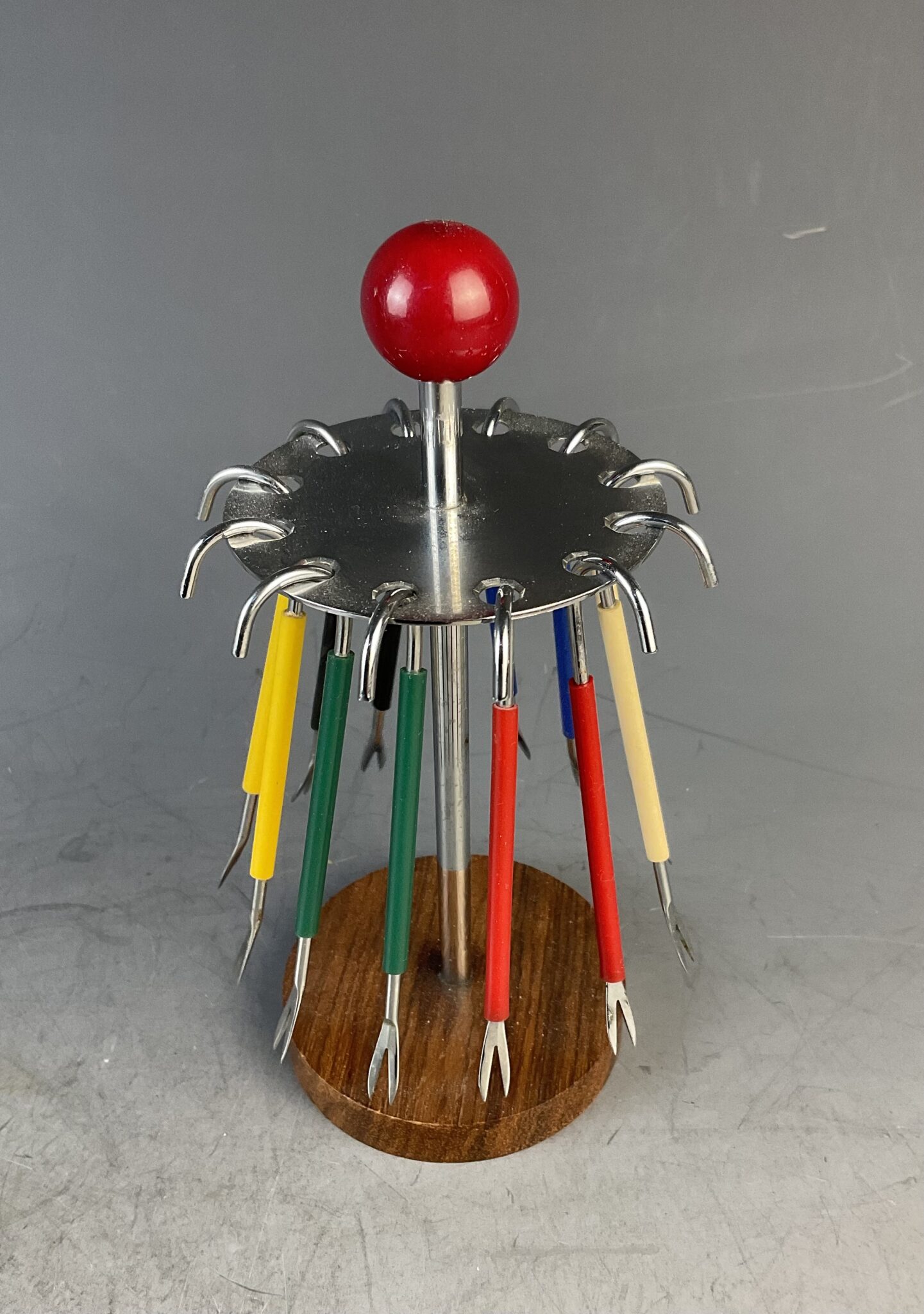 Chrom, poliert, runder Teakholz-Sockel, verchromter Köcher für 12 Mixed pickle Spiesse, Gummierung in sechs verschiedenen Farben, Abschluß mit roter Bakelit-Kugel, ungemarkt, handpolierter Erhaltungszustand