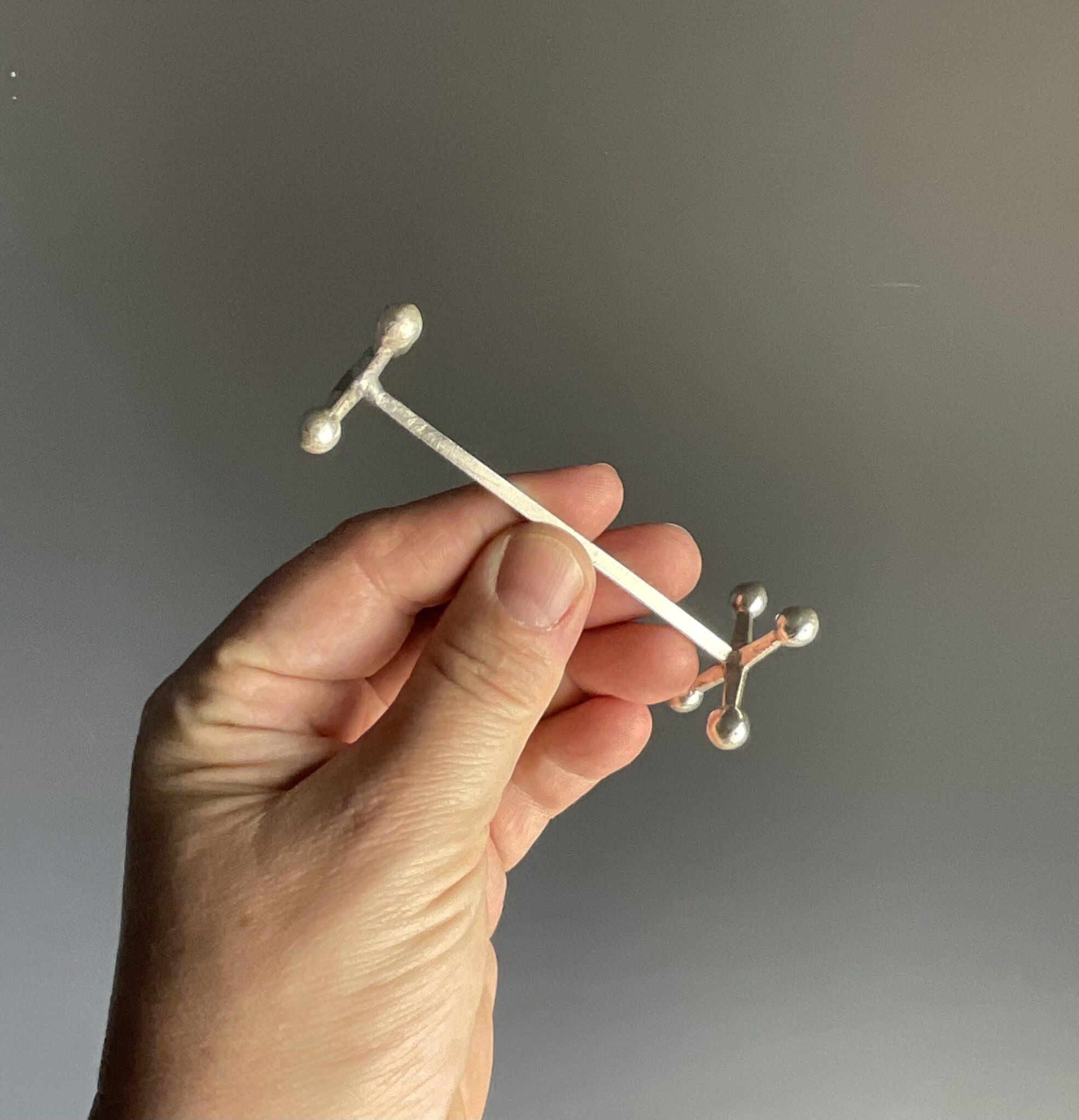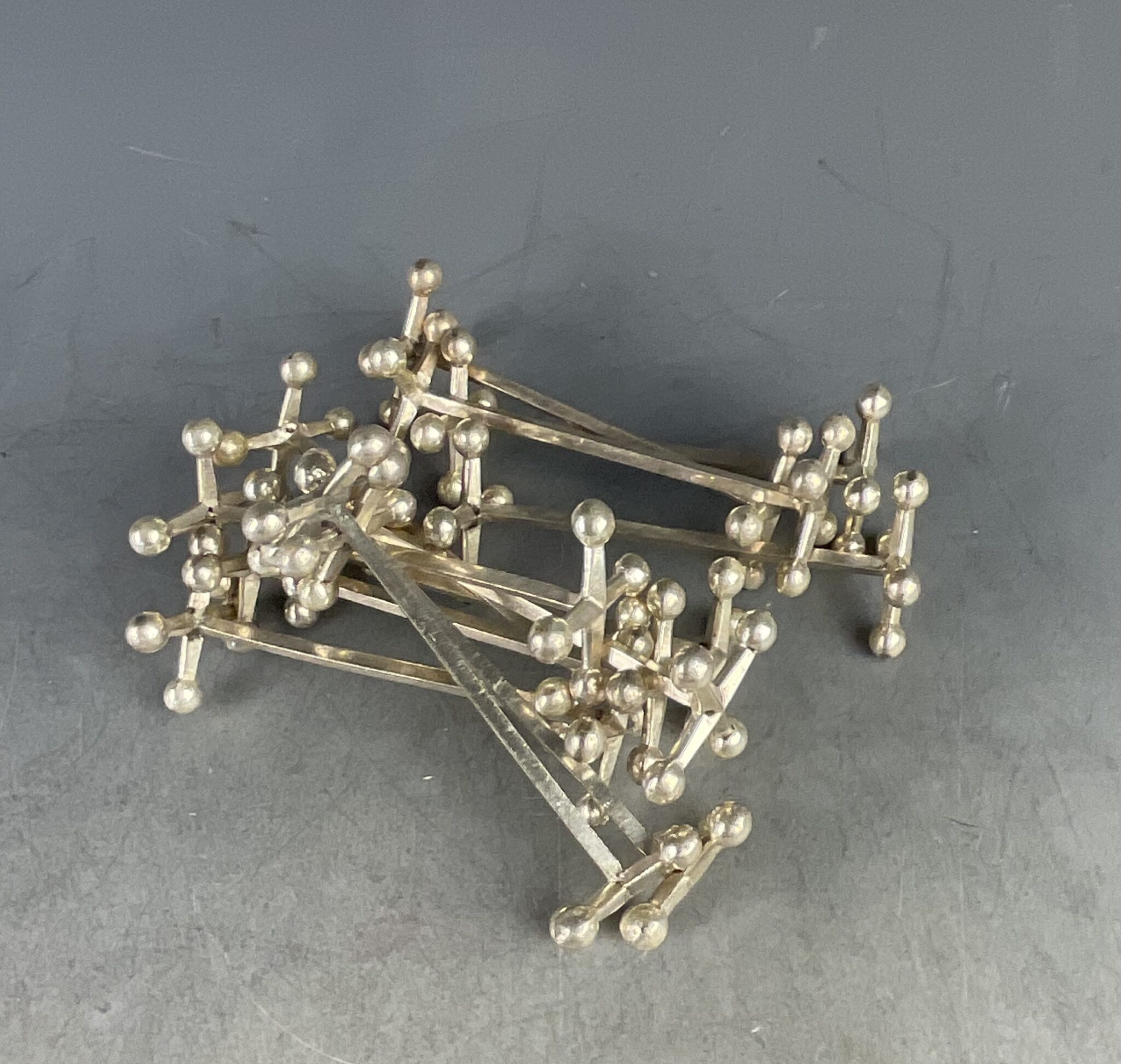 Alpacca, versilbert, kantiger Steg, seitliche Abschlusskugeln, ungemarkt, handpolierter Erhaltungszustand