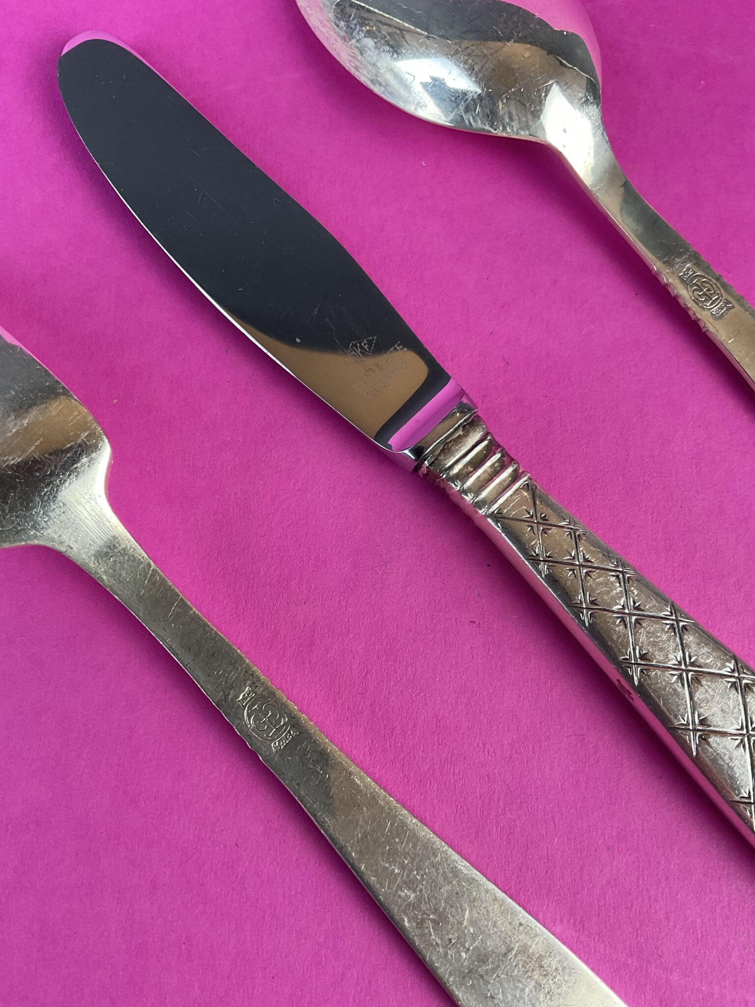 Alpacca, stark versilbert, Heft mit Sternenmotiv, insgesamt 121 Teile, alle gemarkt mit Firmenmarke Finn Christensen und IHQ für Jens Harald Quistgaard, Messer mit rostfreien Klingen, kompletter, handpolierter Zustand (4 Stück mit altersbedingtem Abrieb)