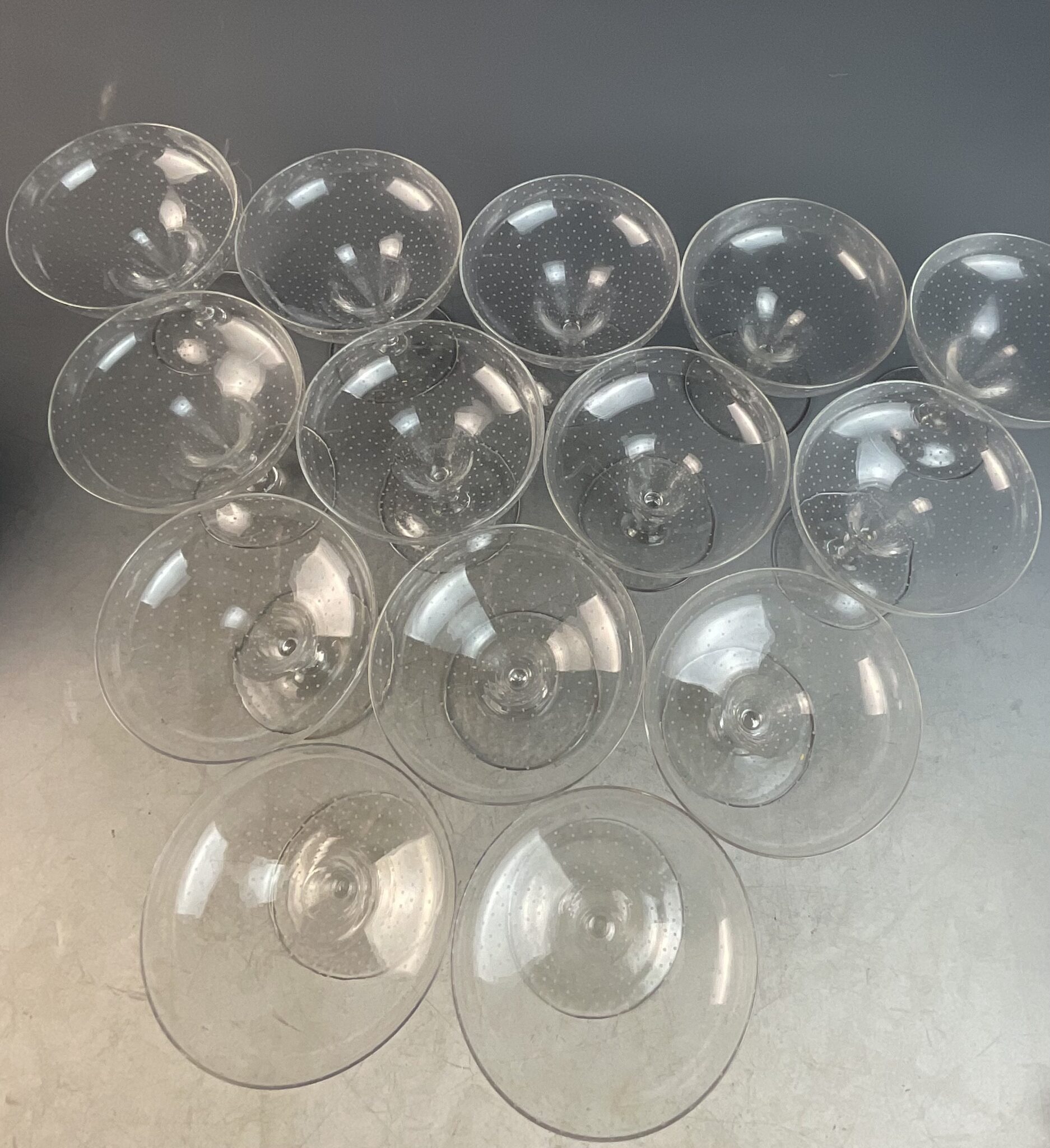 Annettes Etikette: Ich liebe es aus Sektschalen zu trinken, wenngleich der Connaisseur dies nicht so gerne sieht. Zu schnell sind die mühsam in die Flasche gezauberten Bubbles wieder weg. Dennoch ist auffallend, dass sich auch die Gäste mit einer Champagnerschale in der Hand ganz anders benehmen. Hier haben sich besonders hübsche Sektschalen zu 14 Stück erhalten. Ich habe sie gerade aus Paris mitgebracht.