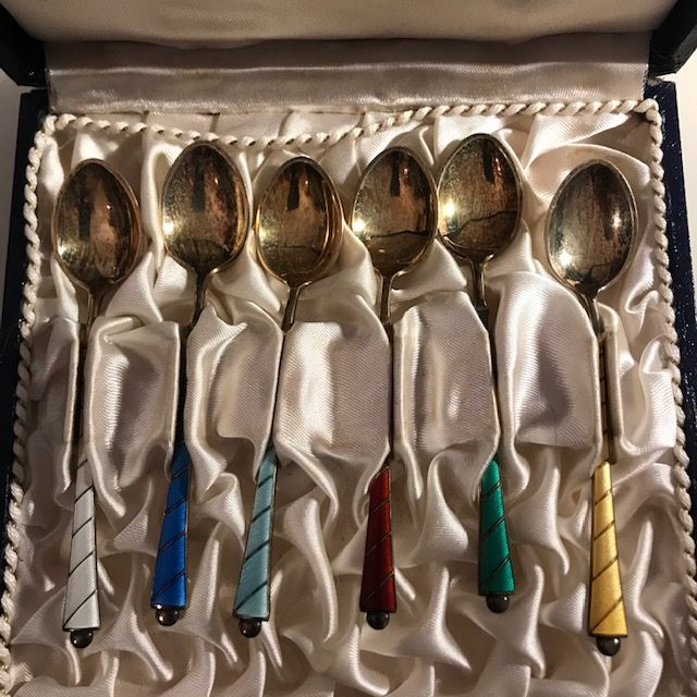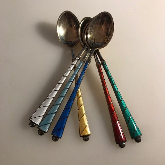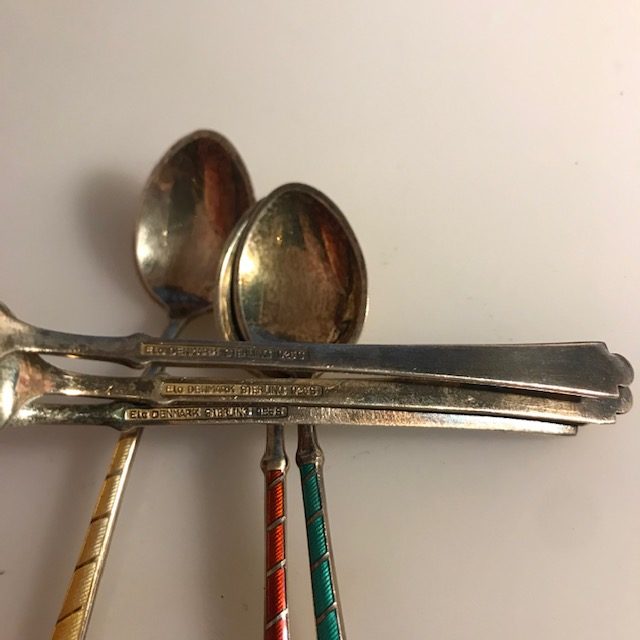 6 silberne Mokkalöffel mit buntem Email