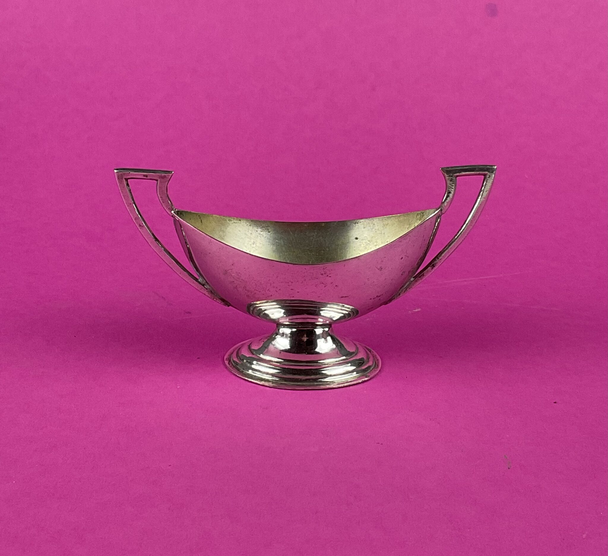Alpacca, versilbert, ovaler Gefäßkörper auf ovalem Fuß, glatte Wandung mit zwei hochgezogenen Henkeln, ungemarkt, handpolierter Zustand