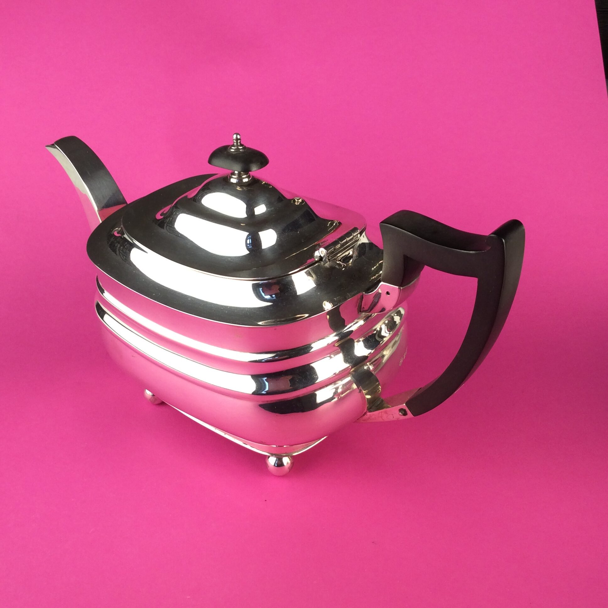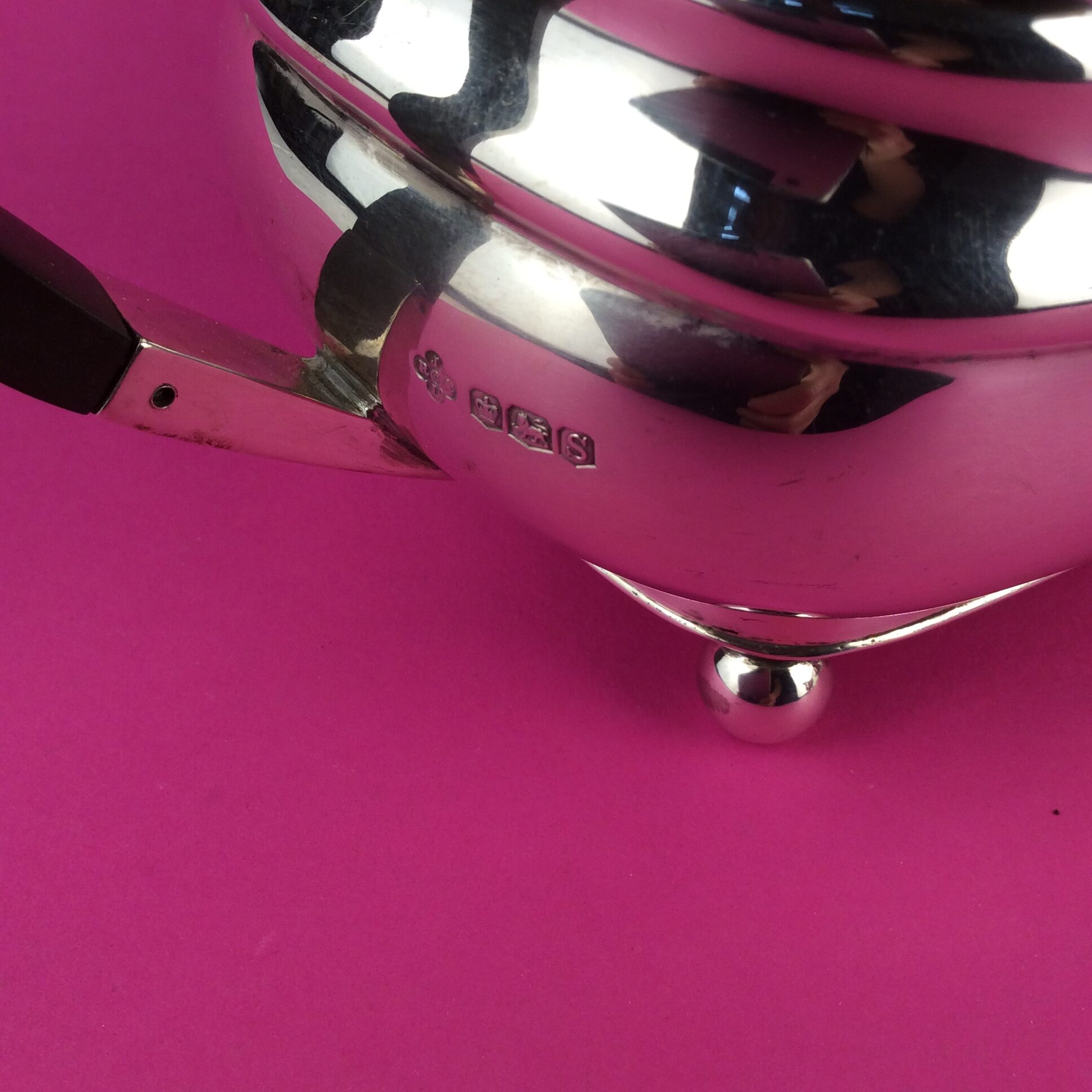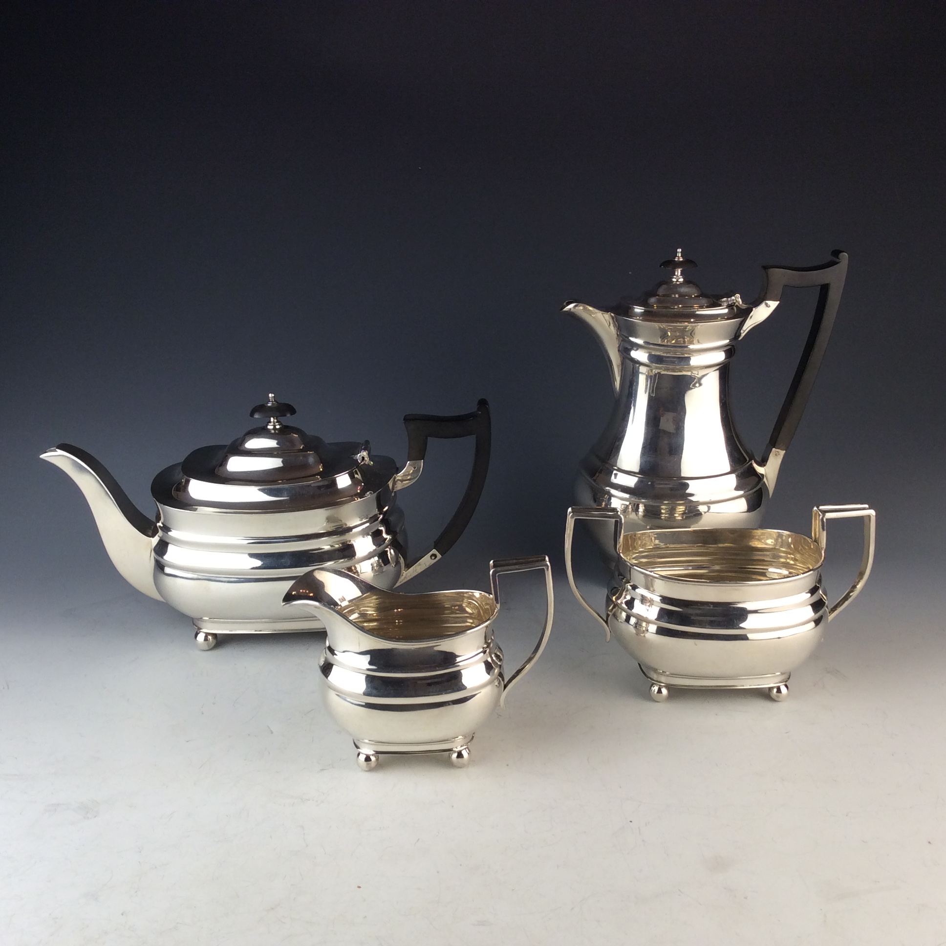 Silber, isolierender Henkel und Knauf aus geschnitztem Ebenholz, ovaler Gefäßkörper auf ovalem Grundriß, Scharnierdeckel; alle Teile gemarkt englischer Feingehaltstempel schreitender Löwe, Stadtmarke Krone für Sheffield, Teekanne, Milchkanne, Zuckerdose Jahresstempel s für 1935, Heisswasserkanne/Kaffeekanne Jahresstempel r für 1937, alle Teile mit Firmenzeichen Jay, Richard Attenborough Co Ltd