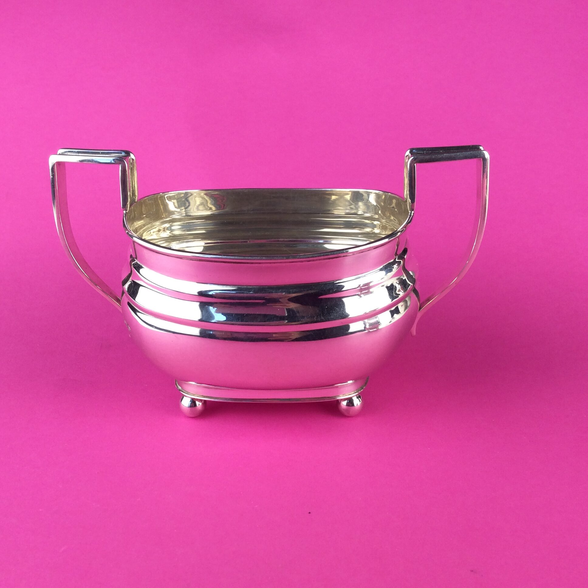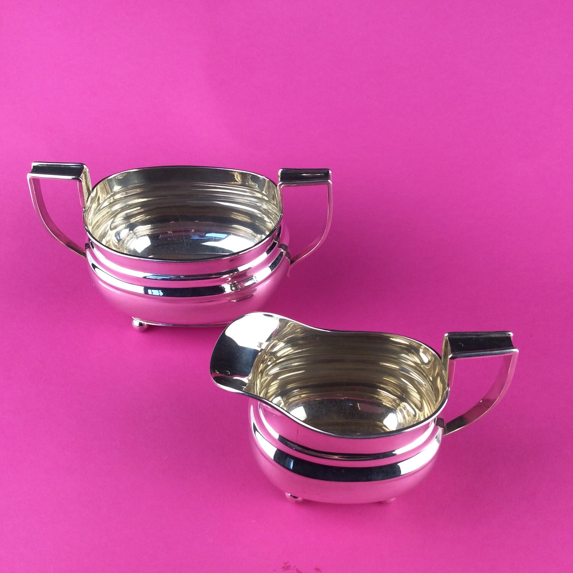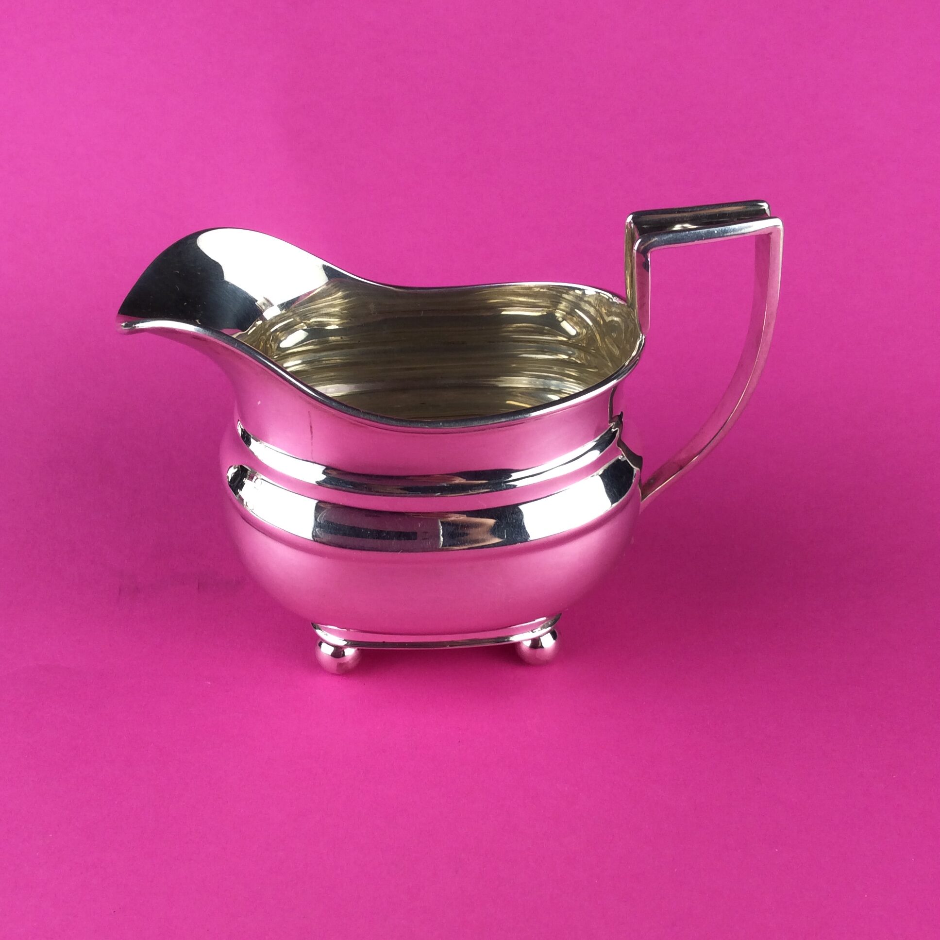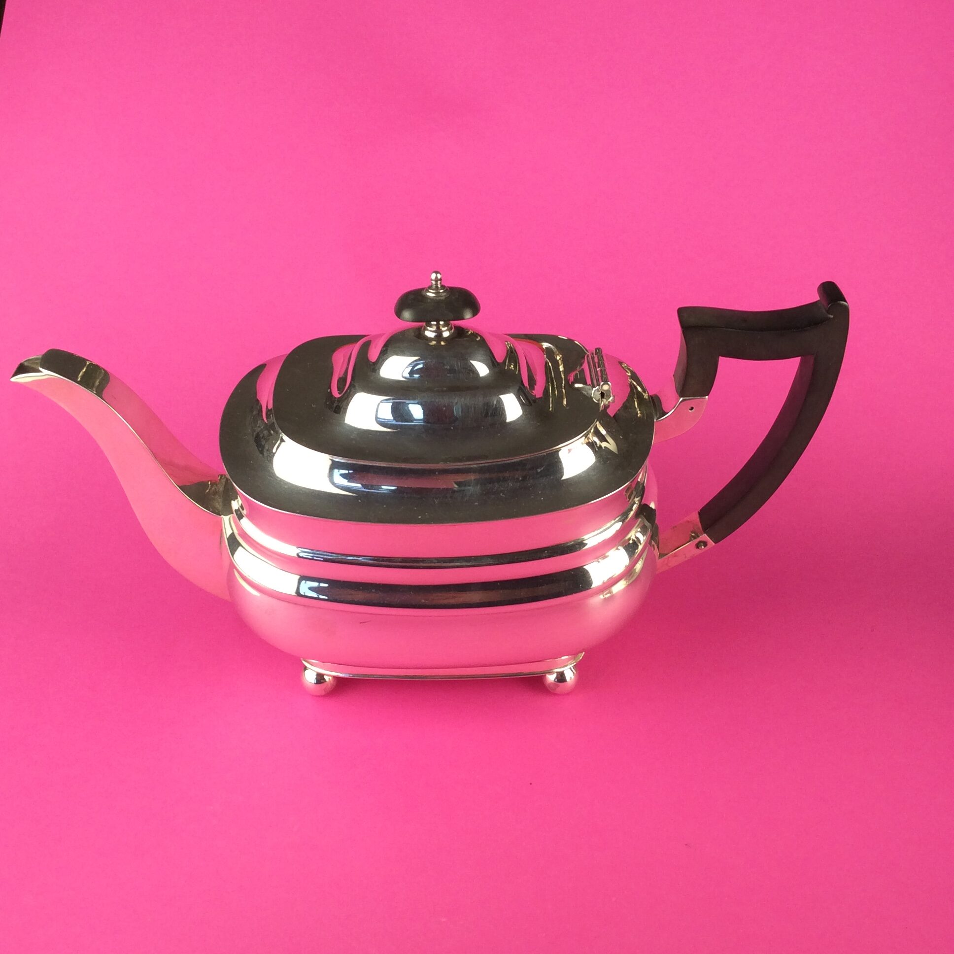 Silber, isolierender Henkel und Knauf aus geschnitztem Ebenholz, ovaler Gefäßkörper auf ovalem Grundriß, Scharnierdeckel; alle Teile gemarkt englischer Feingehaltstempel schreitender Löwe, Stadtmarke Krone für Sheffield, Teekanne, Milchkanne, Zuckerdose Jahresstempel s für 1935, Heisswasserkanne/Kaffeekanne Jahresstempel r für 1937, alle Teile mit Firmenzeichen Jay, Richard Attenborough Co Ltd