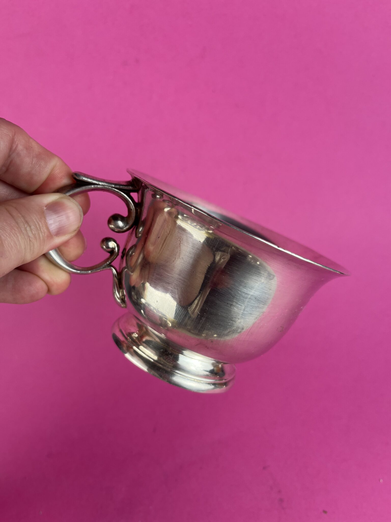 Alpacca, versilbert, runder Fuß, gebauchte Kuppa, runder Henkel mit Daumenrast, am Boden gemarkt mit runder Berndorf-Marke, tadelloser Erhaltungszustand