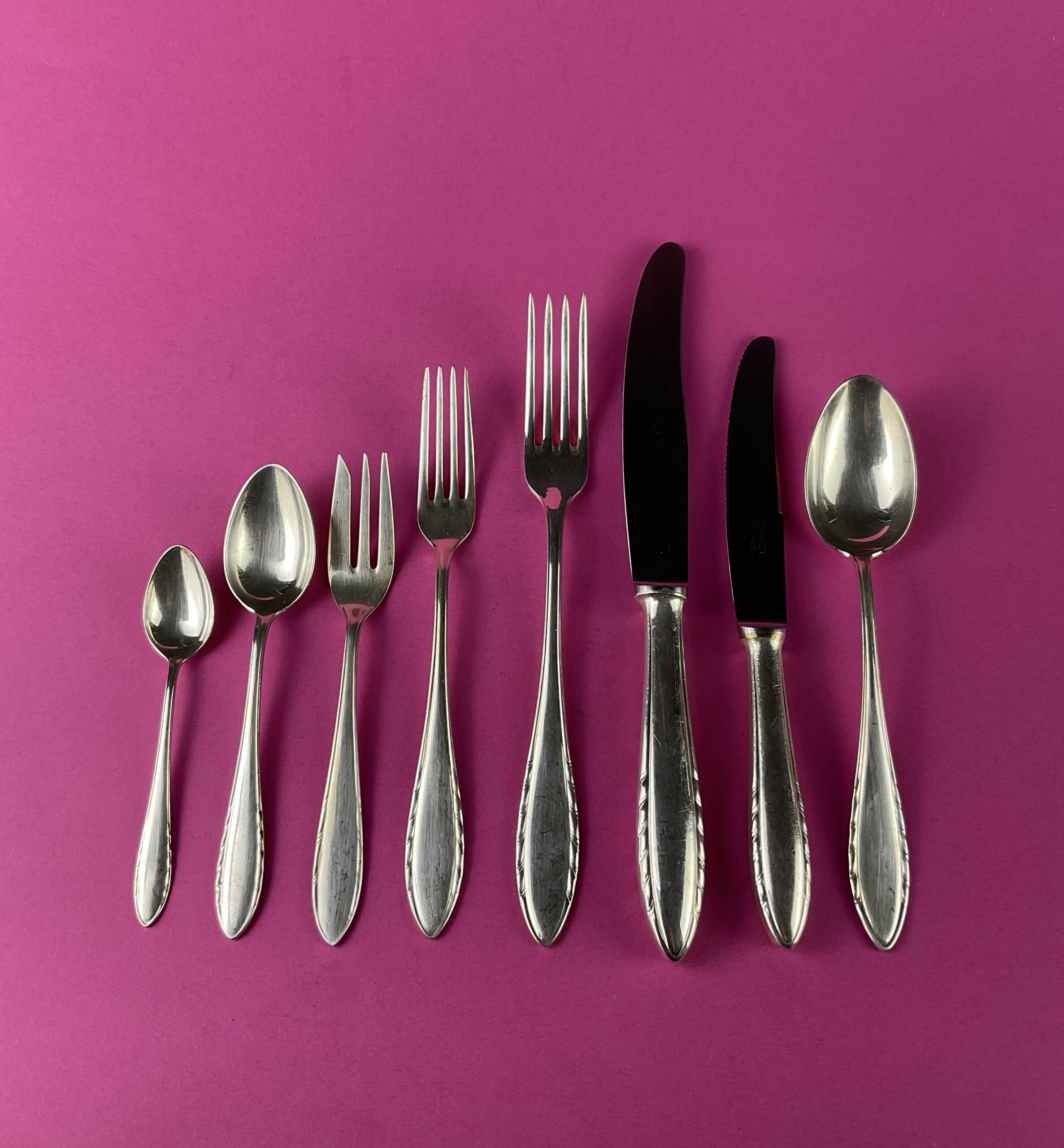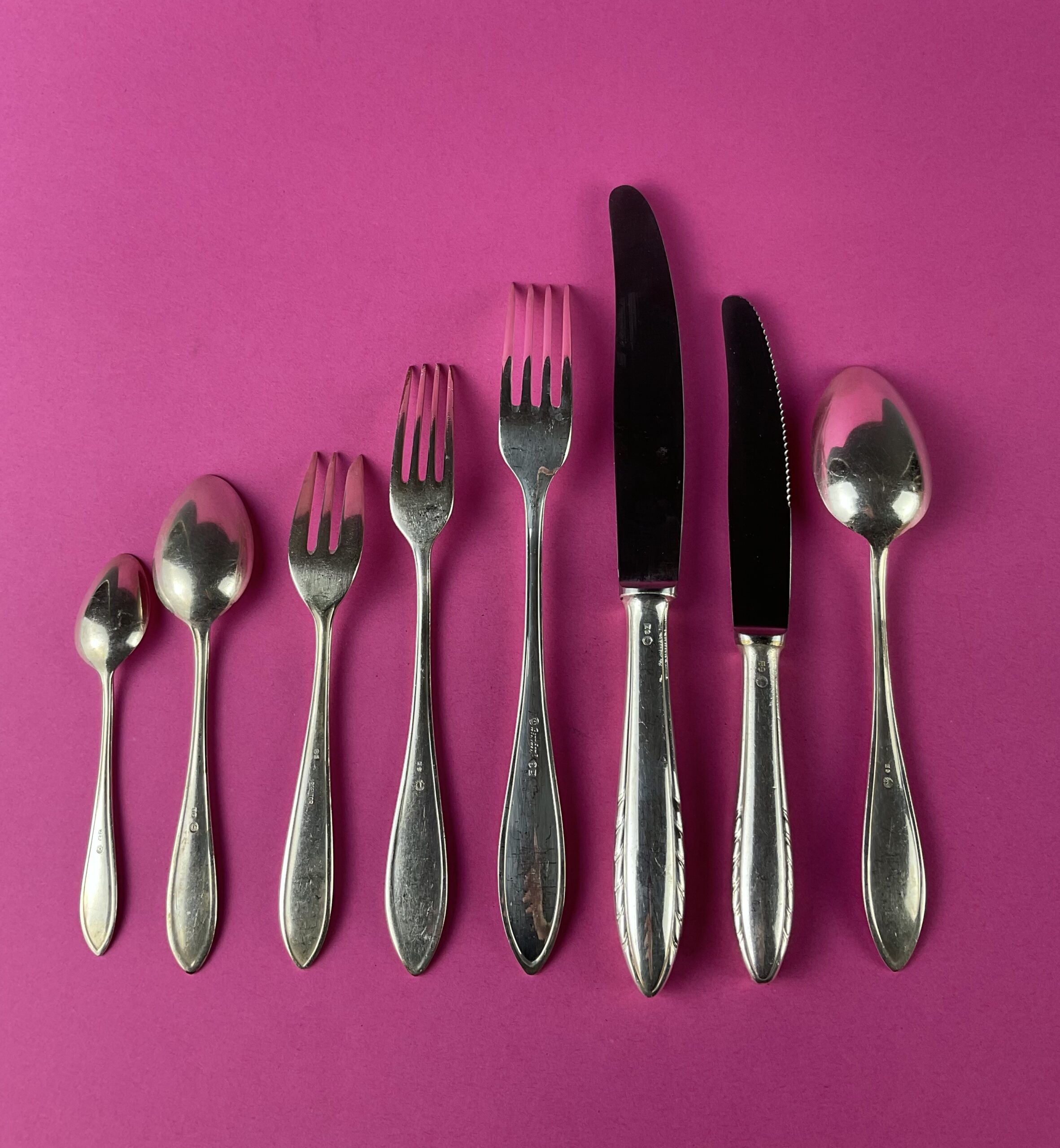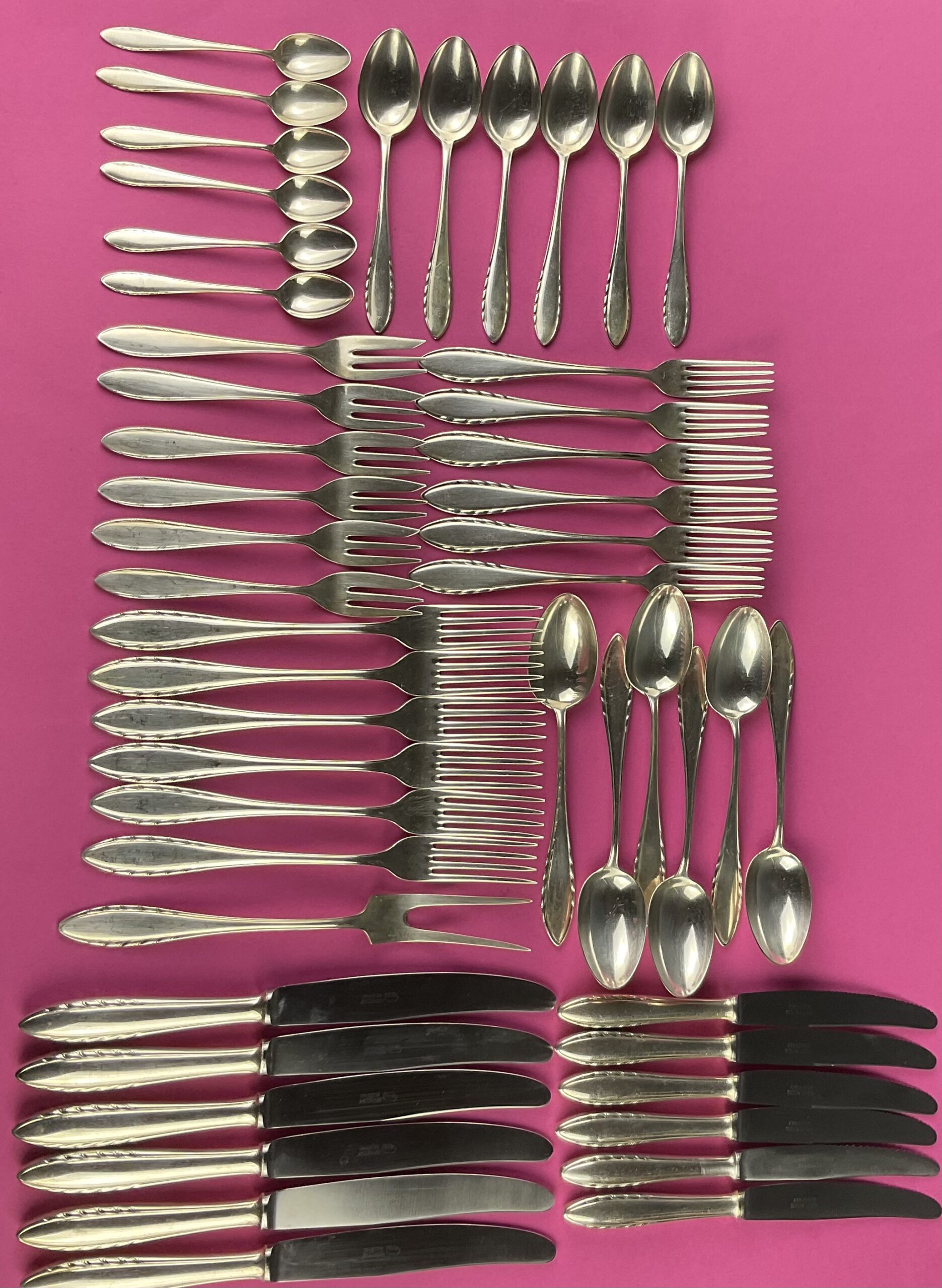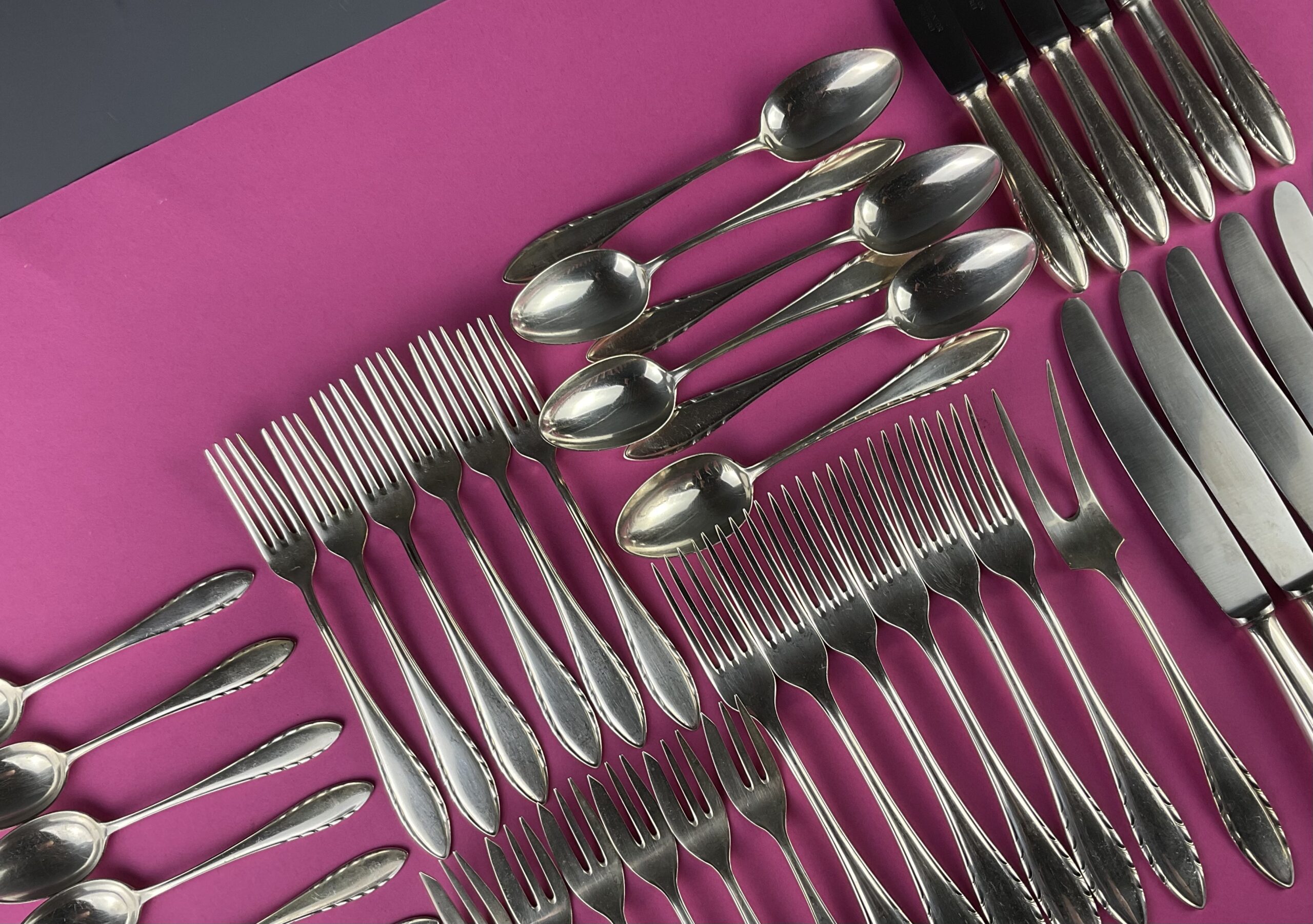 Alpacca, stark versilbert; bestehend aus 49 Teilen; Facon „200“, alle Teile gemarkt mit rundem Firmenzeichen „Berndorf“ verwendet um 1930, alle Messer mit rostfreien Stahl-Klingen;