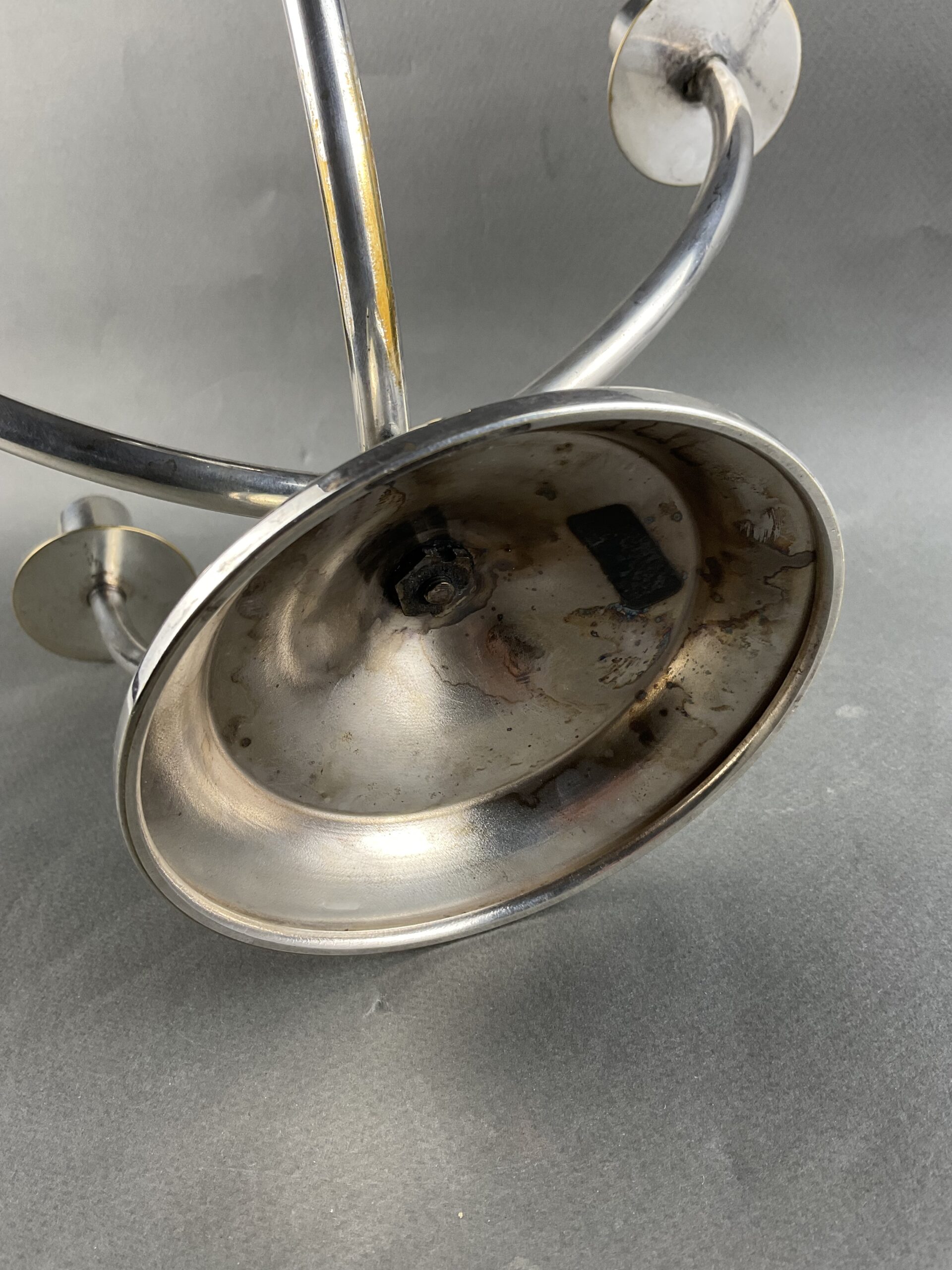 Alpacca, versilbert, runder Fuss mit fünf Armen und Tüllen, Tropftasse, schwarzer Bakelitknauf, gemarkt ARGENTOR, minimale Gebrauchsspuren wie Abrieb