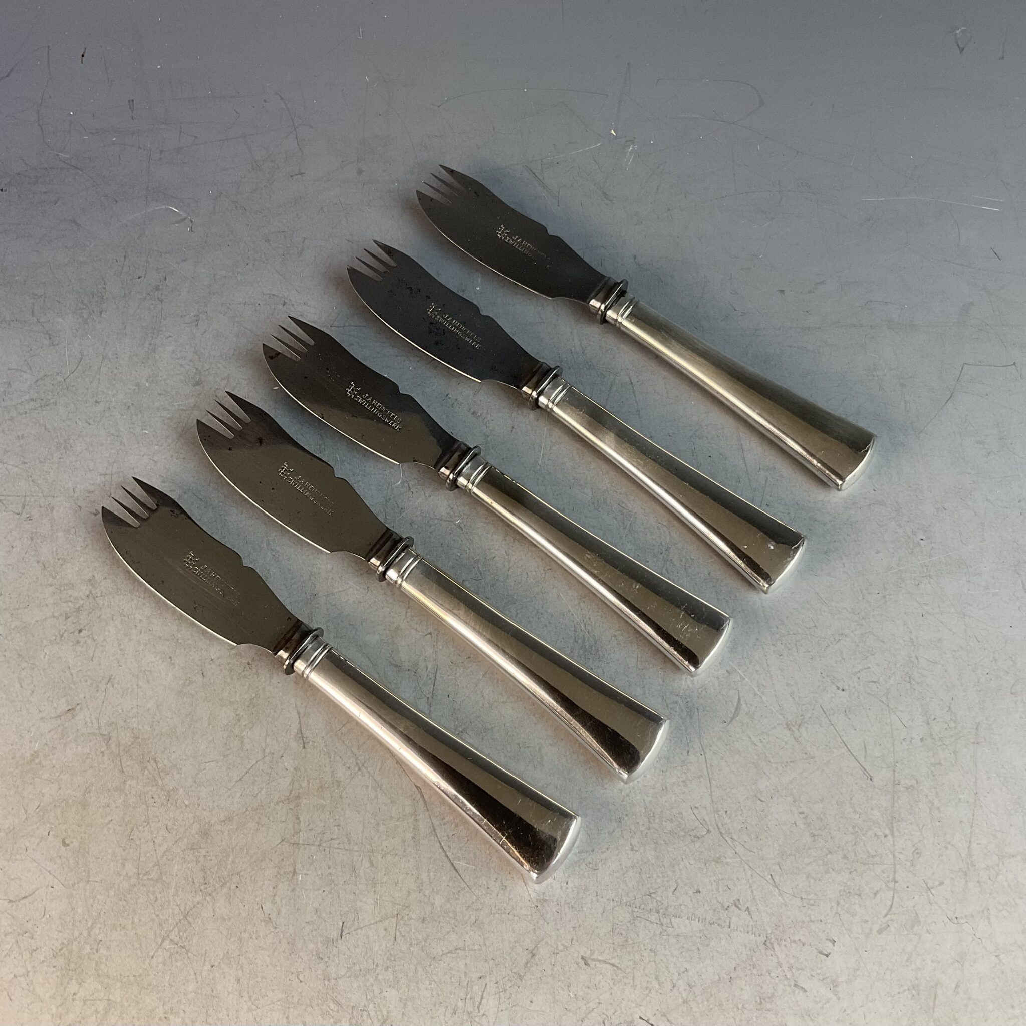 Alpacca, versilbert, 5 Hohlhefte, aufgesetzte dreizinkige Gabeln, gemarkt mit Herstellermarke J.A. HENCKELS ZWILLINGSWERK , handpolierter Zustand