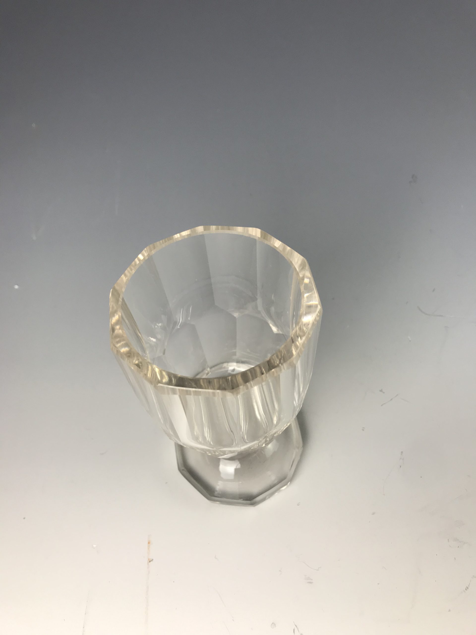 farbloses Glas, kantiger Fuss, gerader Schaft, bauchige Kuppa mit Schälschliff, Keileckenschliff, Gebrauchspuren wie Kratzer jedoch kein Chip