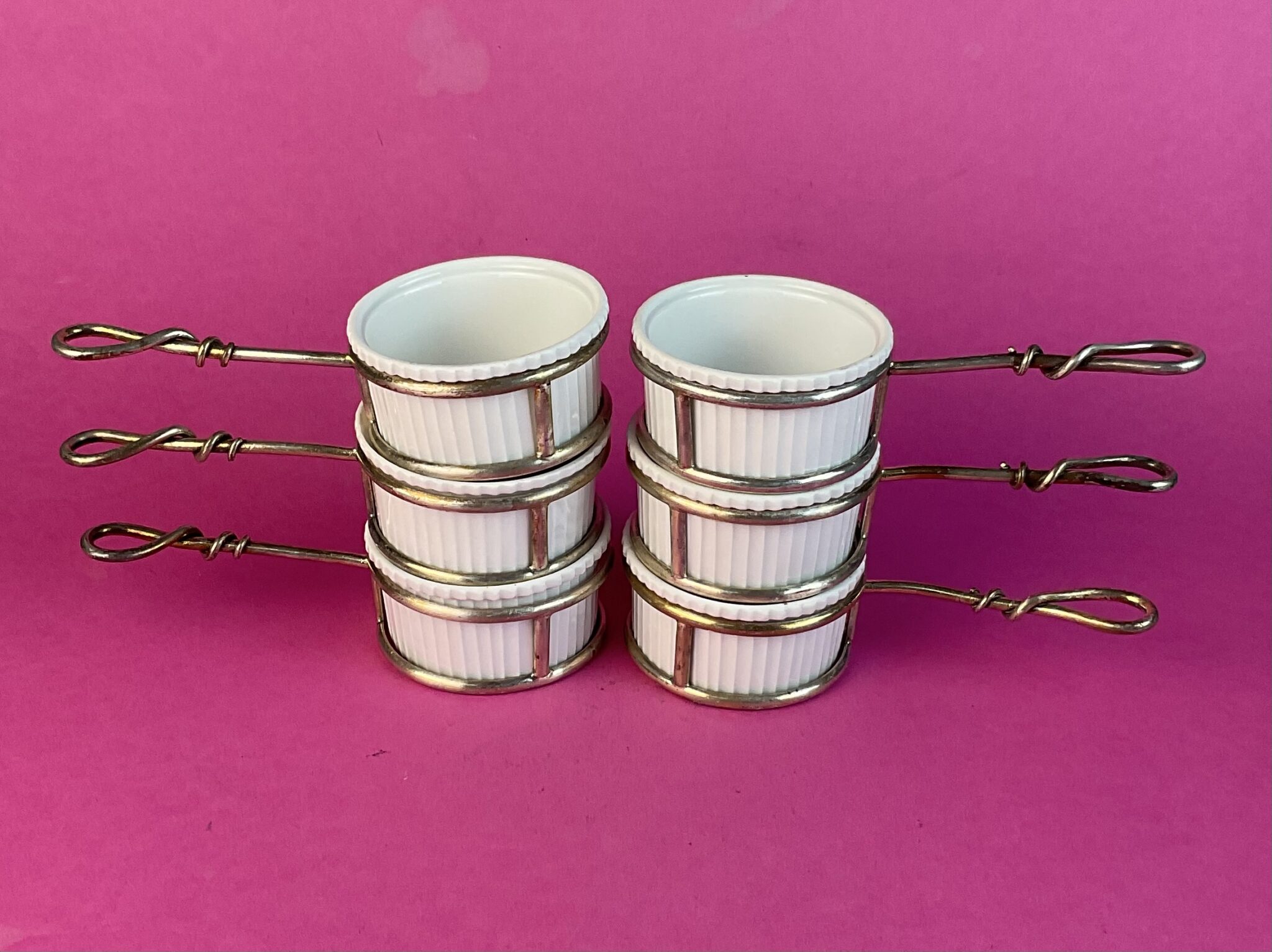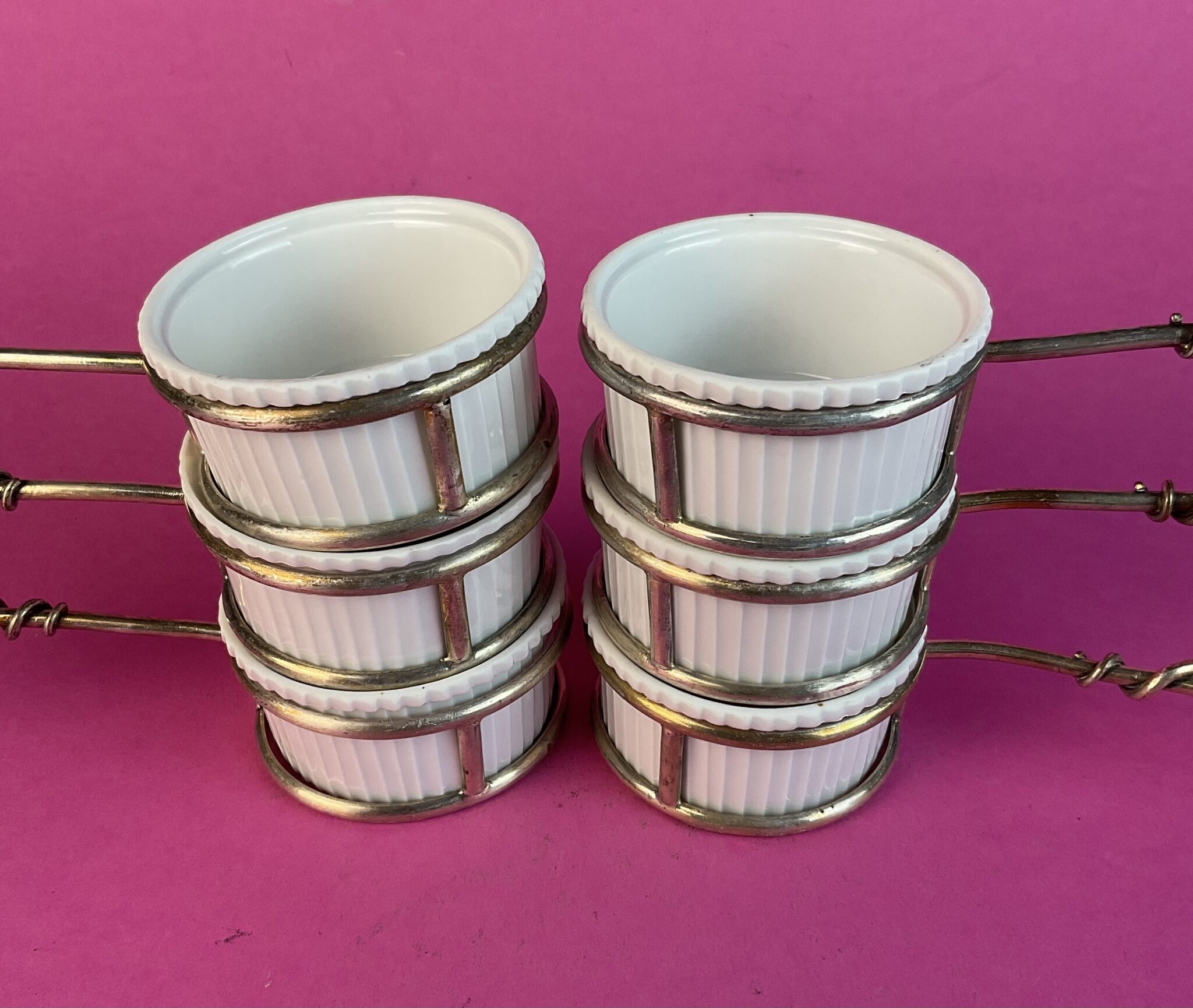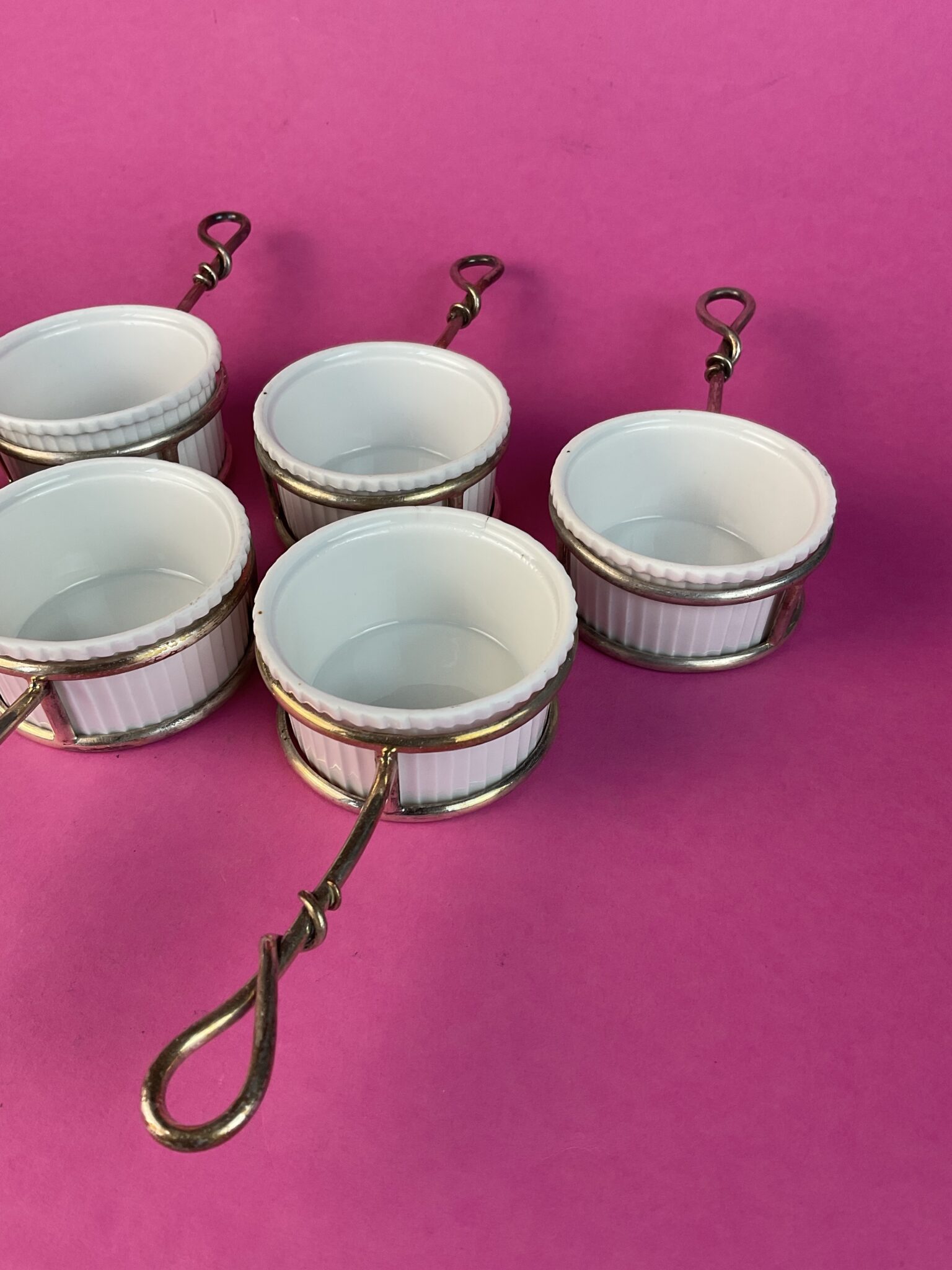körbchenartige Halterung mit Griff aus Alpacca, stark versilbert, ungemarkt, Hitzebeständige, runde Auflauf-Förmchen aus weissem Porzellan, gemarkt Rosenthal KRONACH BAVARIA, minimale Gebrauchsspuren