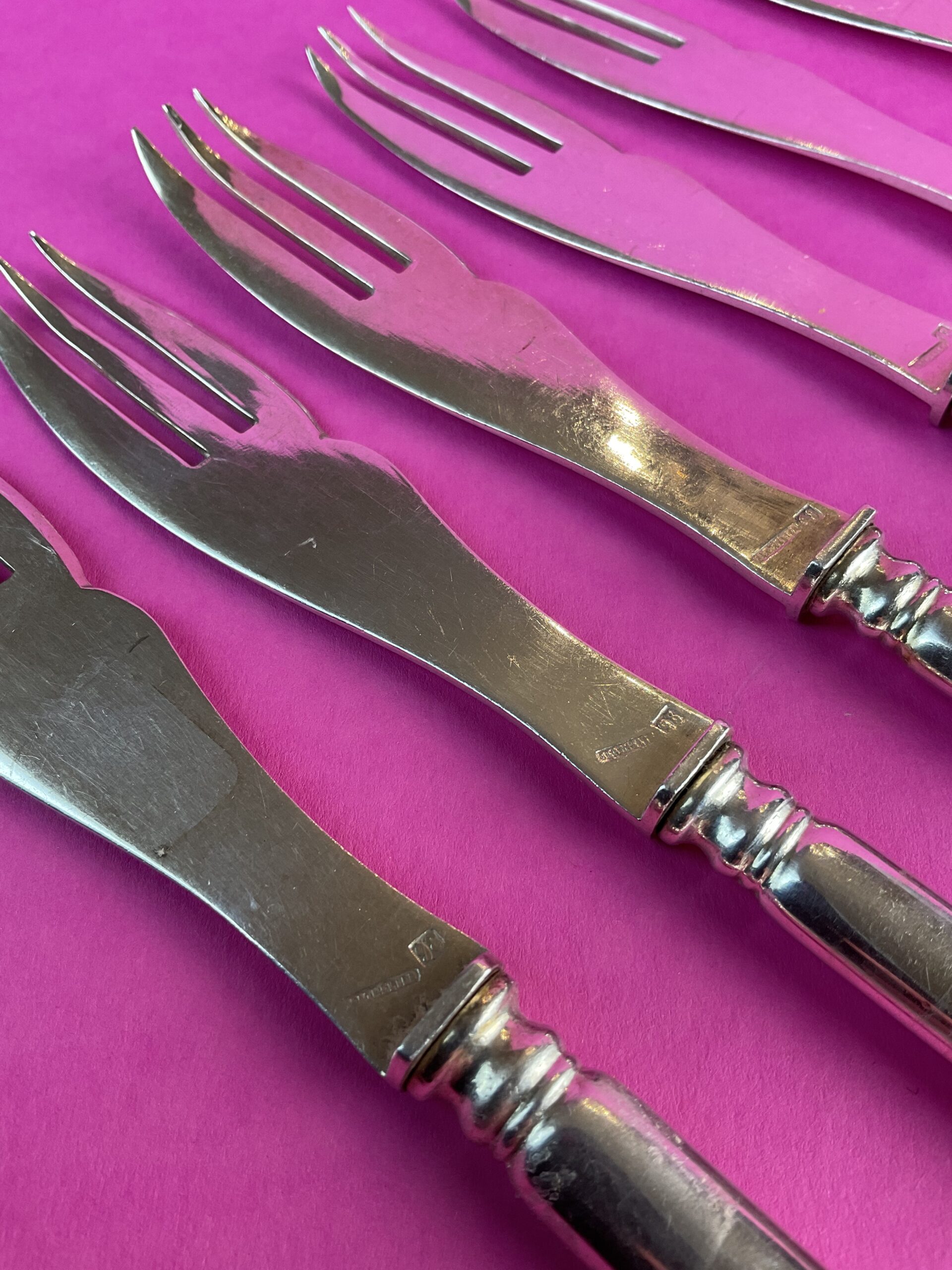 Alpacca, versilbert, 6 Hohlhefte Modell „Eselsrücken“ oder „Baguette“, aufgesetzte dreizinkige Gabeln, gemarkt mit Herstellermarke BERTHELIER und 98 im Quadrat, handpolierter Zustand