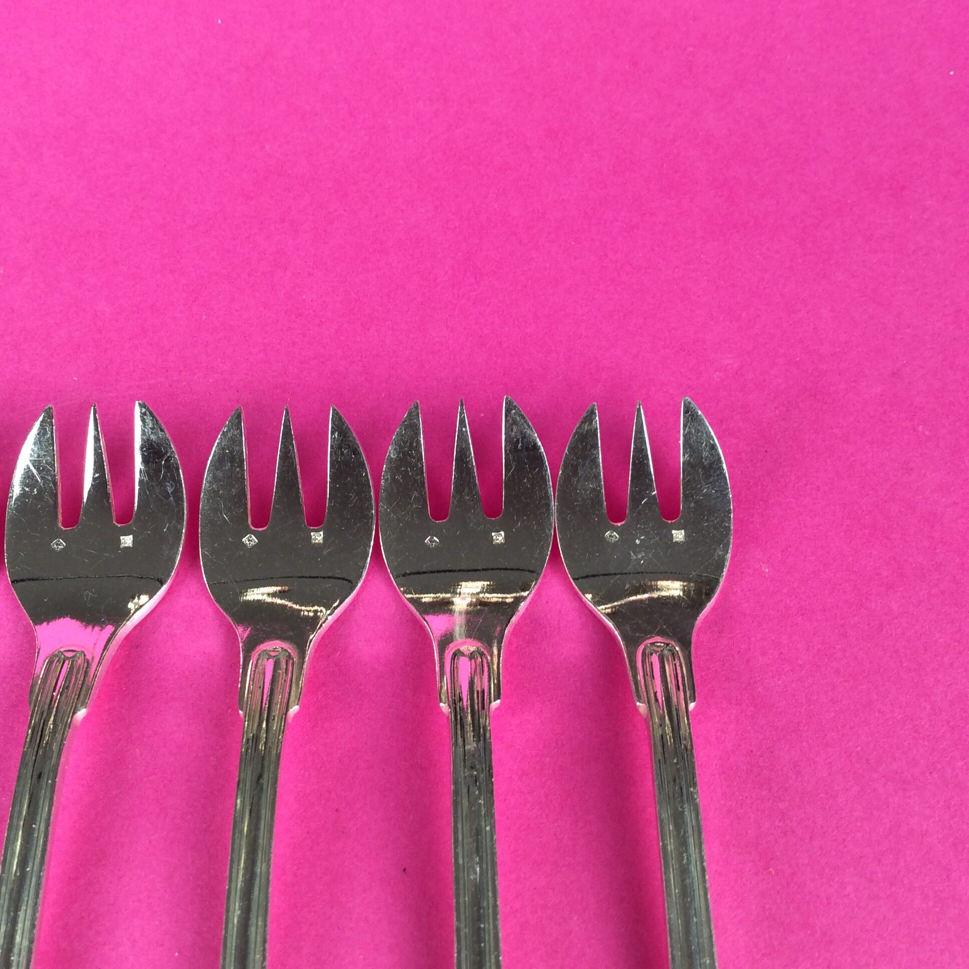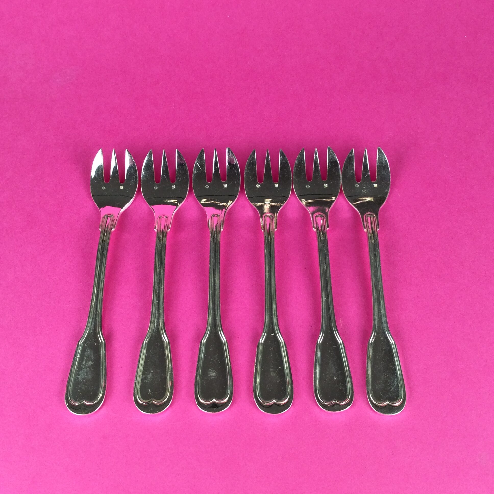 6 versilberte Austerngabeln „Augsburger Faden“, Frankreich, um 1900