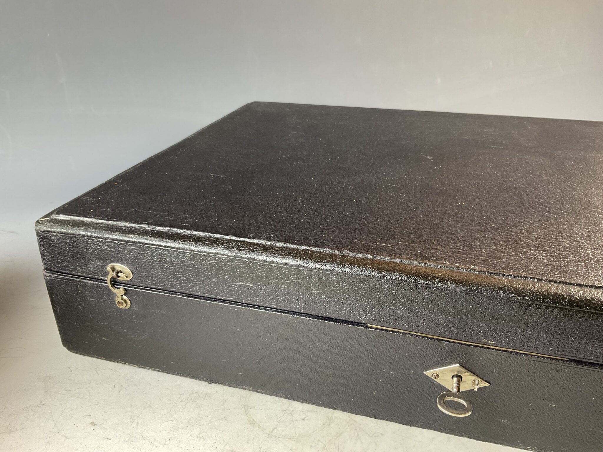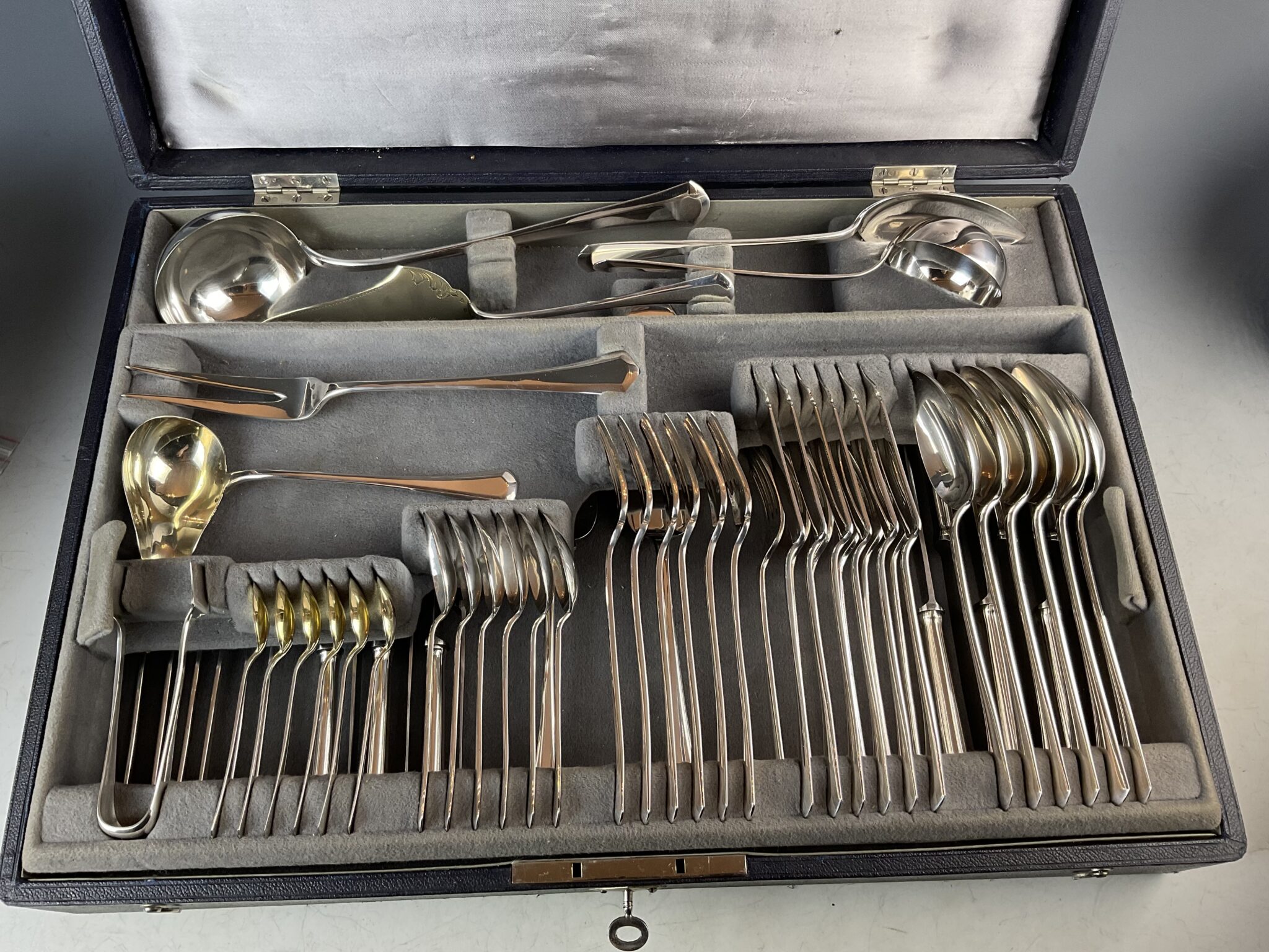 63 Teile, Silber, teilweise vergoldet, Art Deco-Facon, alle Teile gemarkt mit tschechoslowakischer Punze, Meistermarke JL im Rechteck und Feingehalt 800 im Rechteck, alle Messer mit rostfreien Klingen, in originaler Kassette, funktionierendes Schloß mit Schlüssel, innen mit grauem Filz tapeziert, handpolierter, tadelloser Erhaltungszustand
