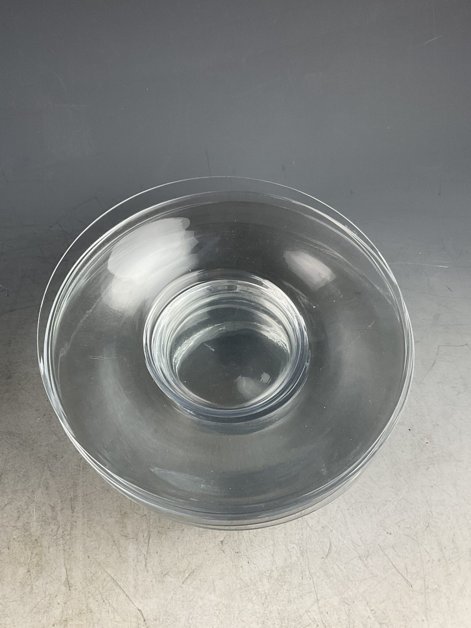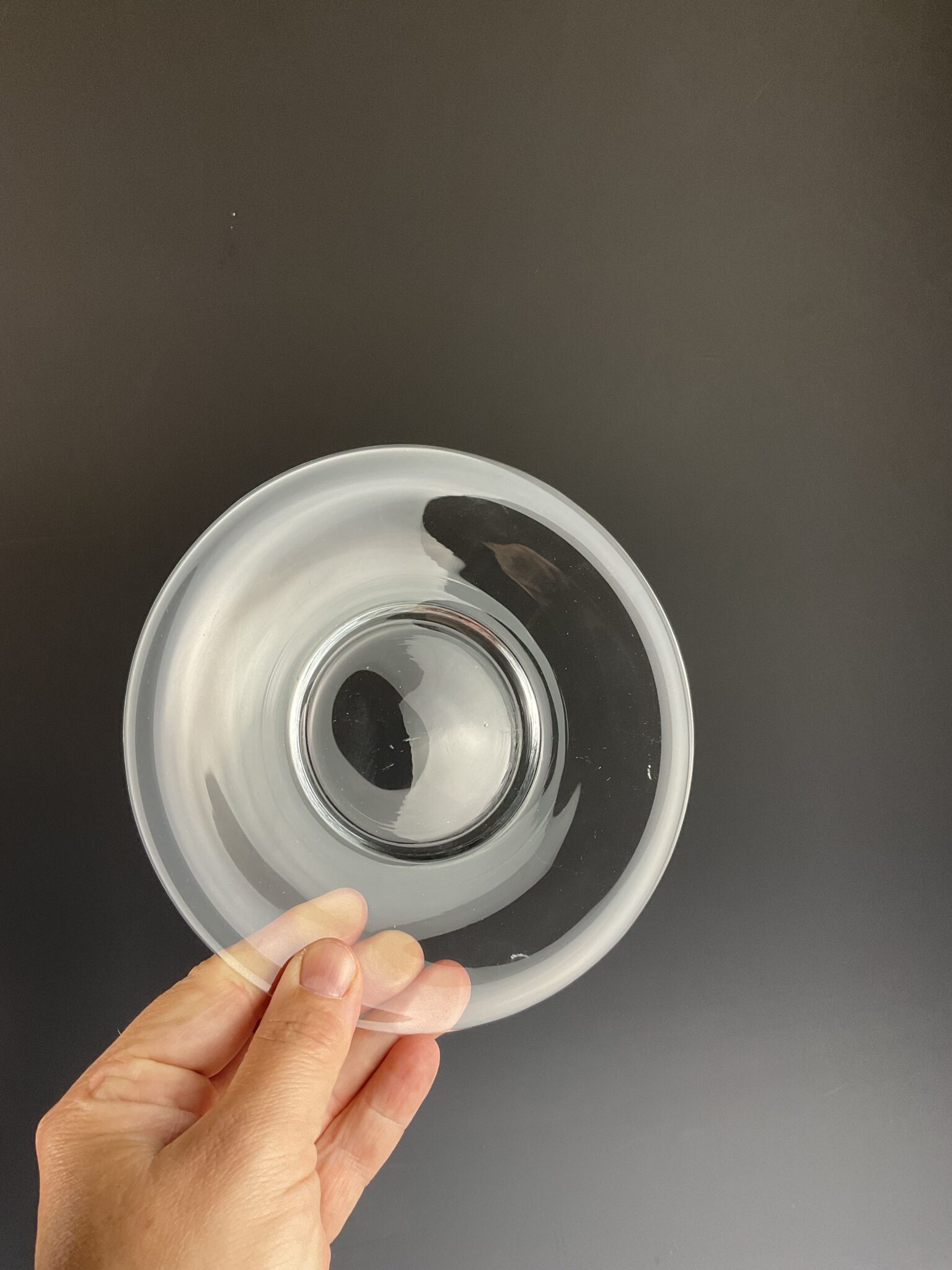 farbloses Kristallglas, rund, geschwerter Spiegel, flache Fahne ohne Schliff, unsigniert, tadellos erhalten