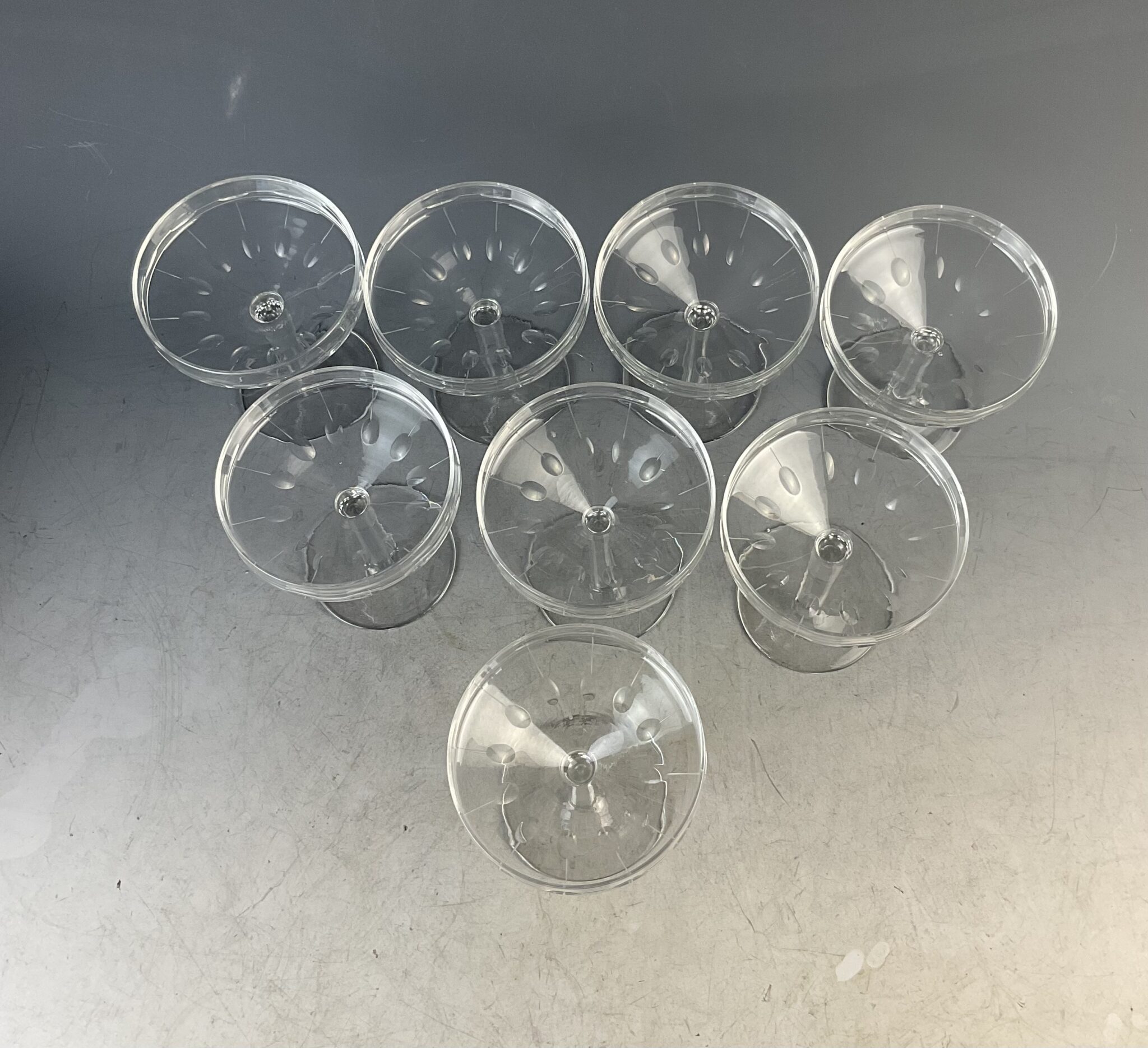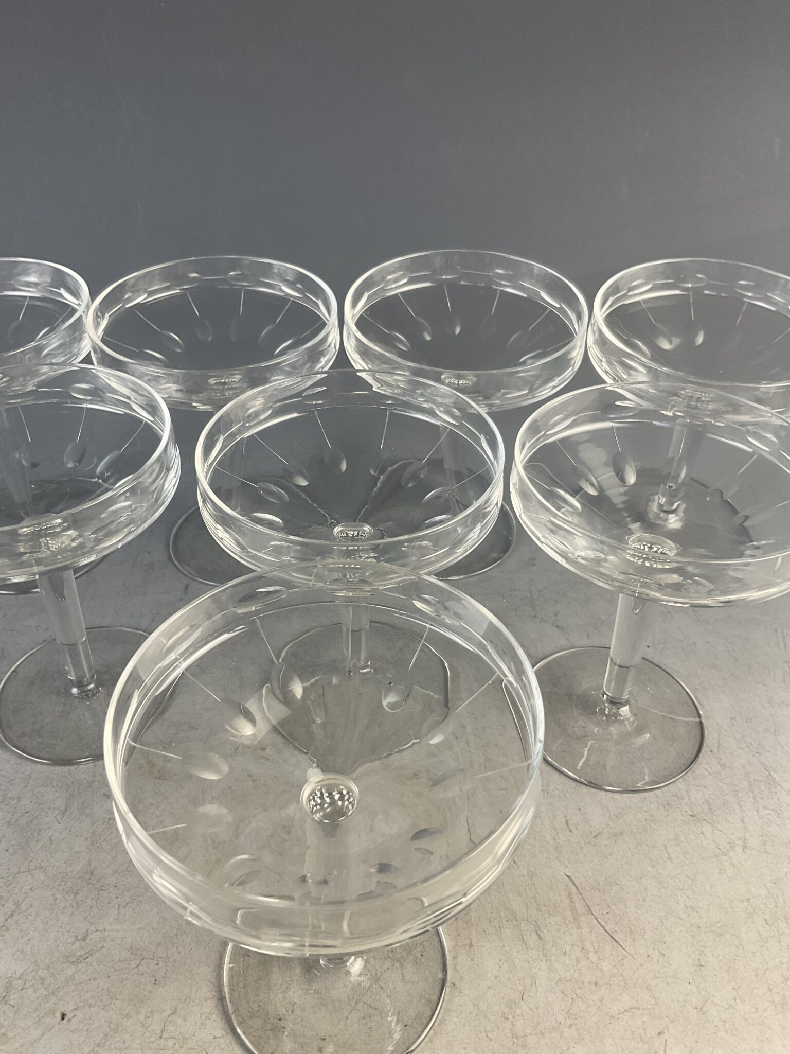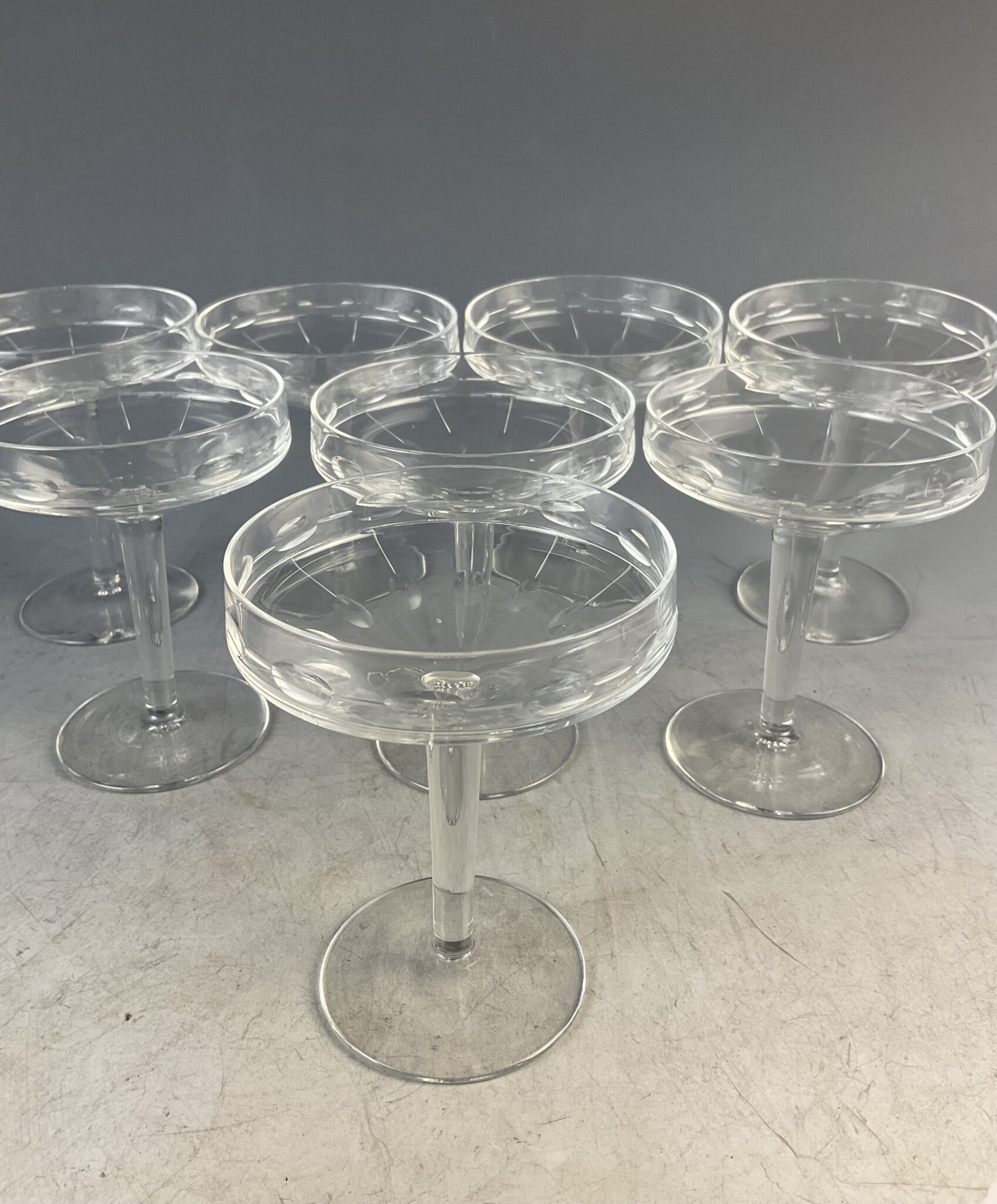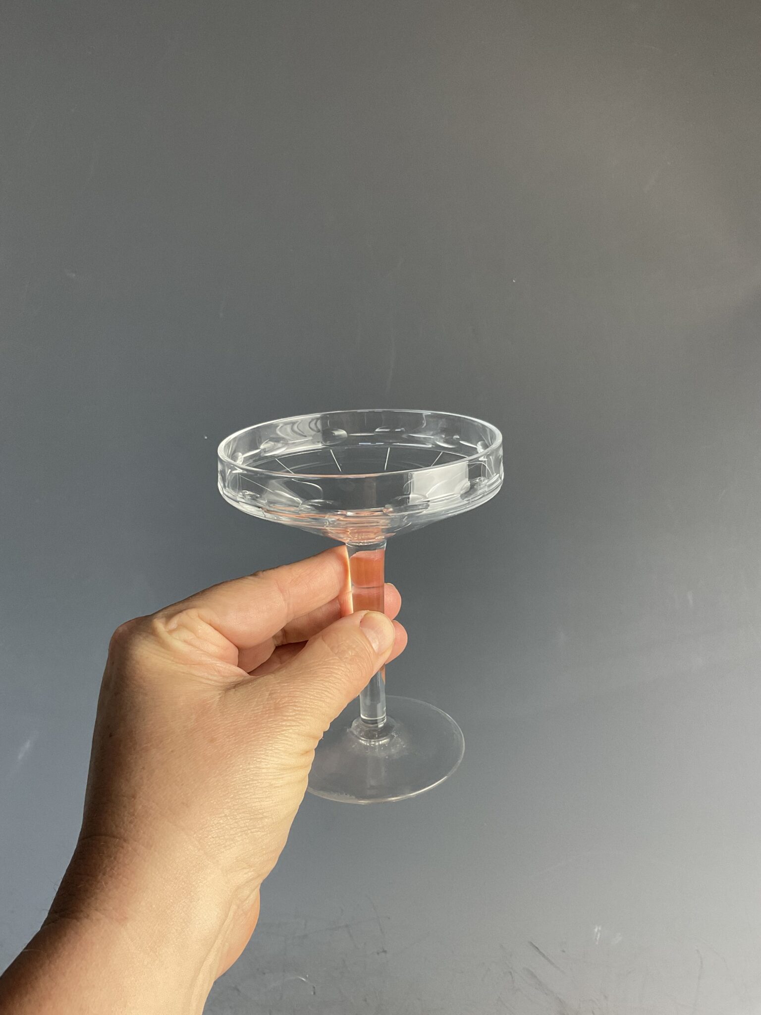 Annettes Etikette: Ich liebe es aus Sektschalen zu trinken, wenn gleich der Connaisseur dies nicht so gerne sieht. Zu schnell sind die mühsam in die Flasche gezauberten Bubbles wieder weg. Dennoch ist auffallend, dass sich auch die Gäste mit einer Champagnerschale in der Hand ganz anders benehmen. Hier haben sich acht Stück feinster Sektschalen mit Jugendstil-Dekor erhalten.