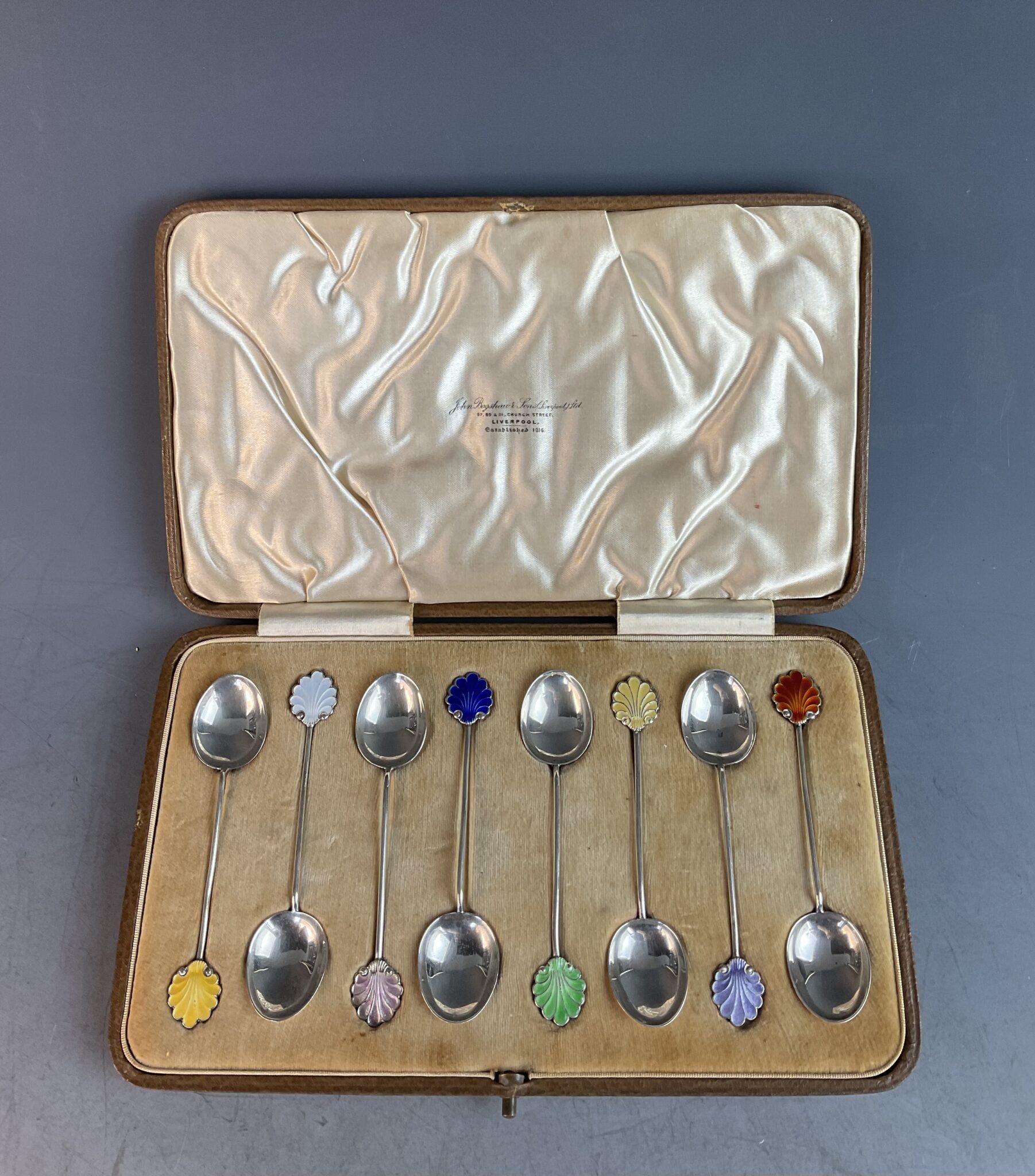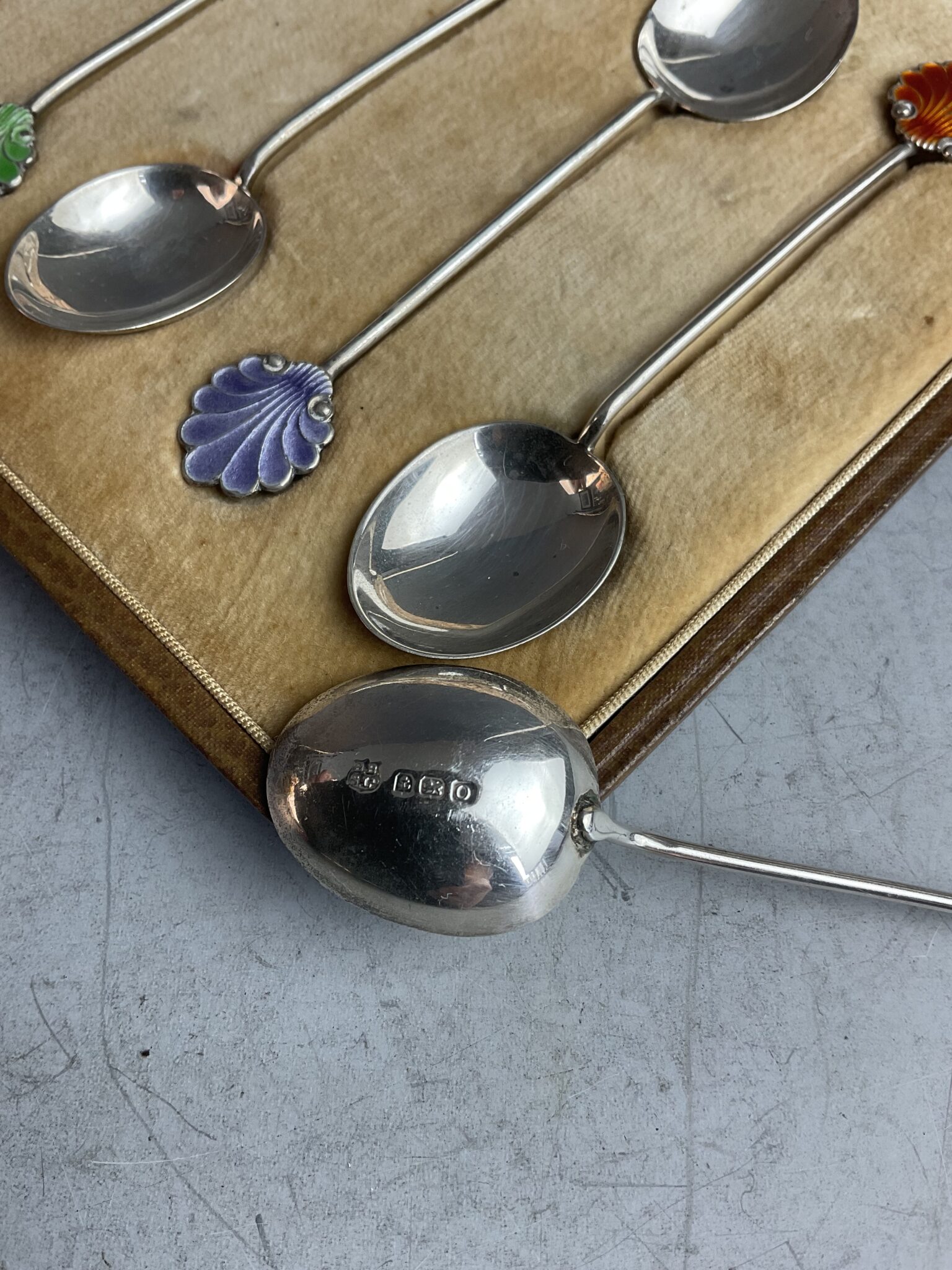 8 silberne Mokkalöffel mit Email, Birmingham, England, 1925