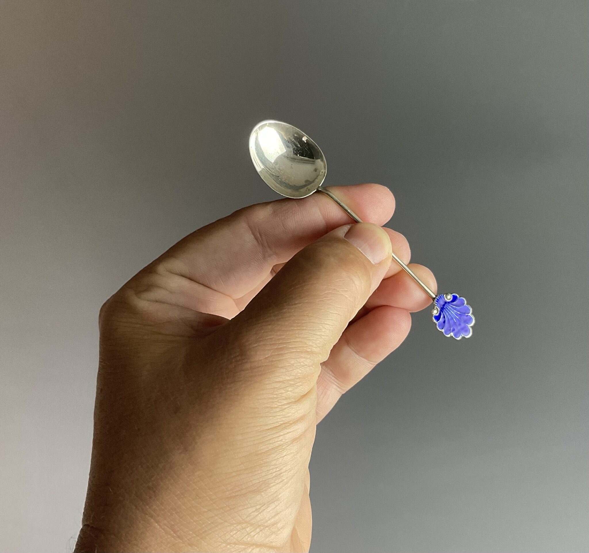 8 silberne Blumen-Mokkalöffel mit Emaildekor