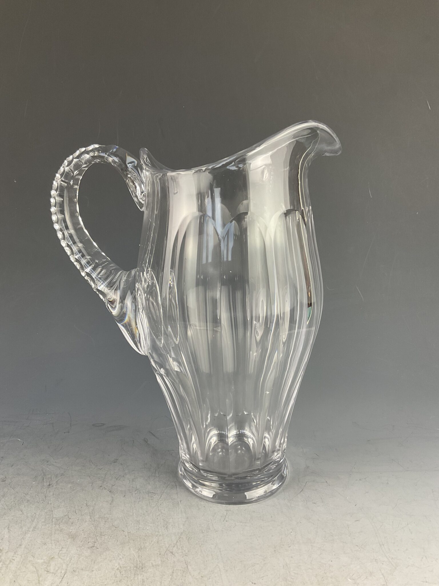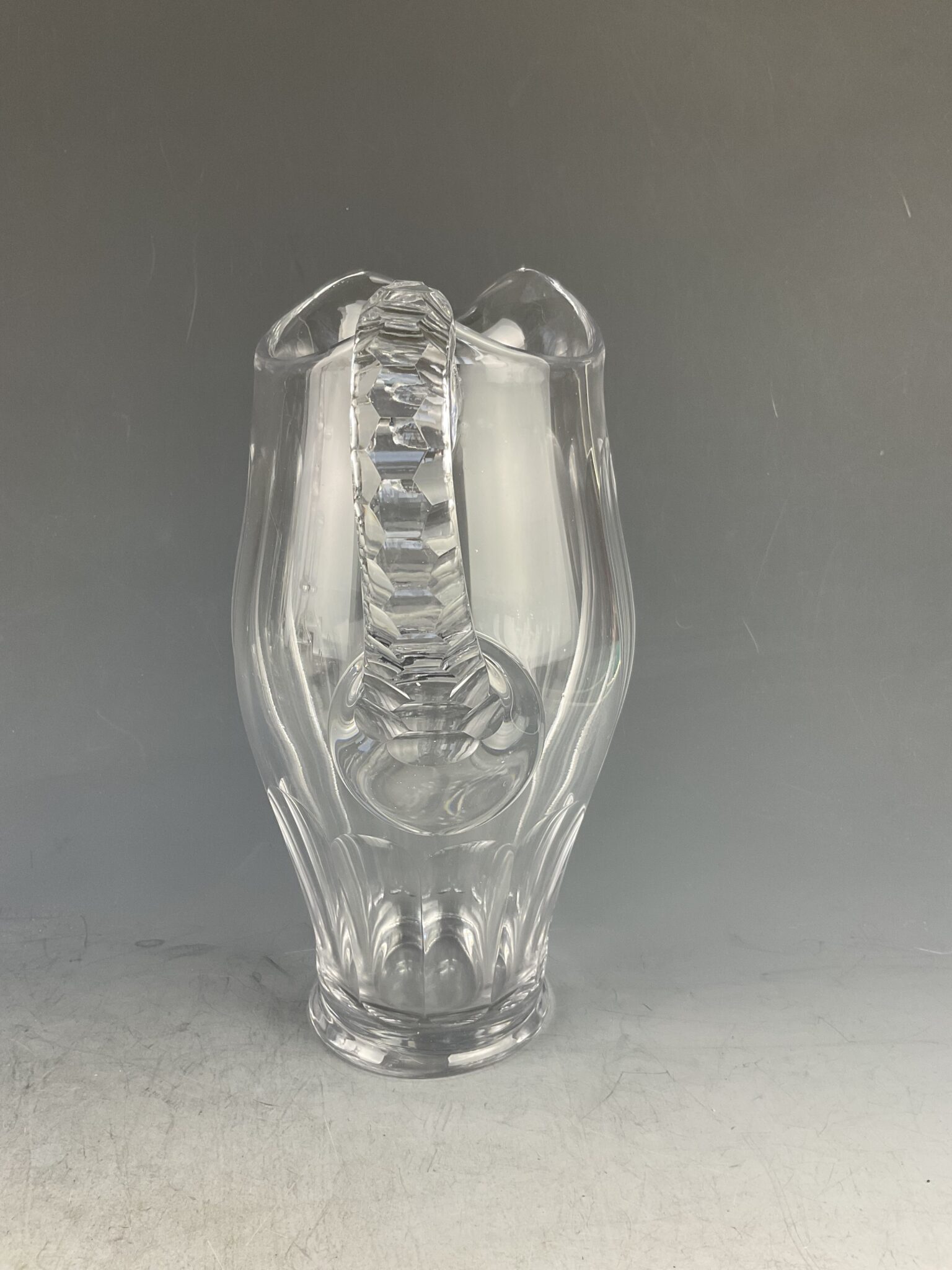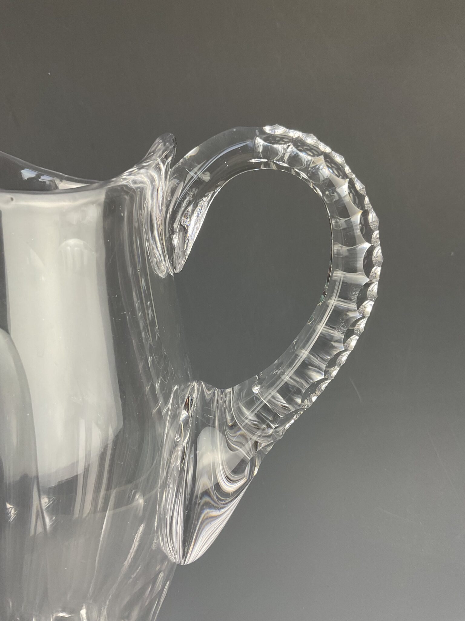 farbloses Glas, geschwerter Stand mit Facettenschliff, Ausguß, hochgezogener Henkel, tadelloser Erhaltungszustand