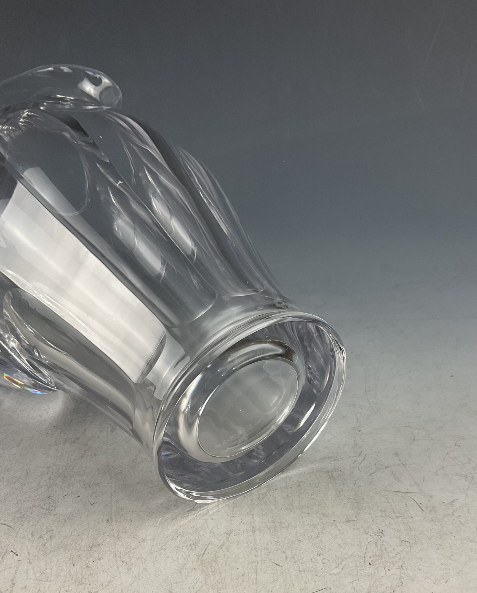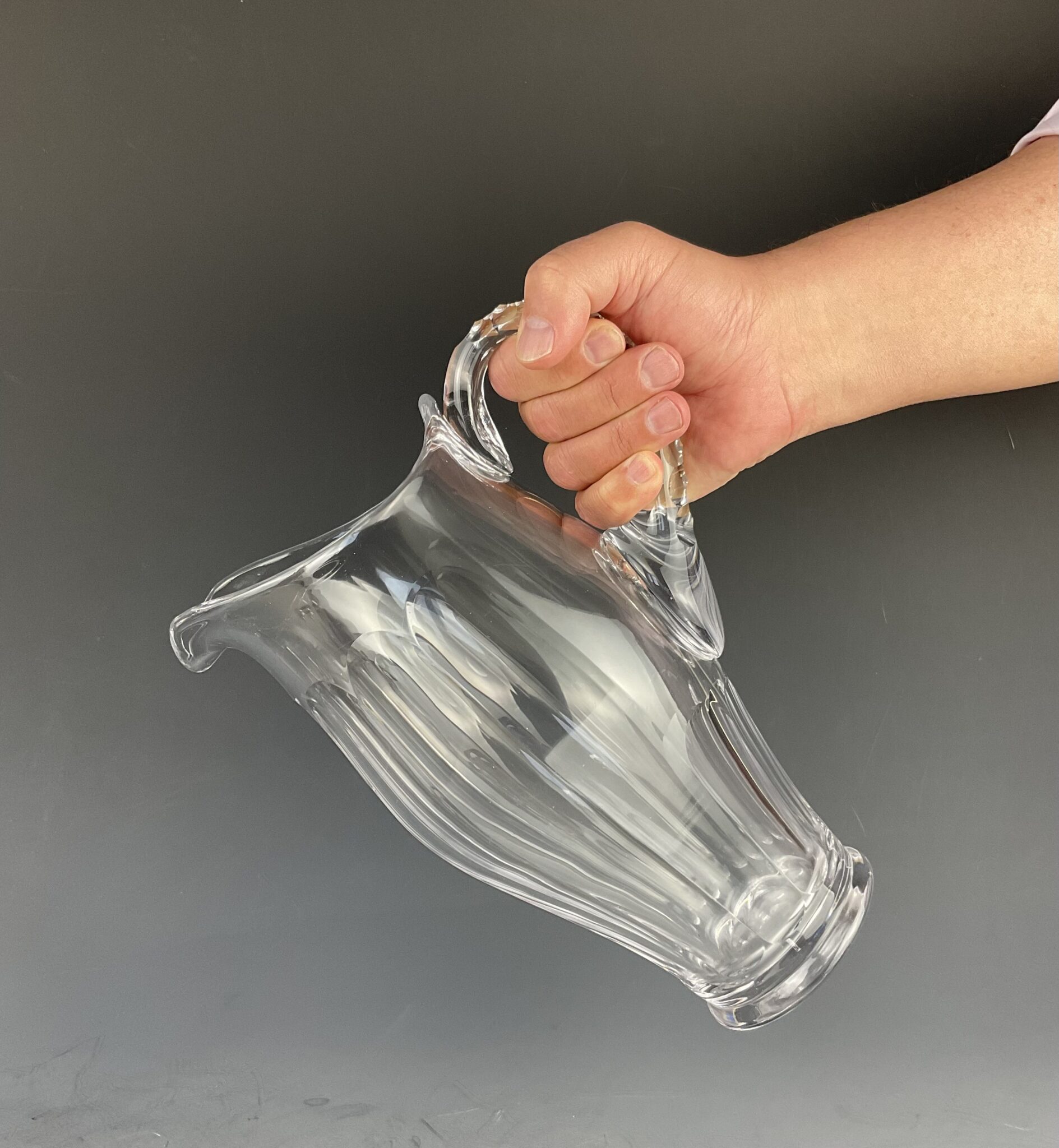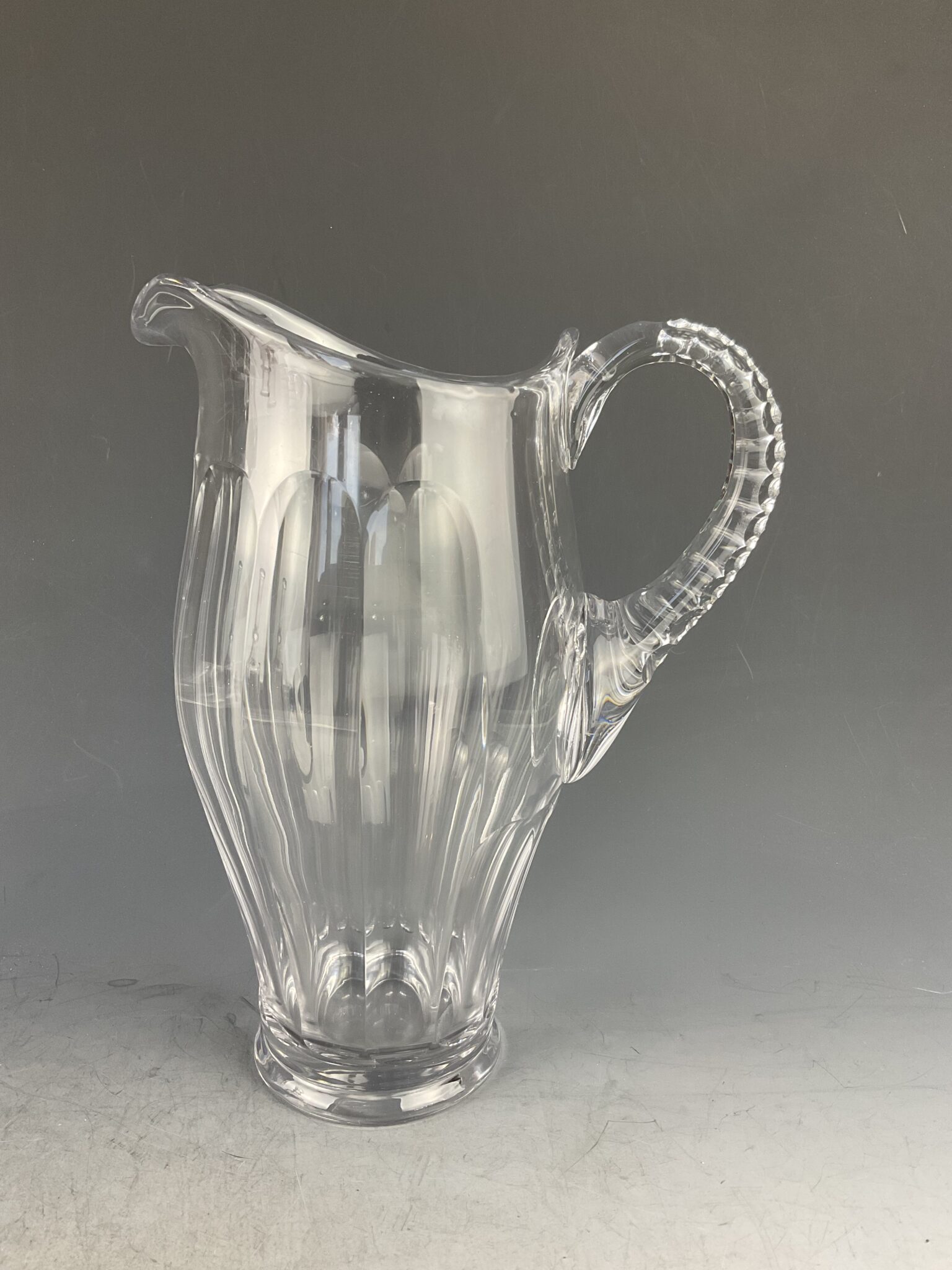 farbloses Glas, geschwerter Stand mit Facettenschliff, Ausguß, hochgezogener Henkel, tadelloser Erhaltungszustand