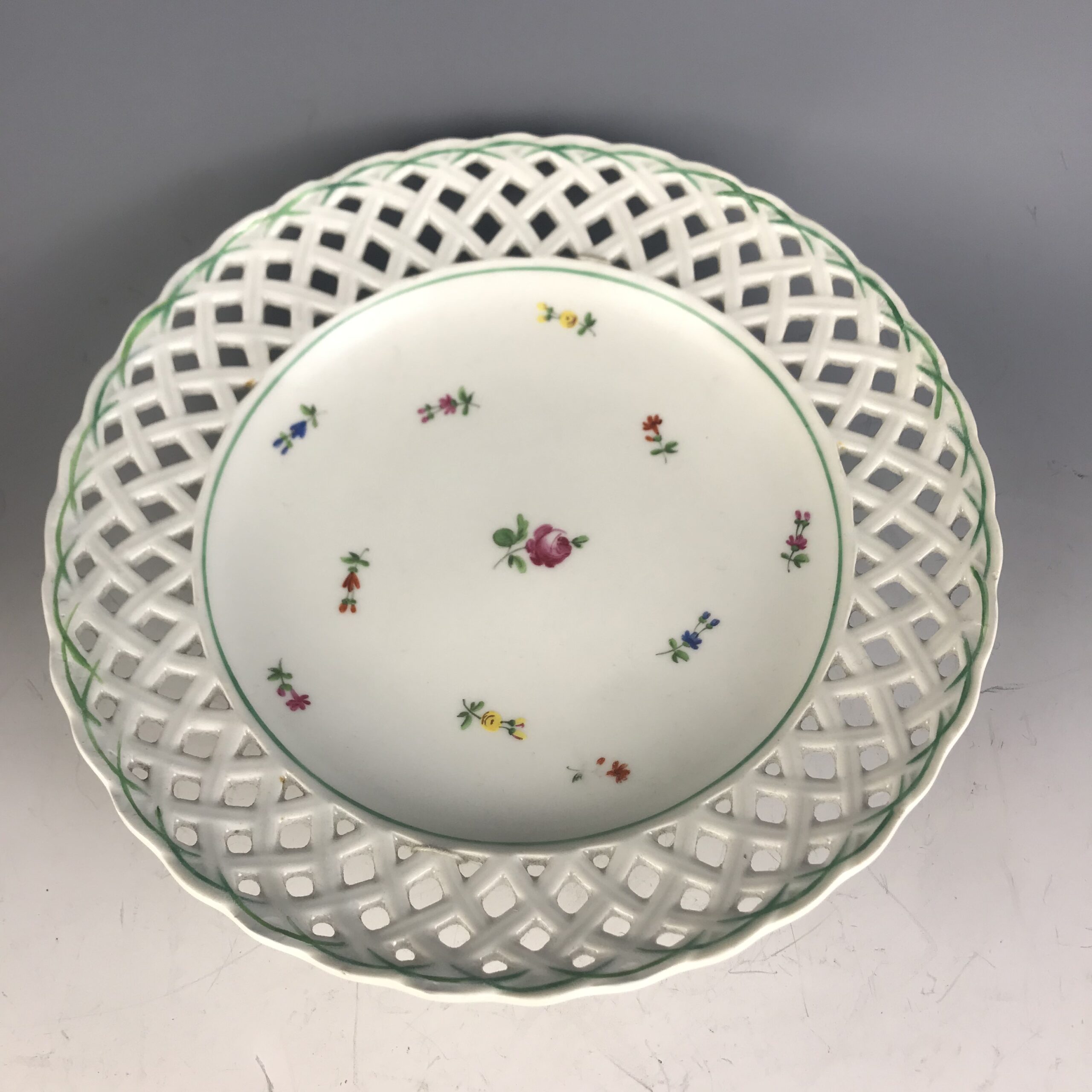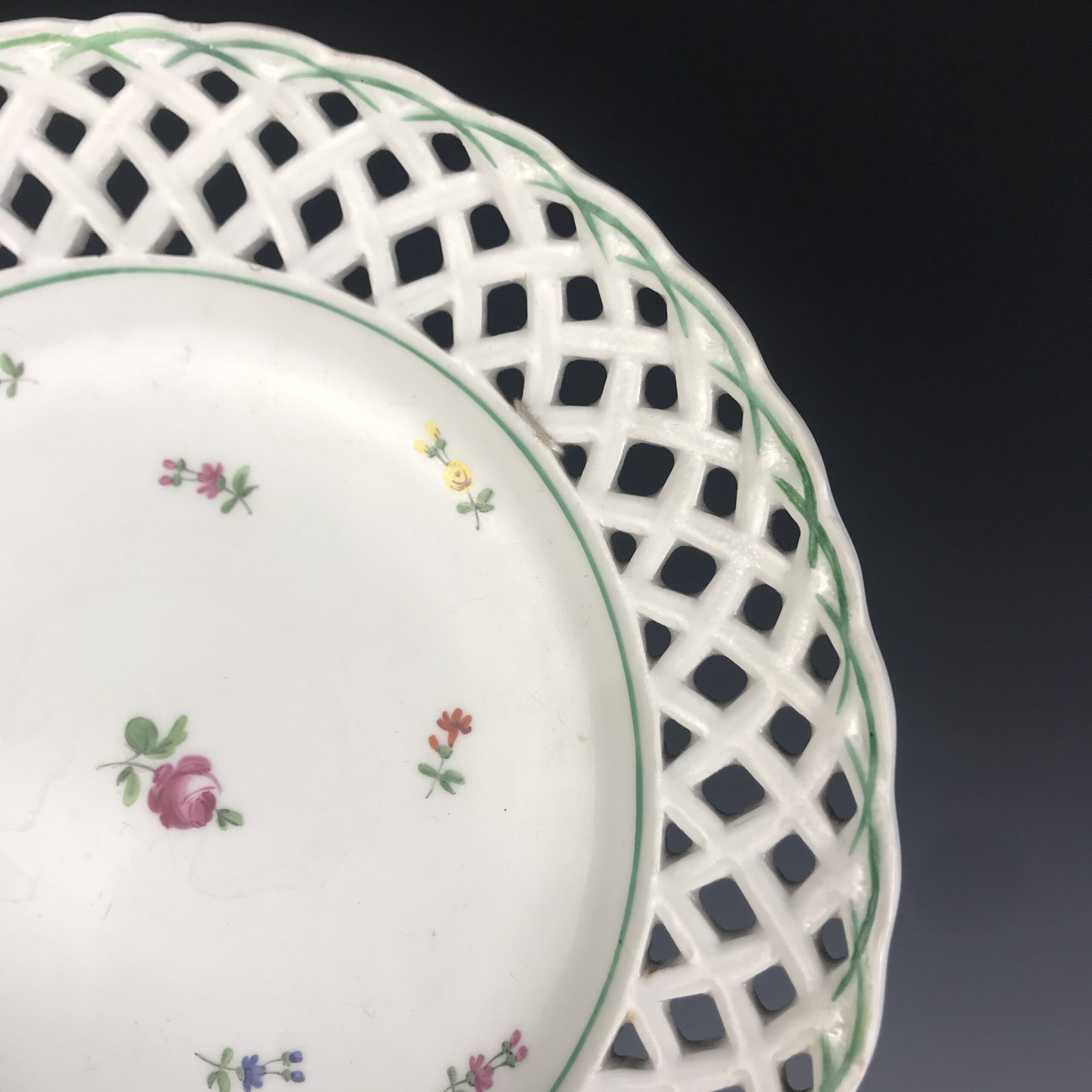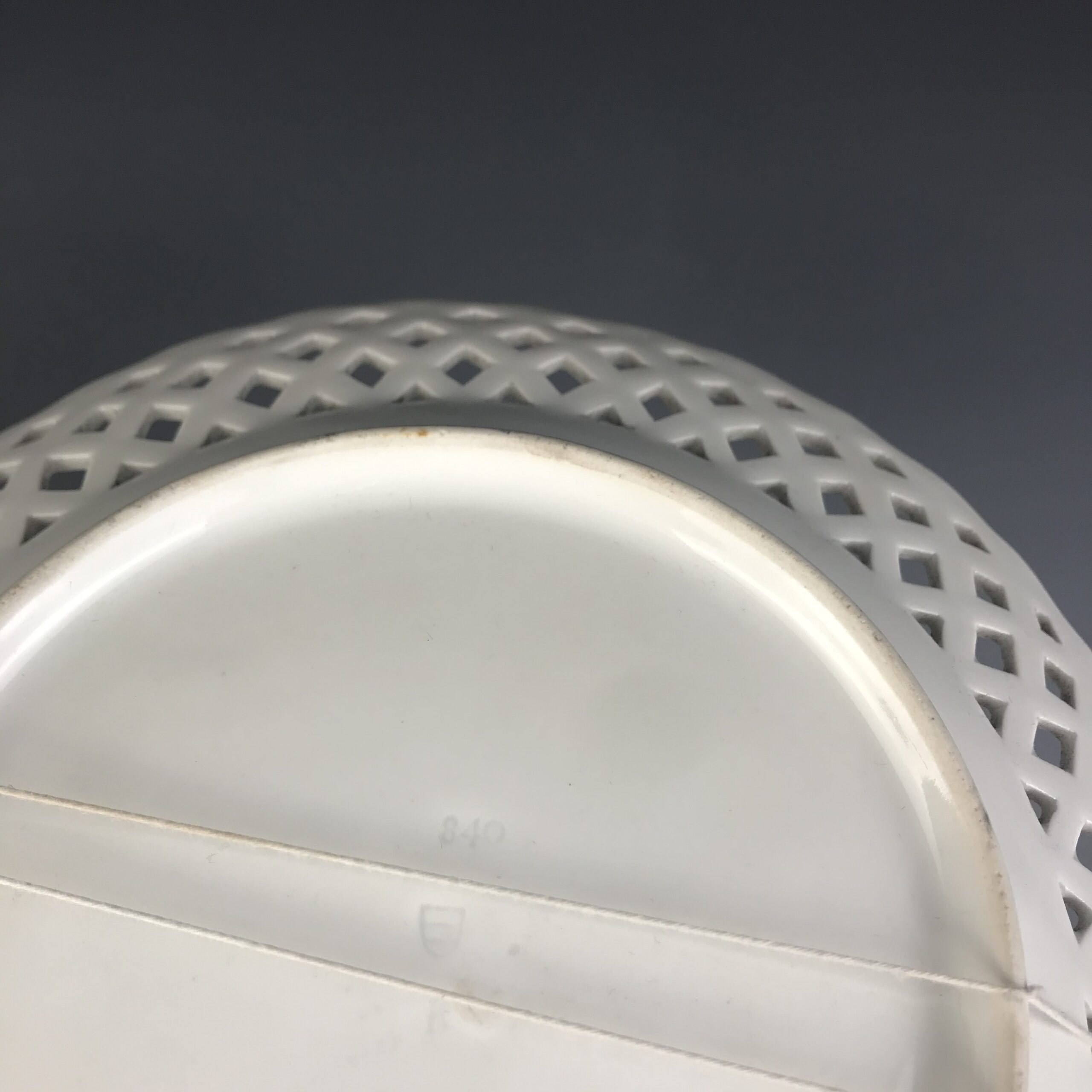 Porzellan, glasiert, fein durchbrochen gearbeitete Fahne mit grünem Dekor, Spiegel mit Blütendekor, gemarkt mit unterglasurblauem Bindenschild, eingepresste Jahreszahl (1)840, fachmännisch restaurierte Stellen am Gitterrand