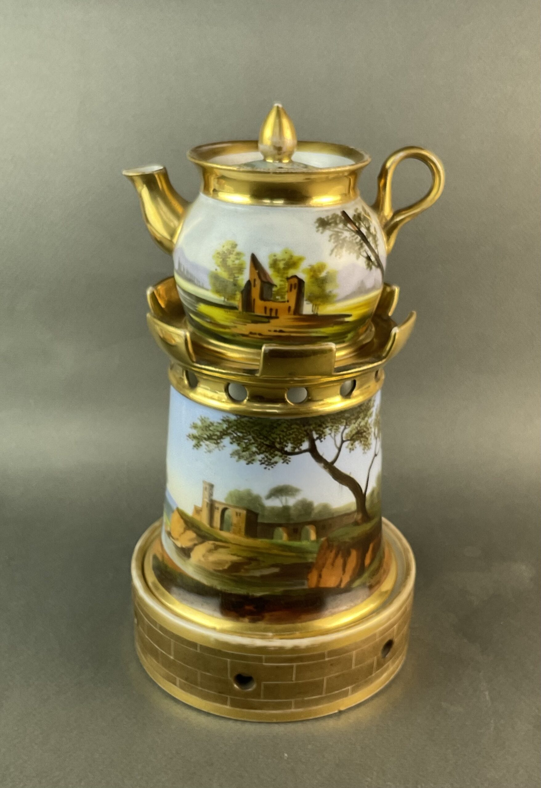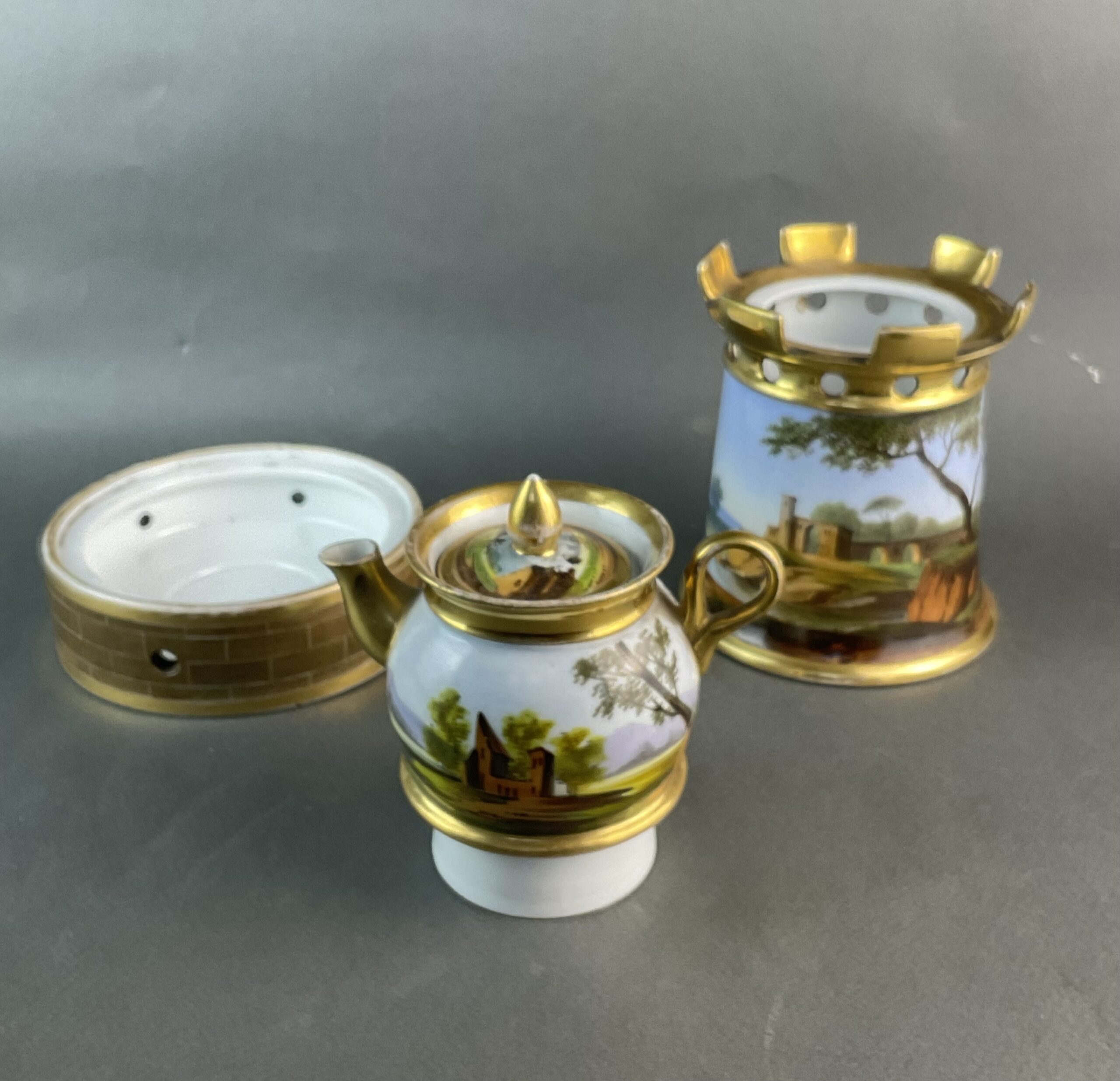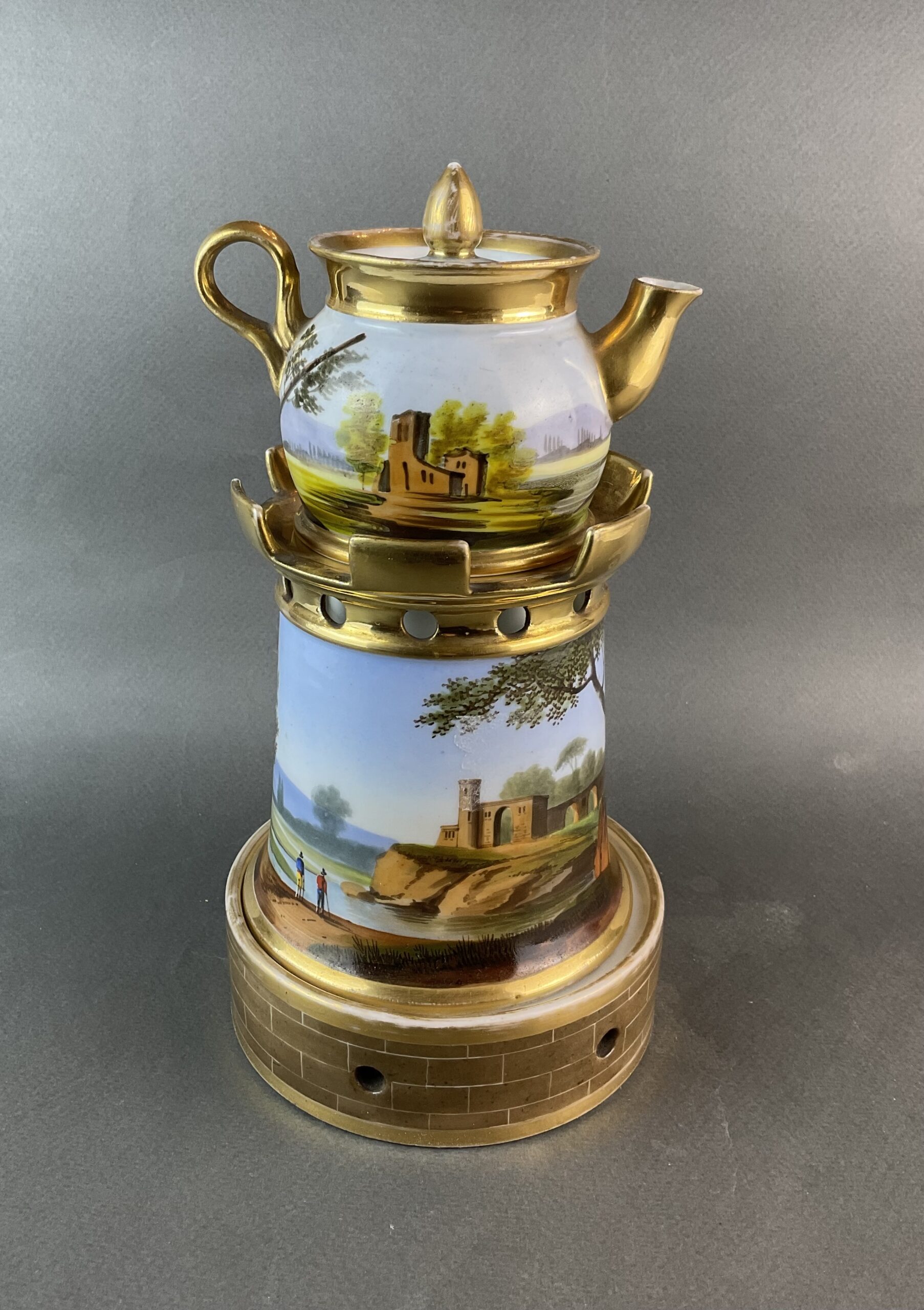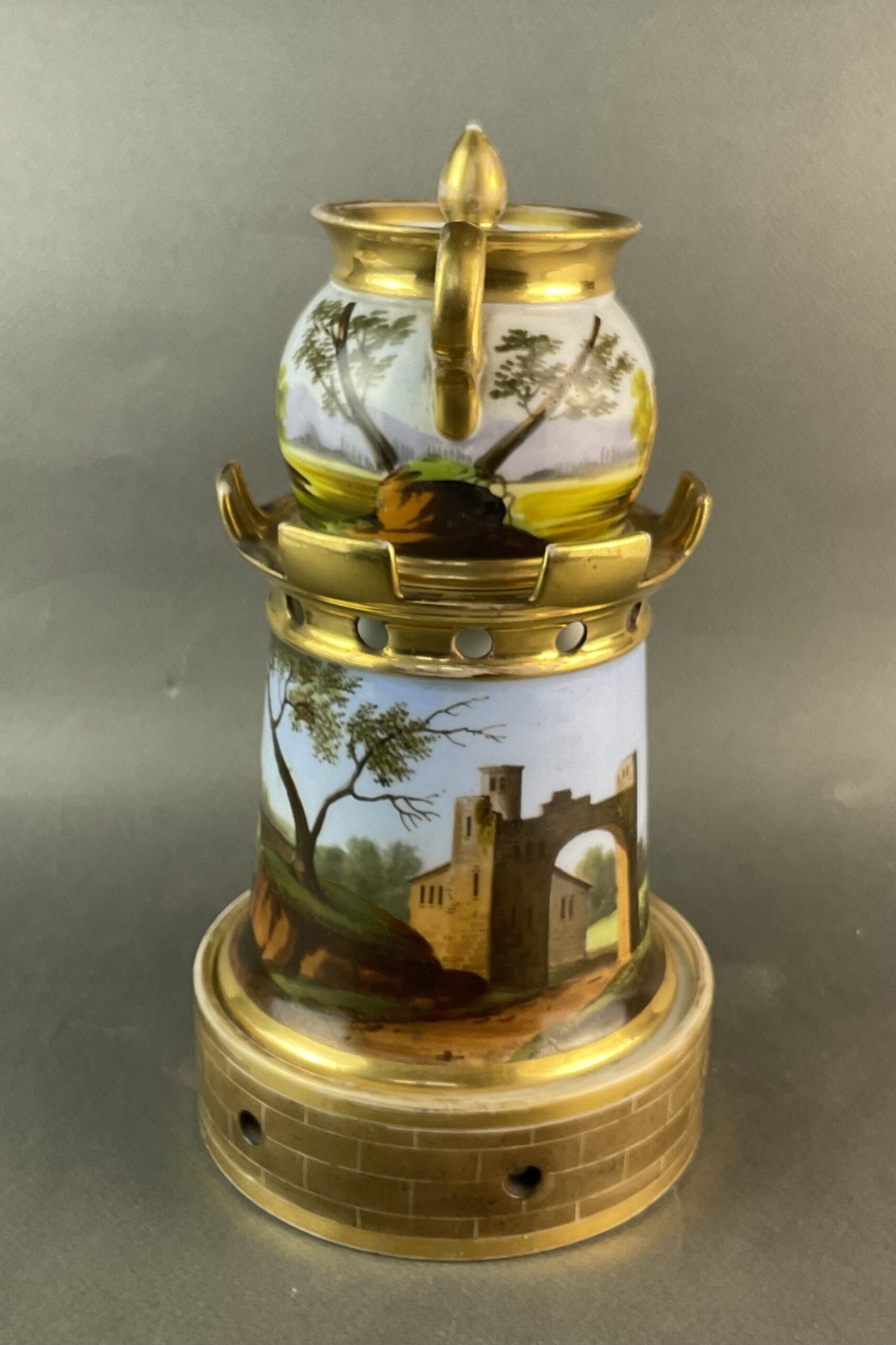 Porzellan, glasiert, umlaufende Bemalung mit Landschaftsmalerei, dreiteilig, kleines Kännchen mit Deckel, zylindrische Säule mit vergoldeten Zinnen, Sockel mit illusionistischer Ziegelmalerei, ungemarkt, bis auf minimalen Goldabrieb tadelloser Erhaltungszustand