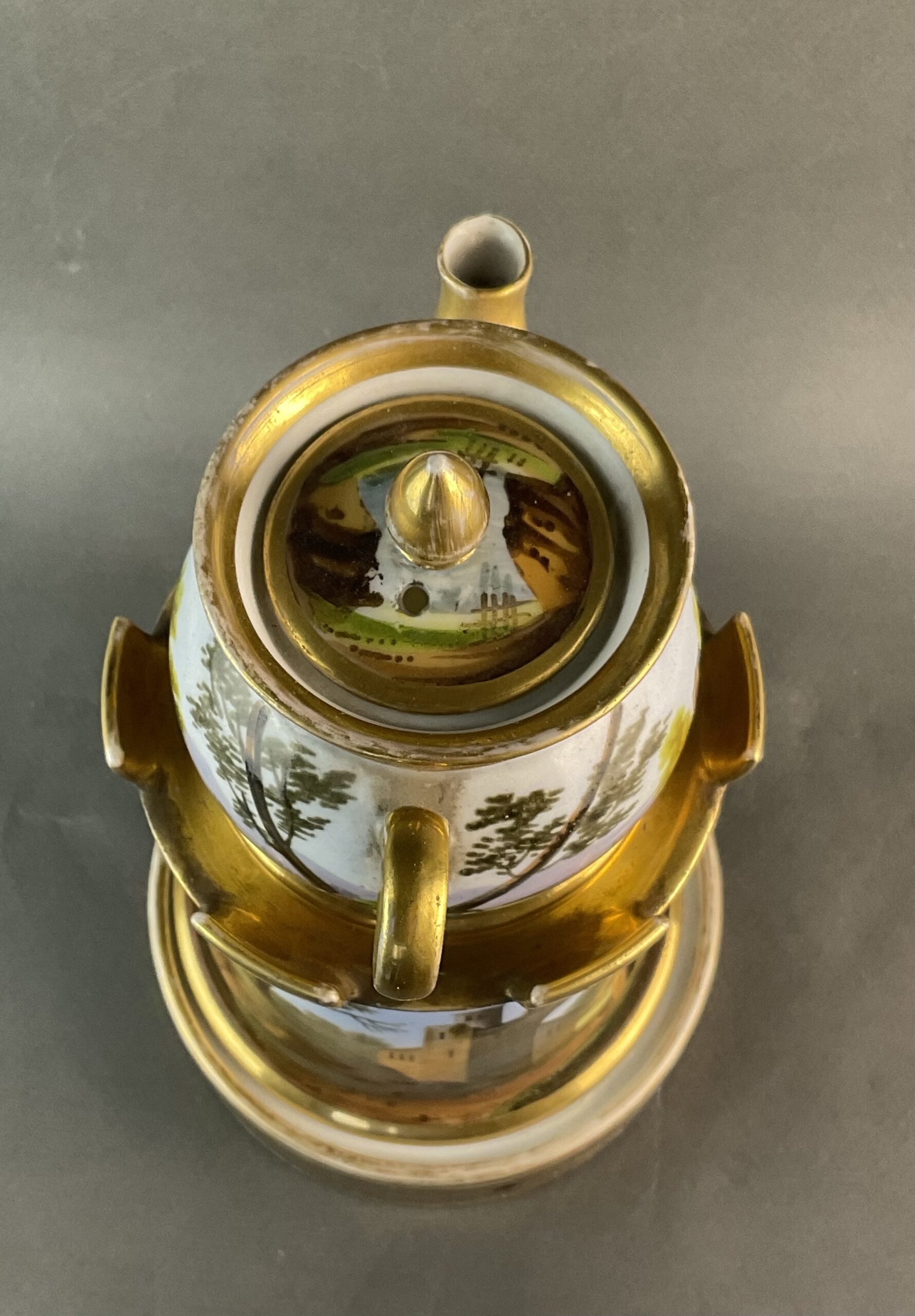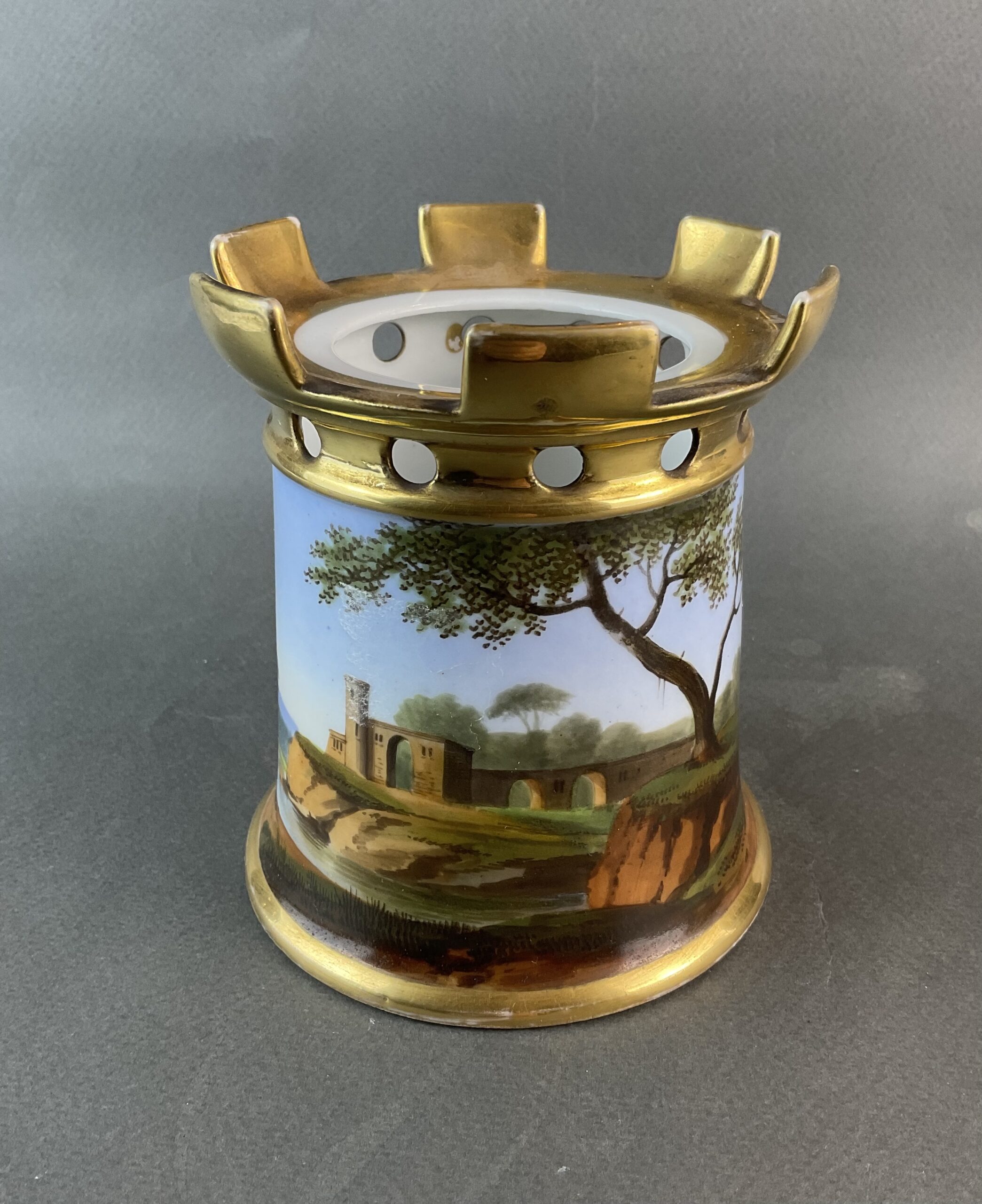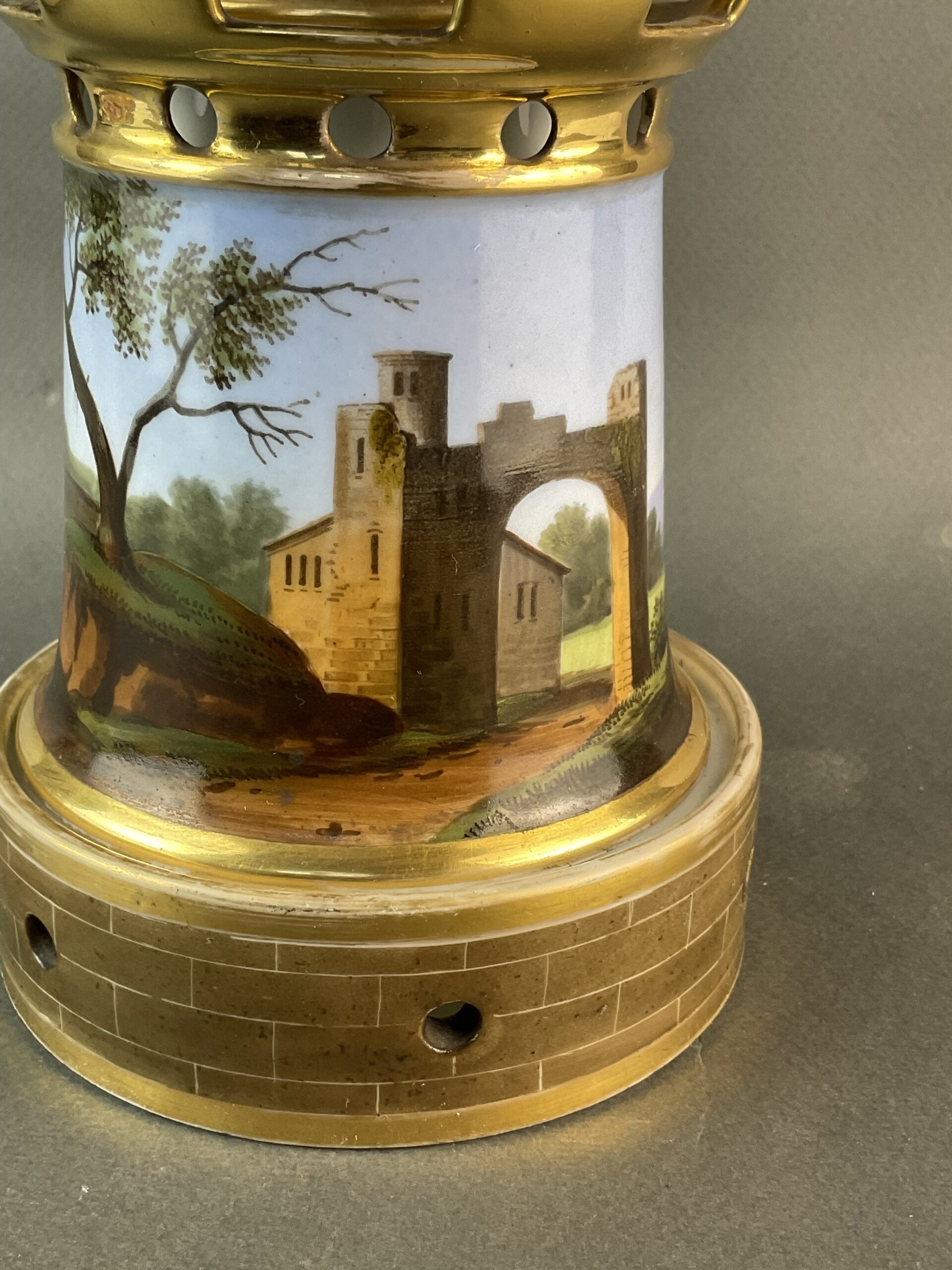 Porzellan, glasiert, umlaufende Bemalung mit Landschaftsmalerei, dreiteilig, kleines Kännchen mit Deckel, zylindrische Säule mit vergoldeten Zinnen, Sockel mit illusionistischer Ziegelmalerei, ungemarkt, bis auf minimalen Goldabrieb tadelloser Erhaltungszustand