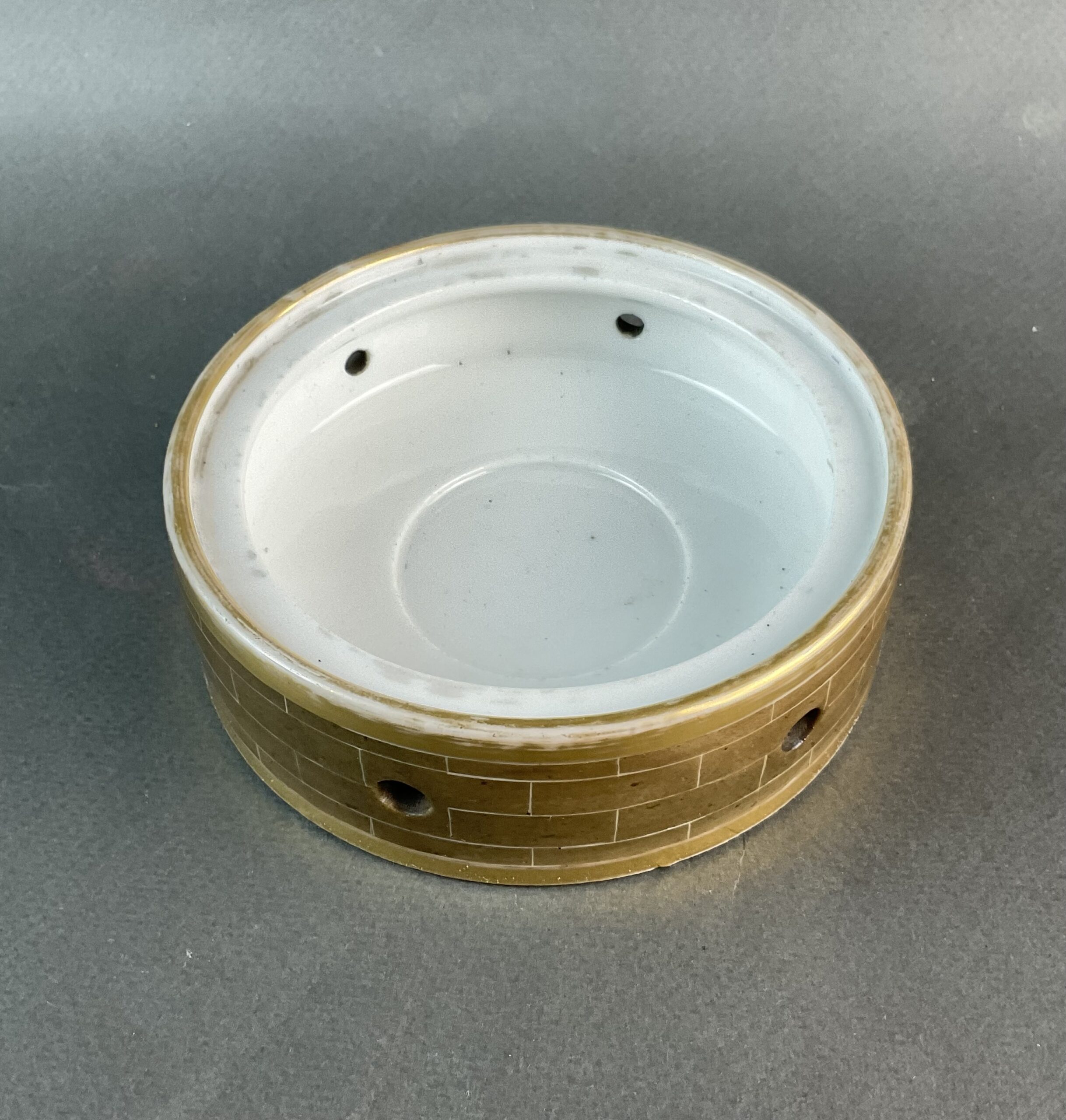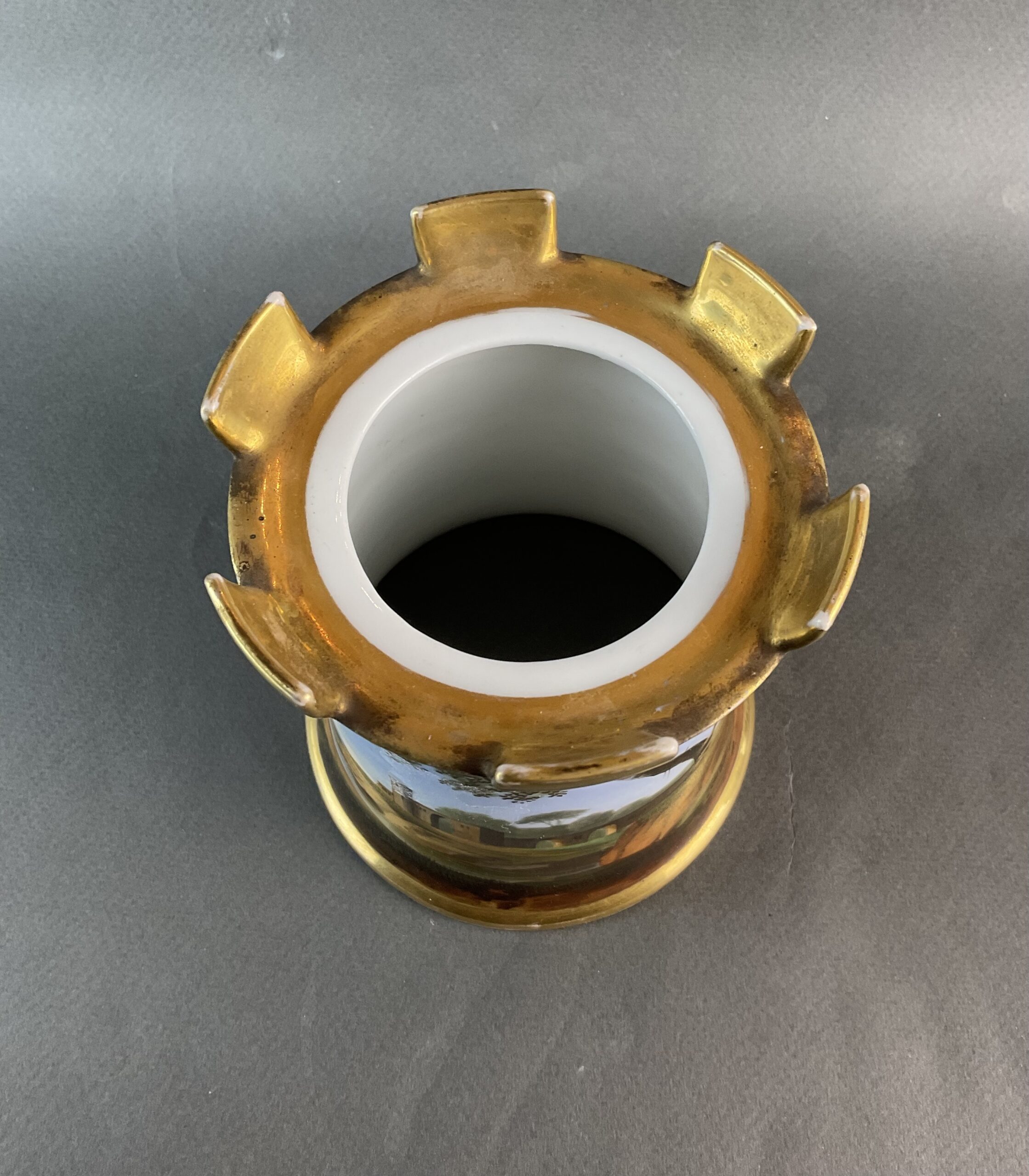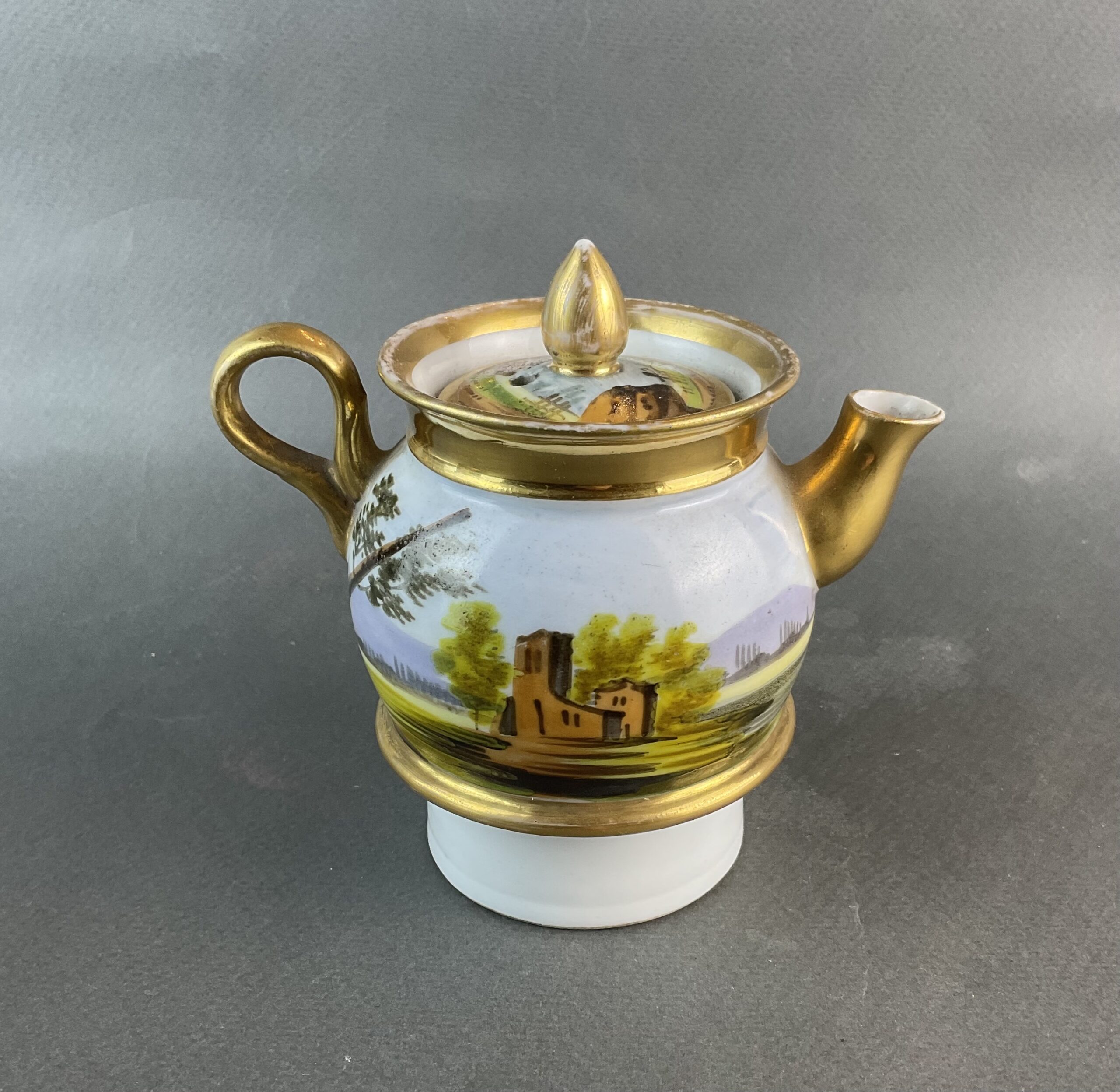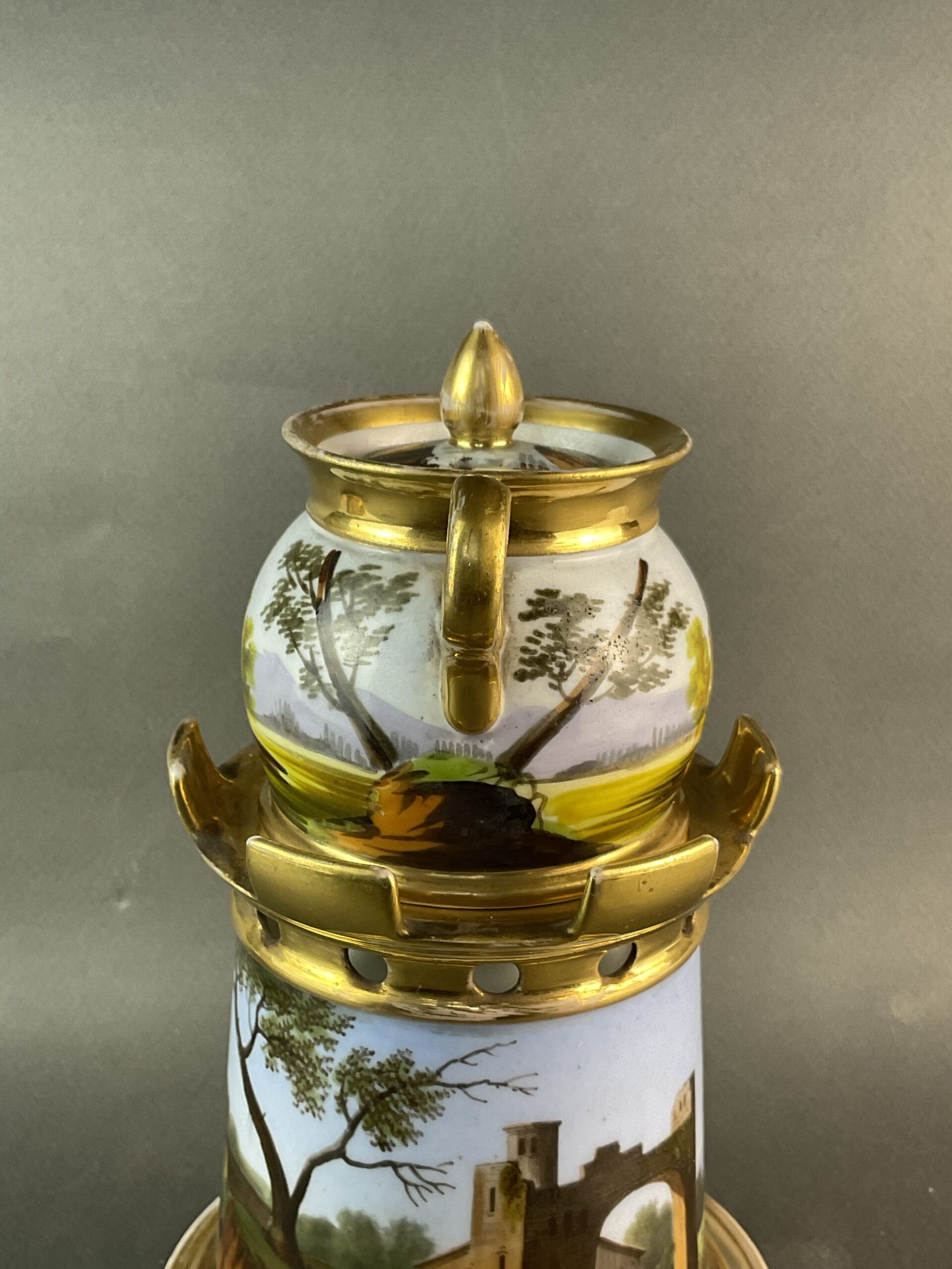 Porzellan, glasiert, umlaufende Bemalung mit Landschaftsmalerei, dreiteilig, kleines Kännchen mit Deckel, zylindrische Säule mit vergoldeten Zinnen, Sockel mit illusionistischer Ziegelmalerei, ungemarkt, bis auf minimalen Goldabrieb tadelloser Erhaltungszustand