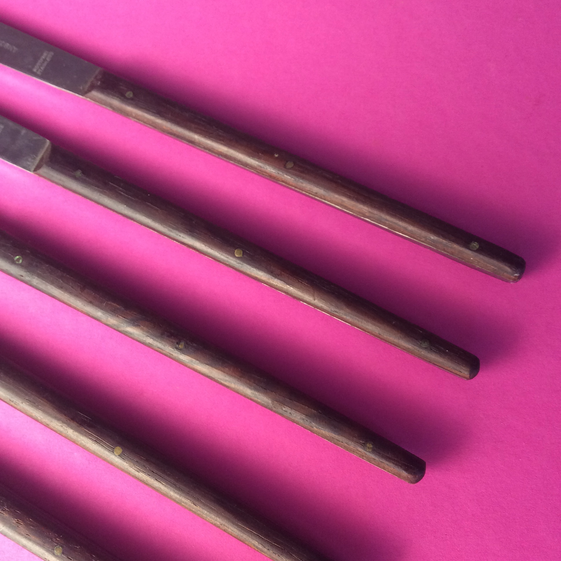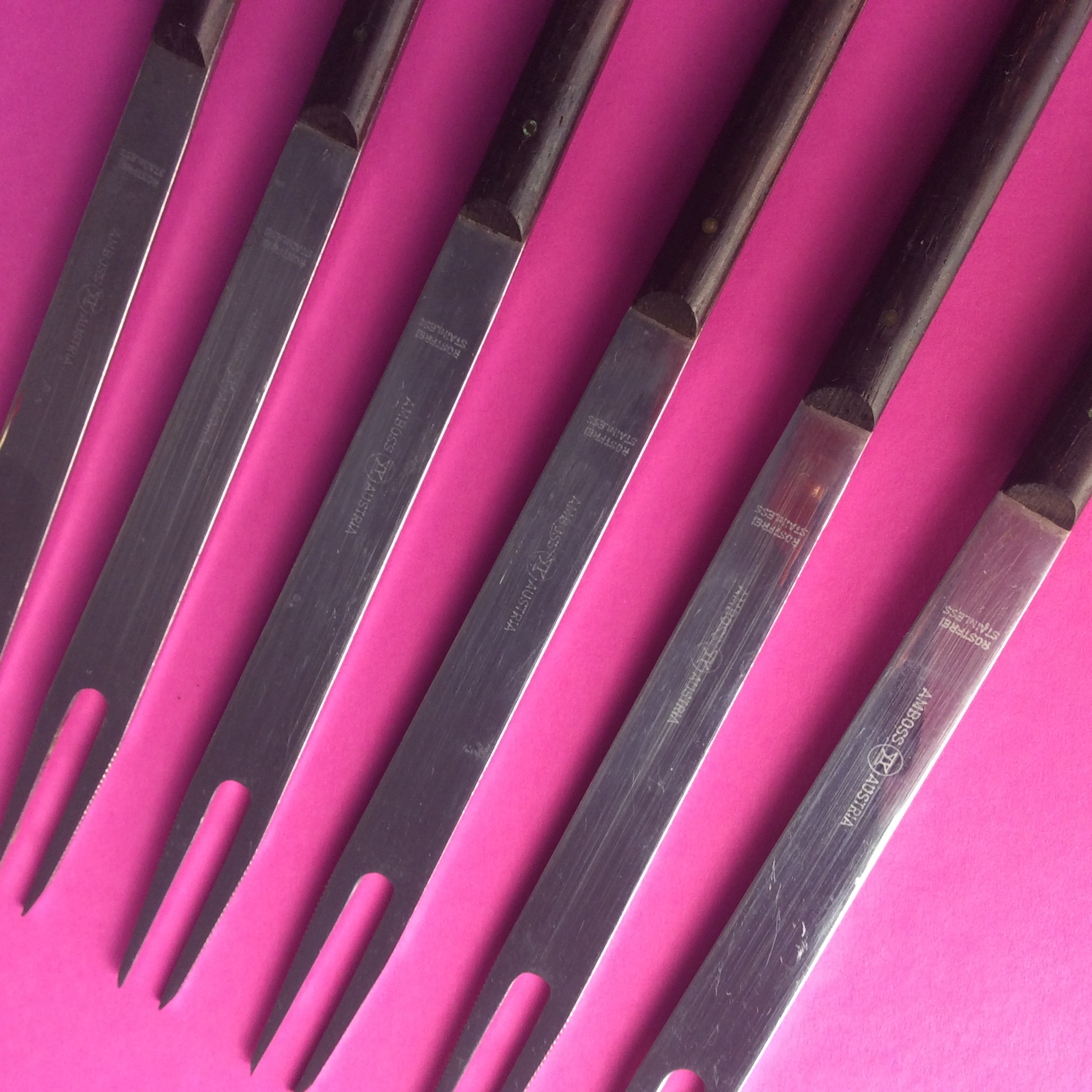 Annettes Etikette: Die oberösterreichische Firma Neuzeughammer Ambosswerk entwickelt bereits ab 1950 mit Hilfe von Designern wie Carl Auböck, Helmut Alder oder János Megyik moderne Besteckformen. Vom einfachen Messer- und Stahlwarenerzeuger gelang der Firma Amboss ein Beitrag zur österreichischen Designgeschichte. Anlässlich der Ausstellung „Schönes Essen“ im Möbelmuseum Wien konnte ich den Sammler und Autor Heinz Averwerser persönlich kennenlernen. Eine Freude! Diese Fondugabeln Modellnummer 1012 wurden vor 1960 entworfen und konnten bei den Holzgriffen in Cocopolo, Palisander, Pagholz, Eiche oder Horn bestellt werden. Im originalen Karton wurden 4 Stück angeboten.
