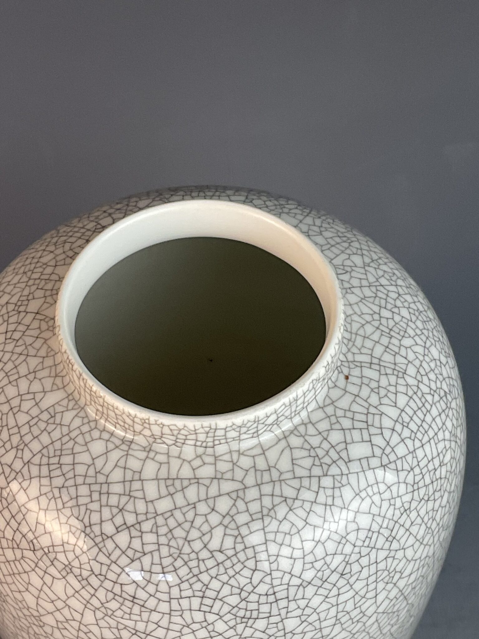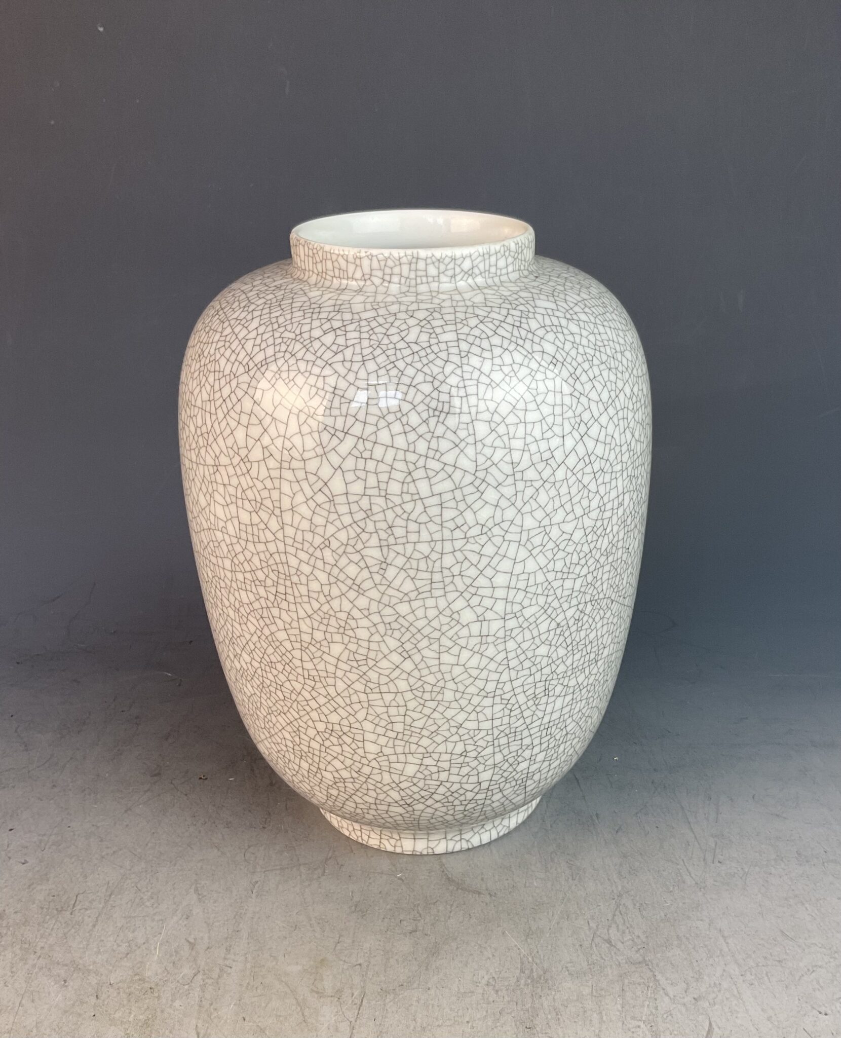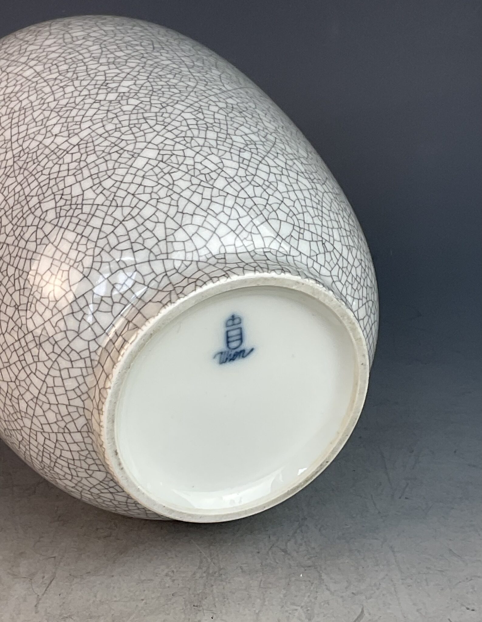 Porzellan, glasiert, Standring, gebauchte Wandung mit abgesetztem Hals, graue Craquelé-Glasur, am Boden blaue Manufakturmarke bekrönter Bindenschild und Wien