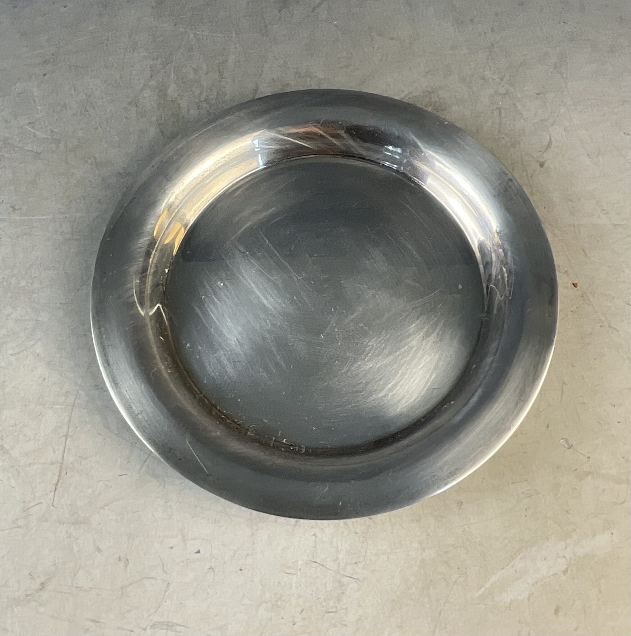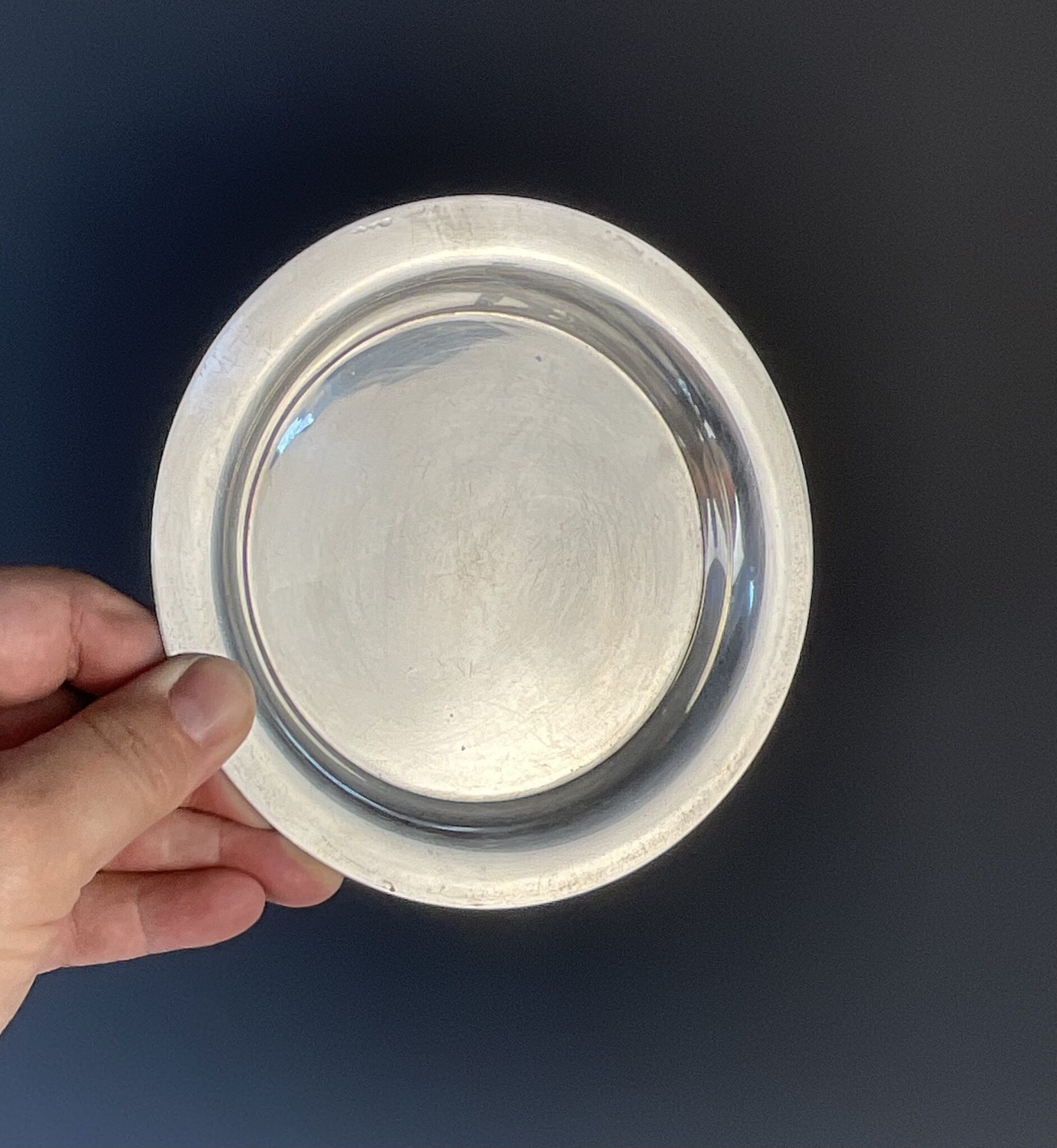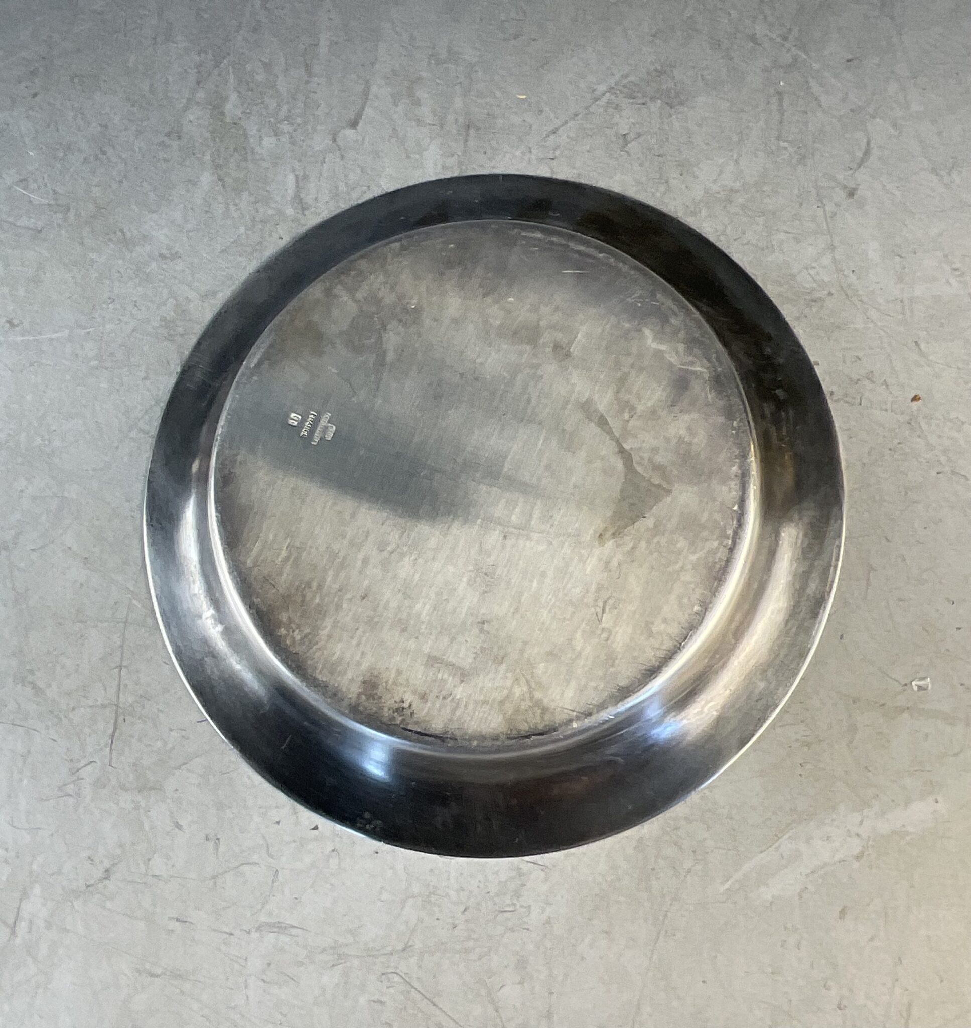 Metall, versilbert, rund, glatter Spiegel mit Fahne, am Boden gemarkt CHRISTOFLE, tadelloser, handpolierter Erhaltungszustand