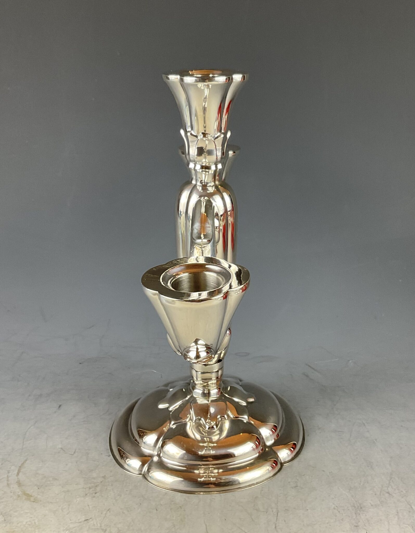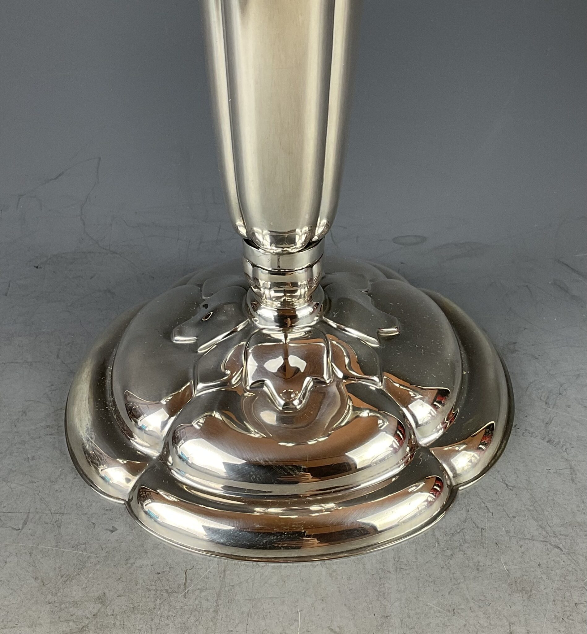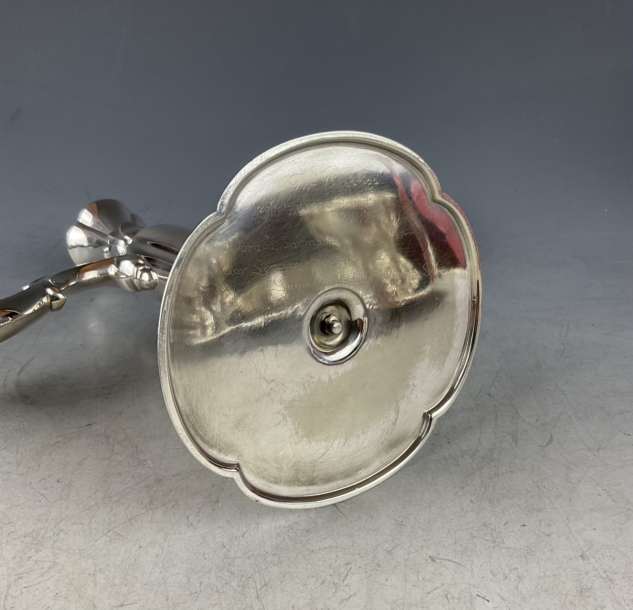 Silber, vierpassiger, geschwerter Sockel, zentraler Balusterschaft, zwei Arme mit fixen Tropftassen, zentrale Tülle gemarkt mit deutschem Staatszeichen, Feingehalt 835 S, Firmenmarke Wilkens, Modellnummer 7735, handpolierter Erhaltungszustand, fachgerechter Fixierungsring am Schaft, Bodenplatte mit kaum sichtbarer Widmungsgravur