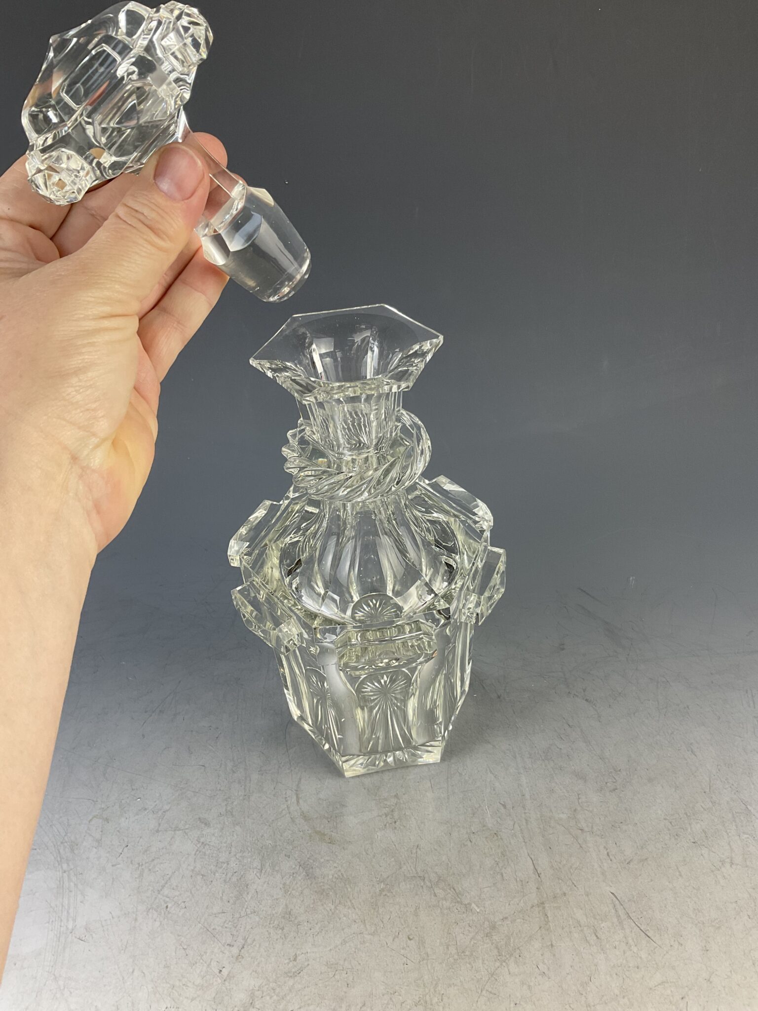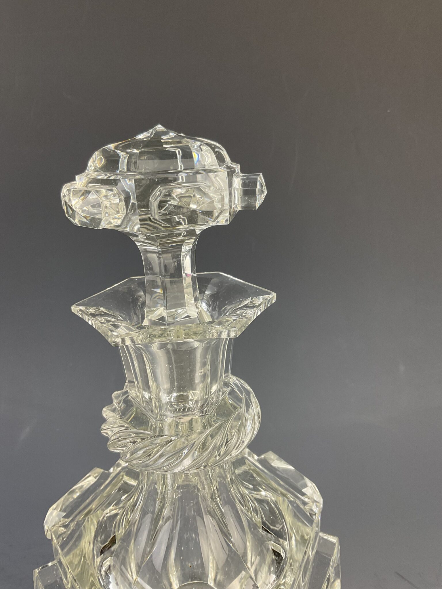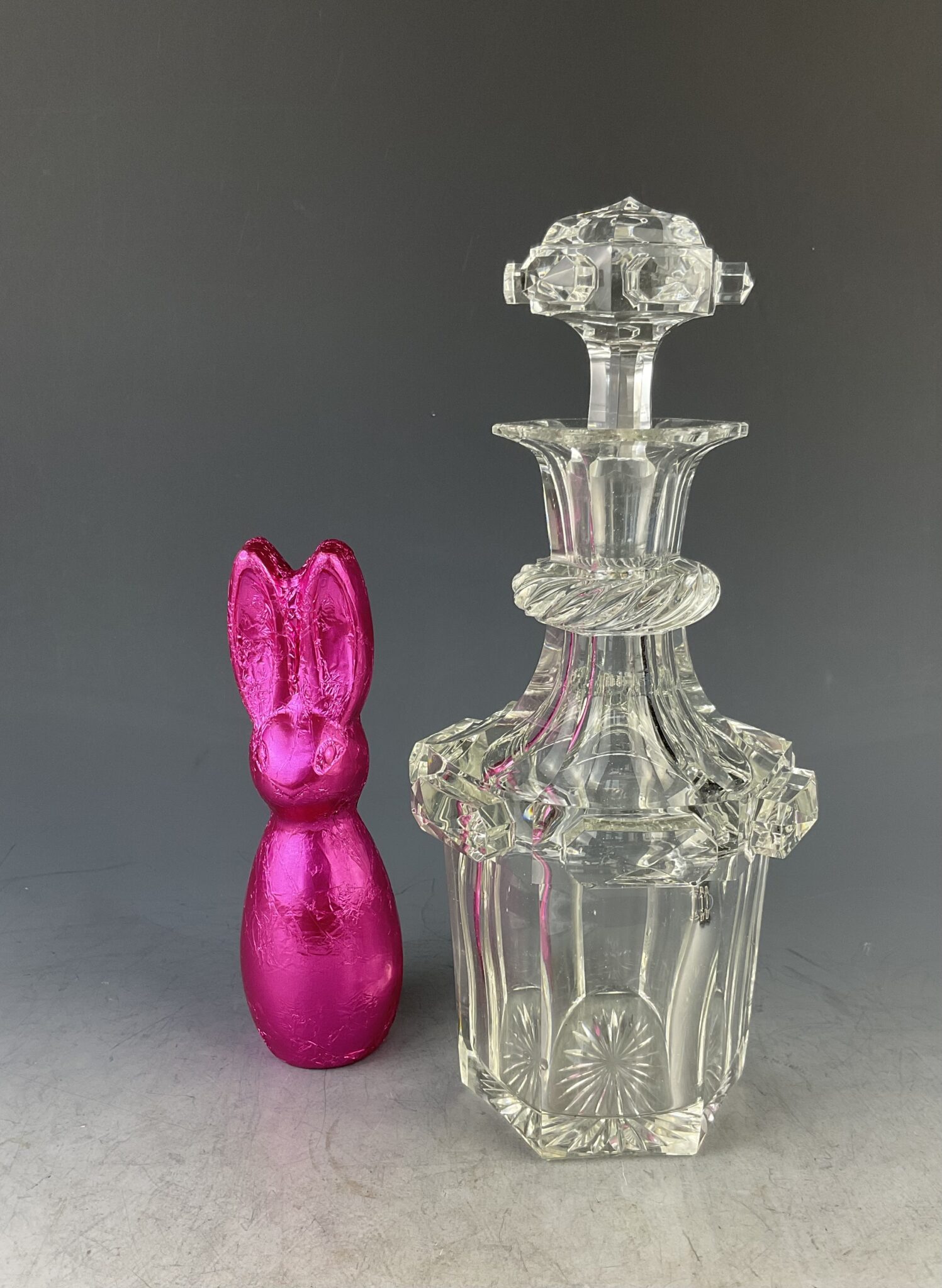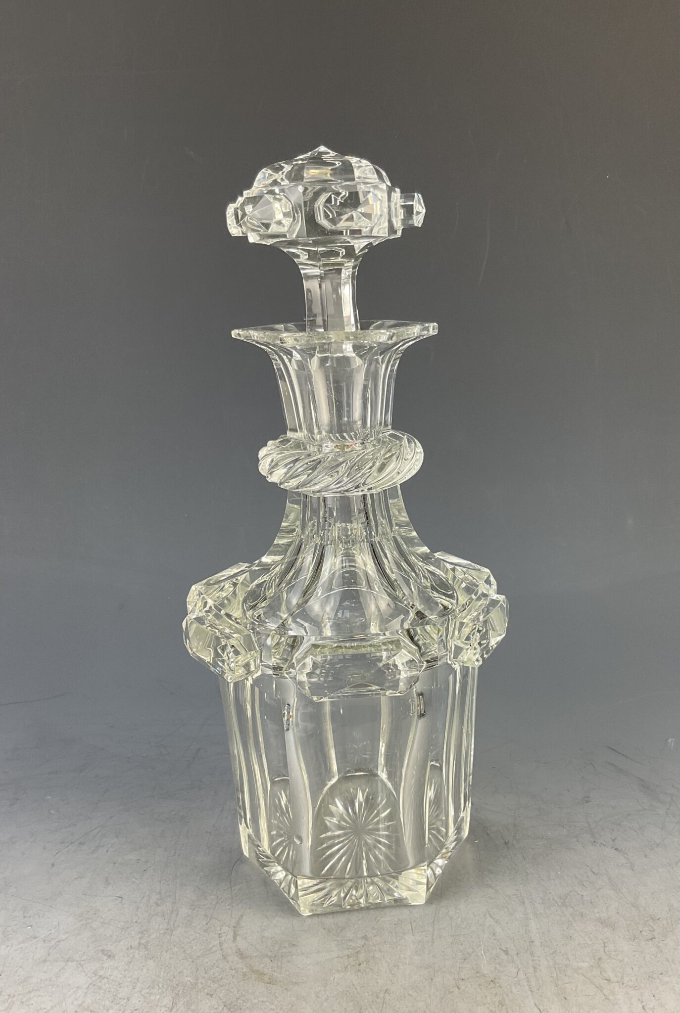 farbloser, zylindrischer Kristallglaskörper, handgeschliffen, langer Hals mit Profilringen, aufwendiger Schälschliff, Bodenschliffstern, ausgestellter Lippenrand, zugehöriger kantiger Stoppl, tadelloser Erhaltungszustand