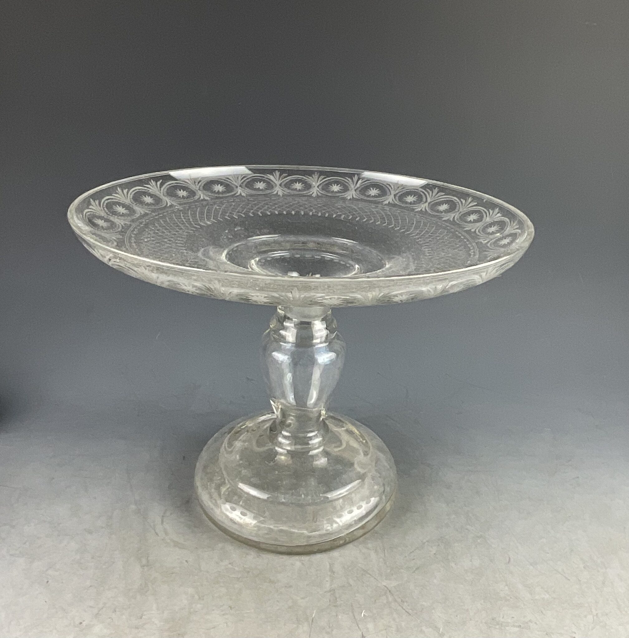 farbloses Glas, handgeschliffen, runder, hohler Fuss, gebauchte Aufsatzschale, geschliffener Dekor mit Sternen, tadelloser Erhaltungszustand