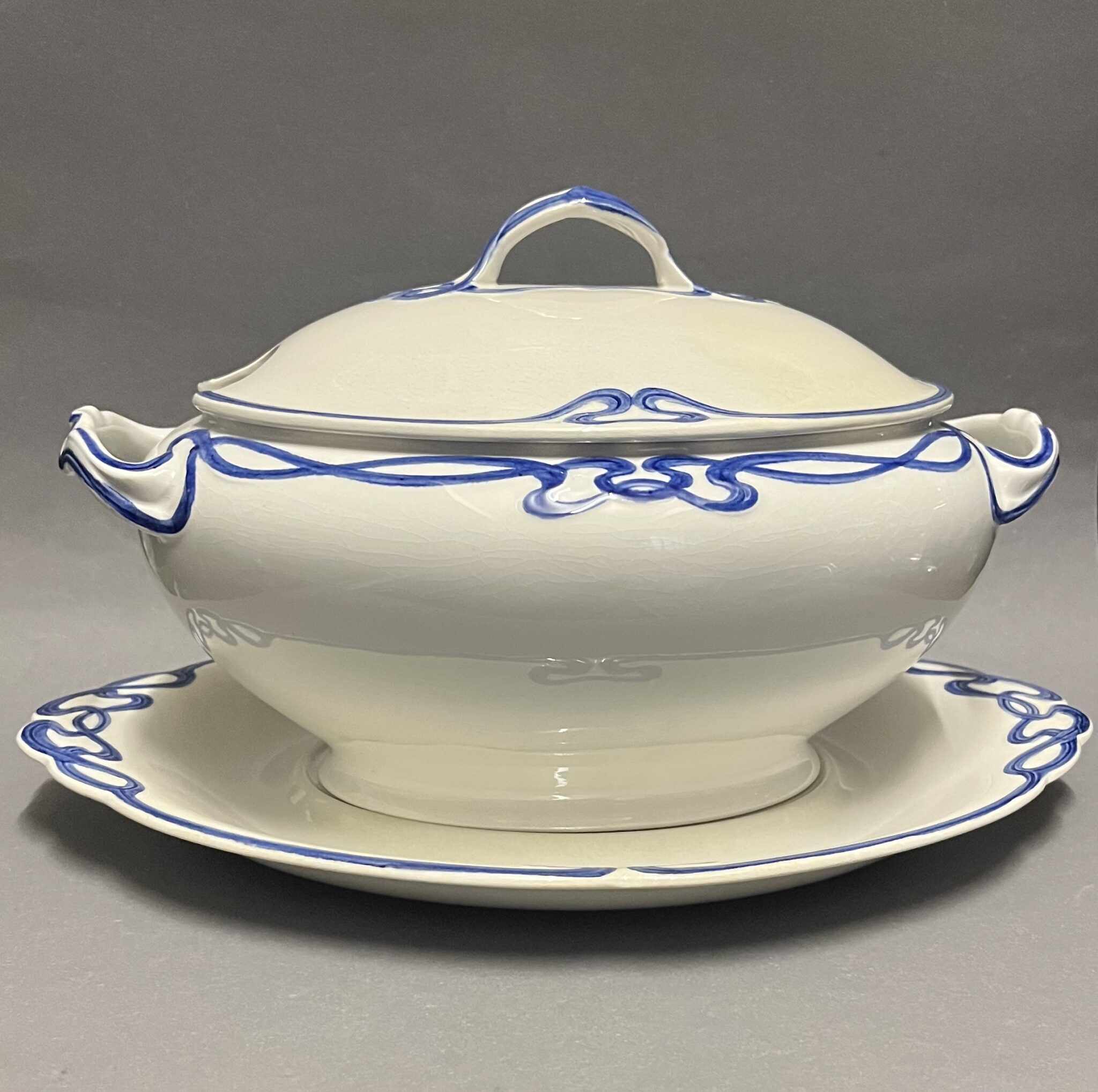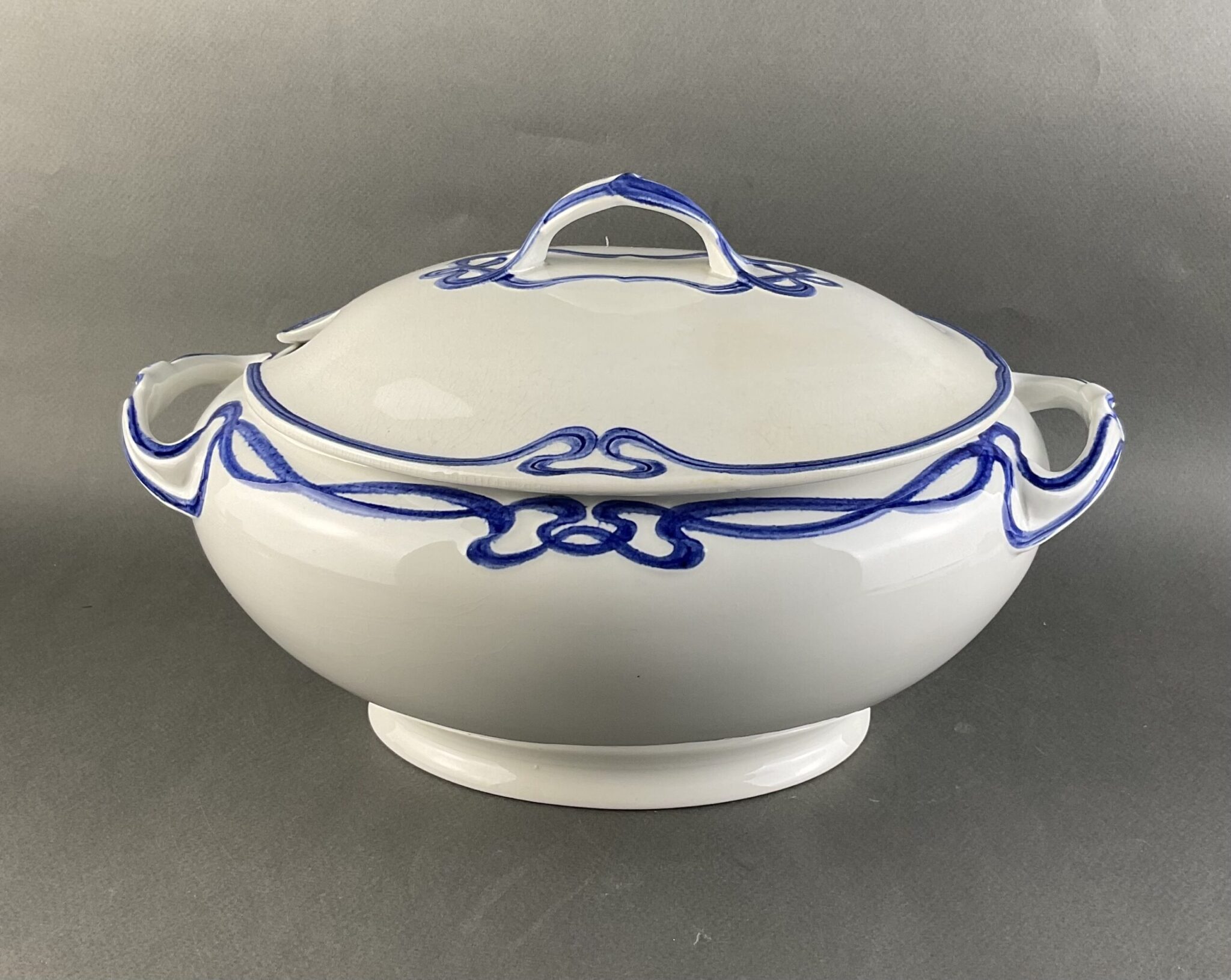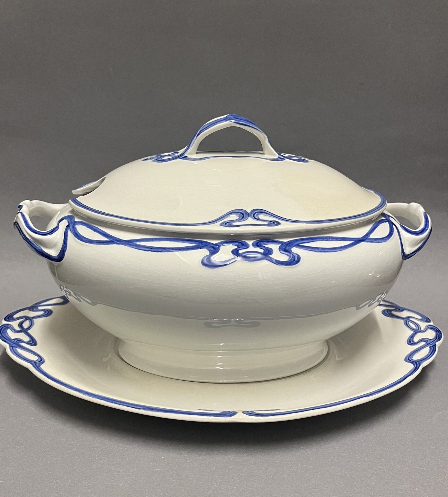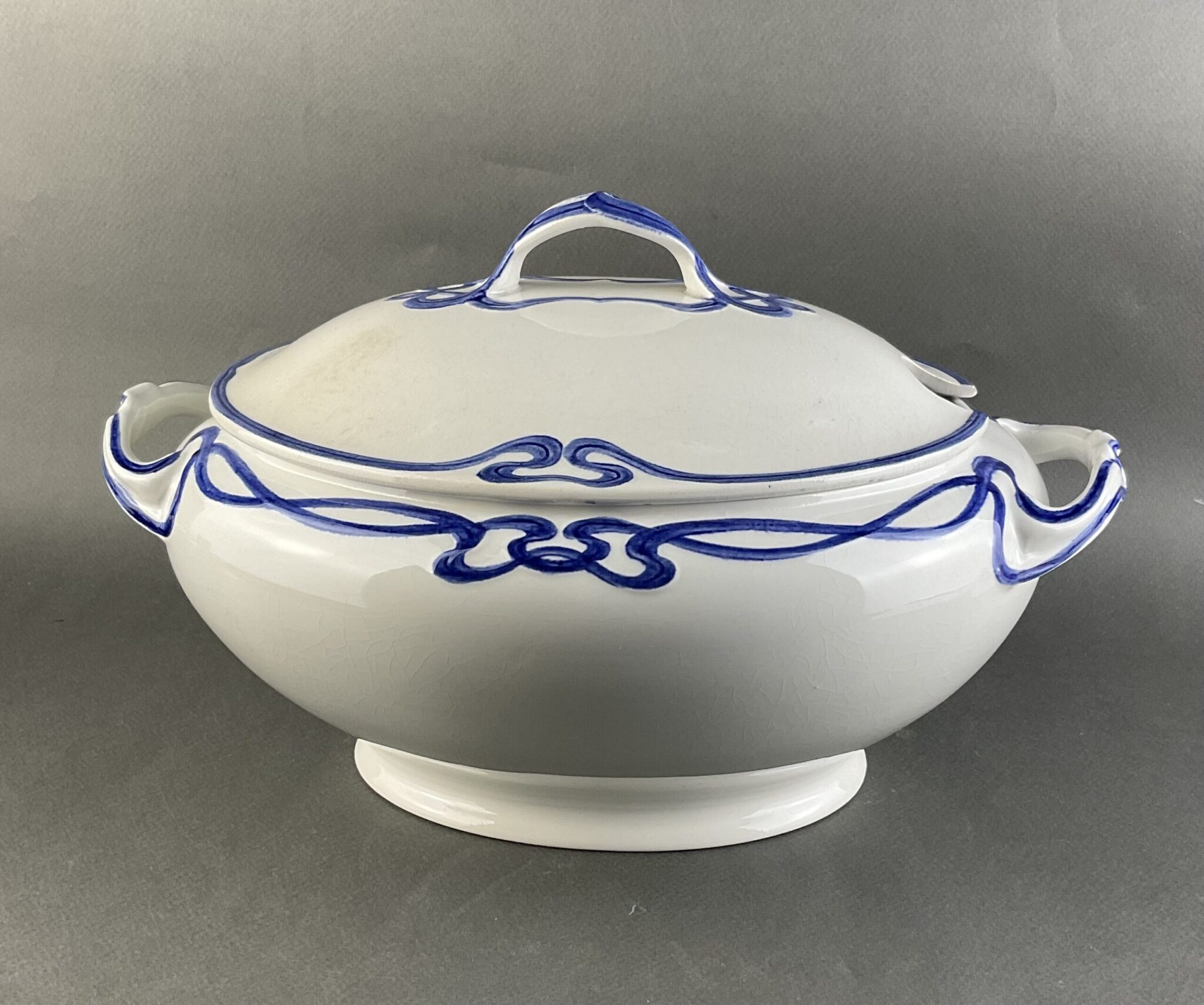 Steingut, farblos glasiert, ovale Suppenterrine mit zwei Henkel, kobaltblaue Jugendstil-Bemalung mit reliefiertem Banddekor, zugehöriger Deckel und Untersatz, minimale, altersbedingte Craqueléebildung, gemarkt mit brauner Manufakturmarke Villeroy & Boch, Dresden, Saxony