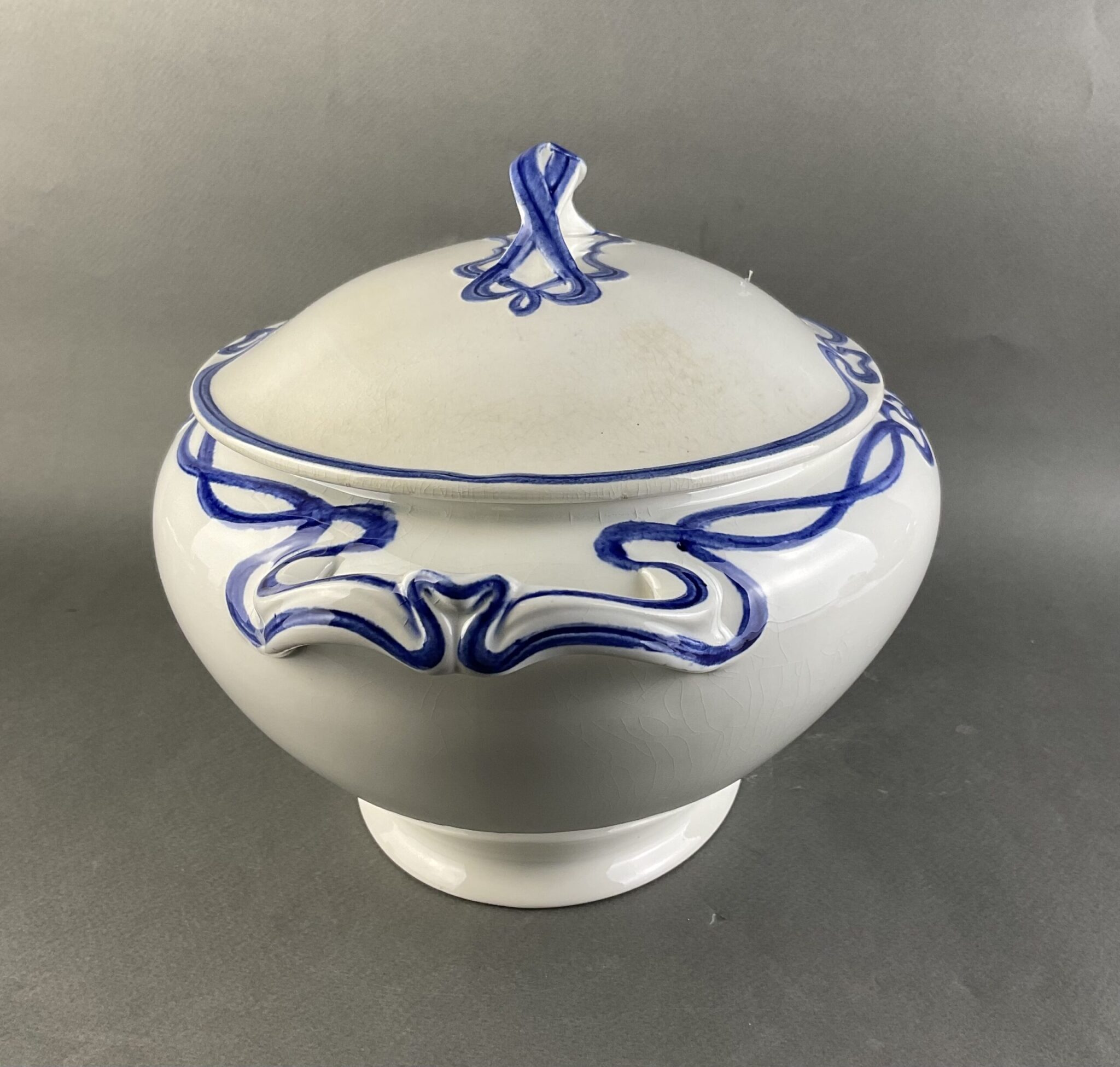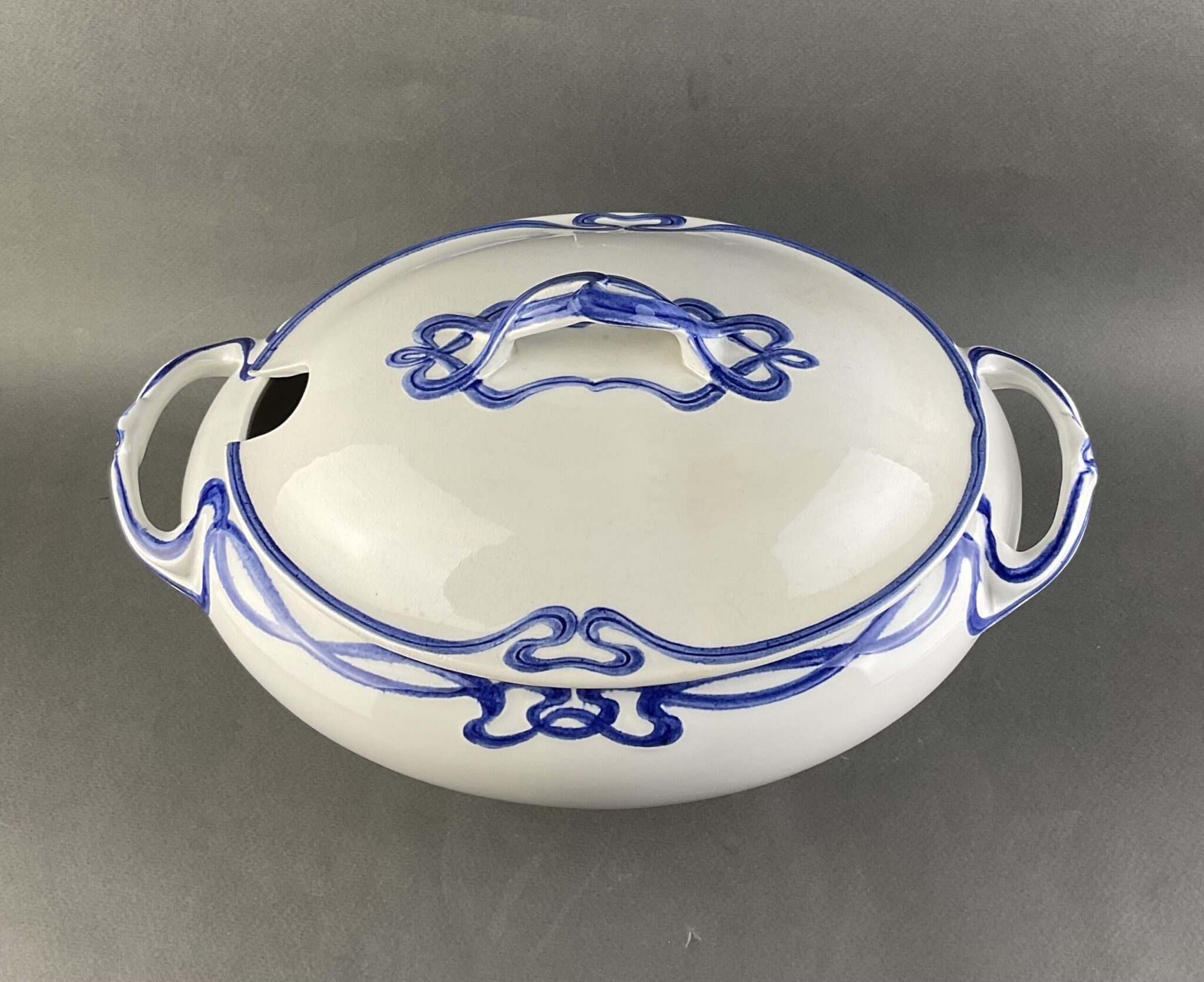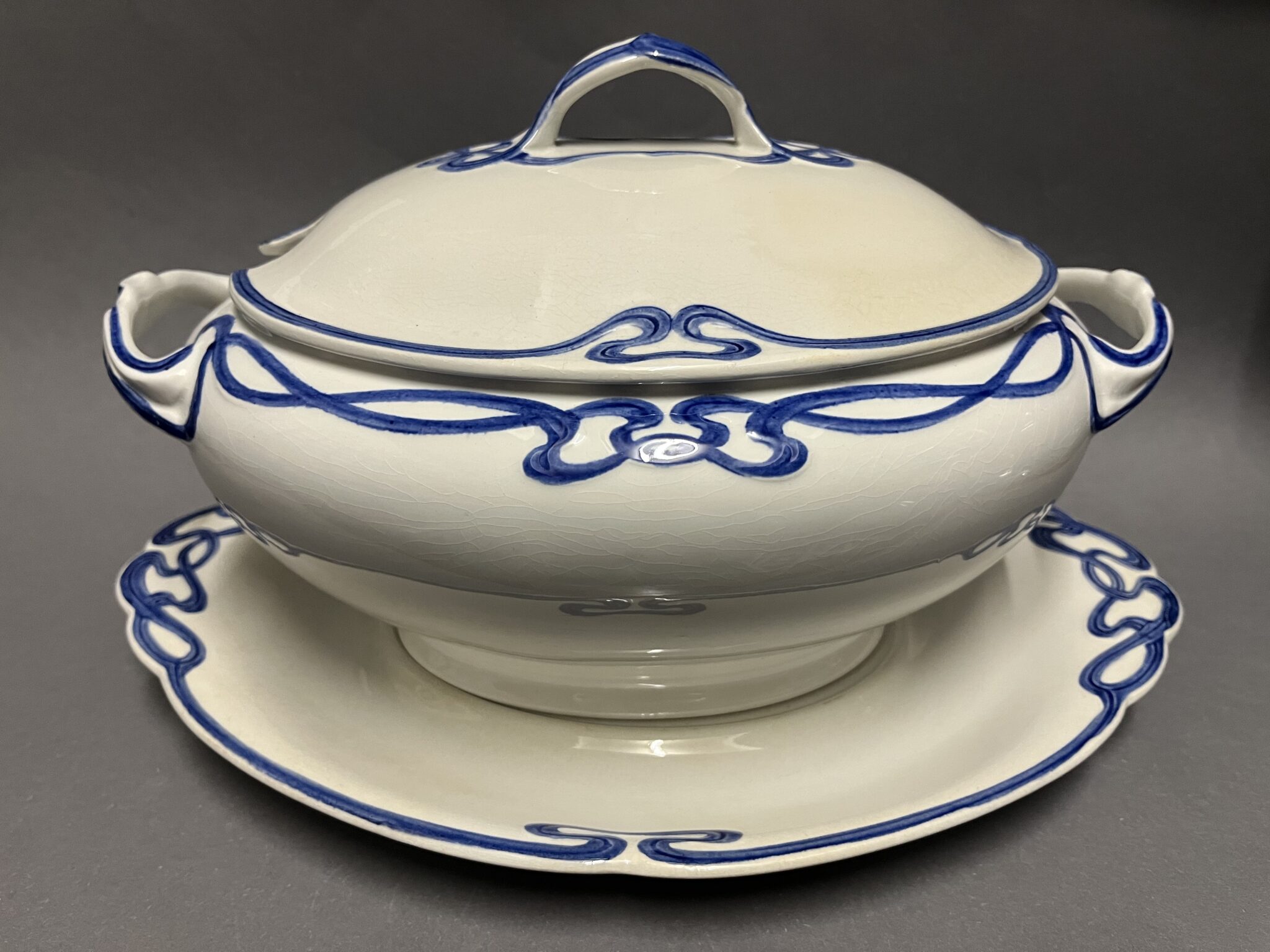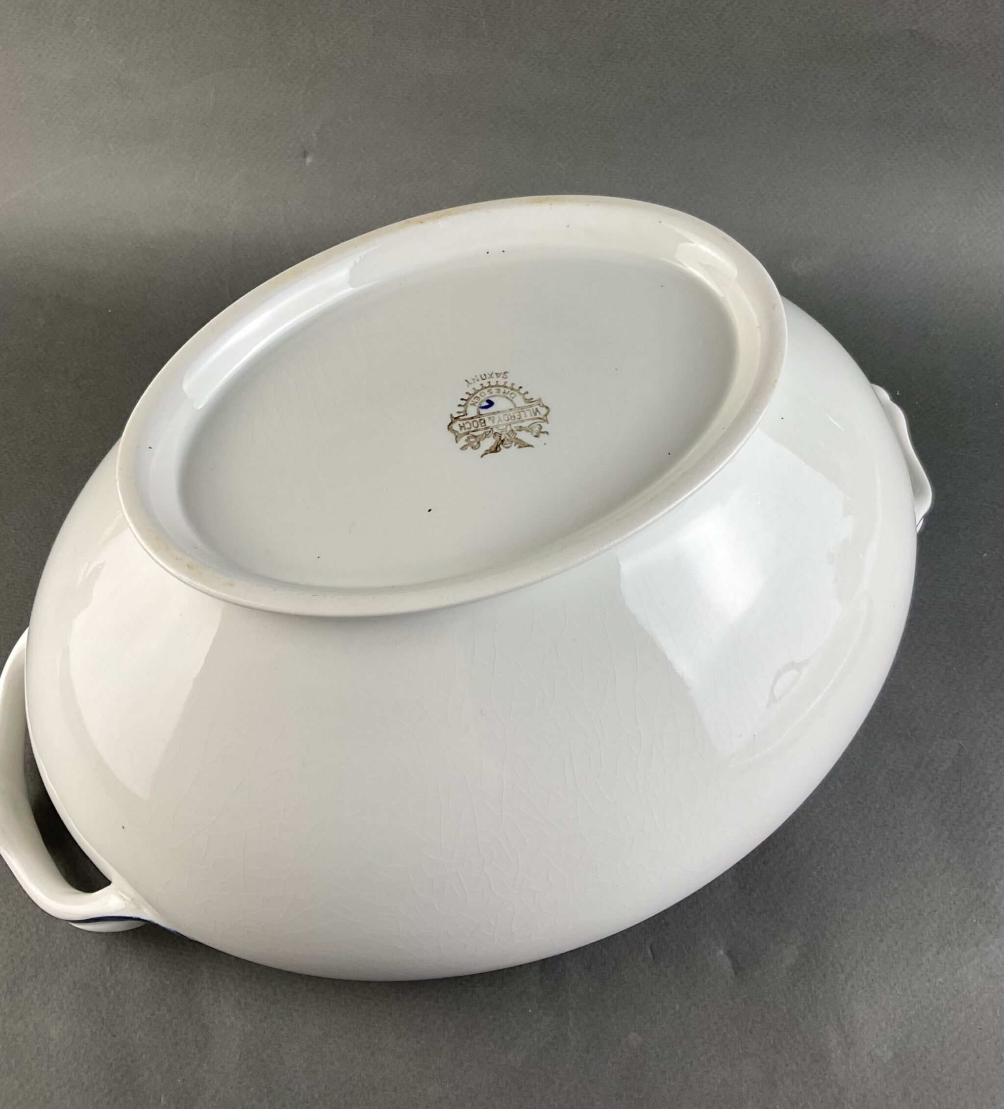 Steingut, farblos glasiert, ovale Suppenterrine mit zwei Henkel, kobaltblaue Jugendstil-Bemalung mit reliefiertem Banddekor, zugehöriger Deckel und Untersatz, minimale, altersbedingte Craqueléebildung, gemarkt mit brauner Manufakturmarke Villeroy & Boch, Dresden, Saxony