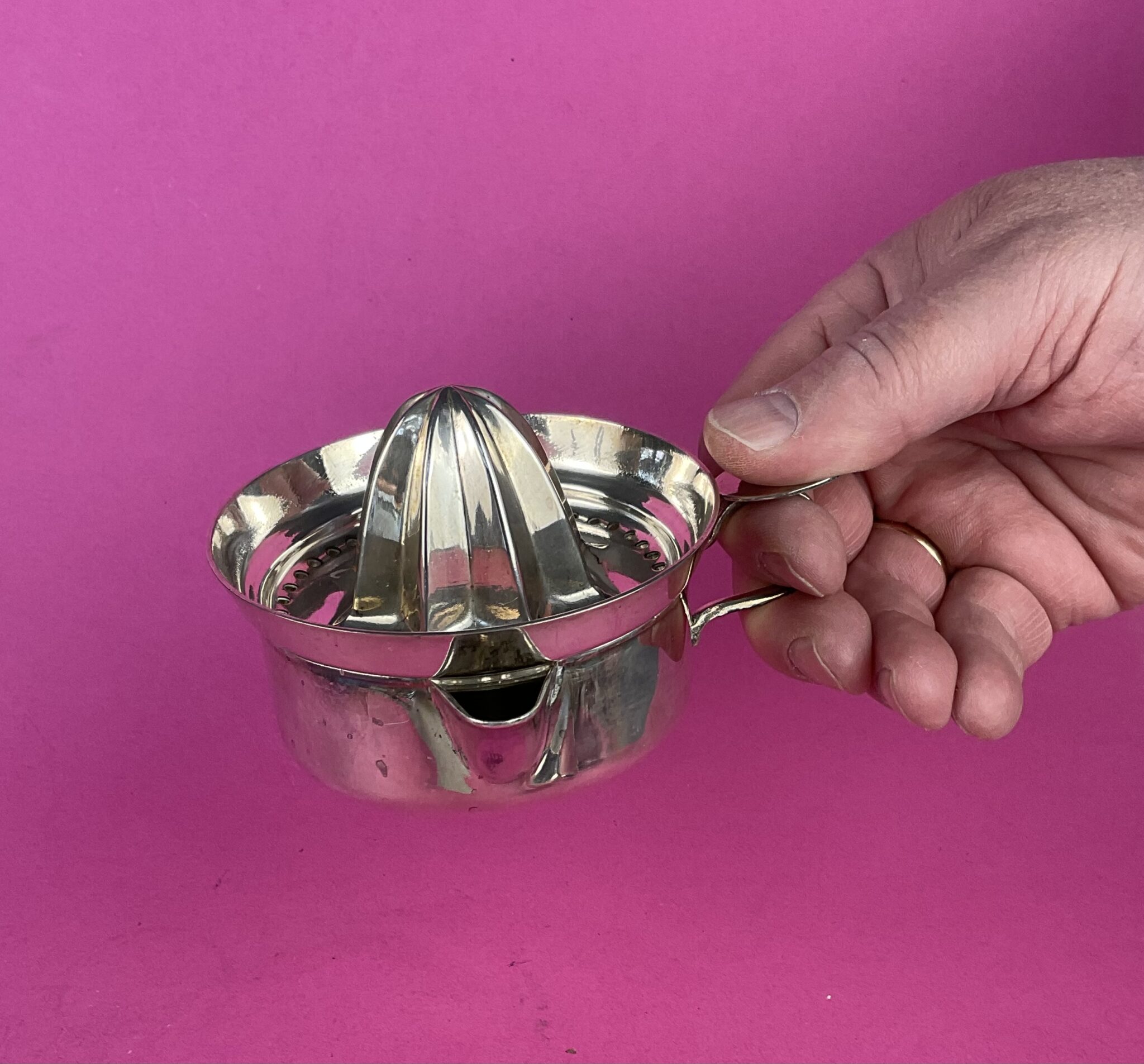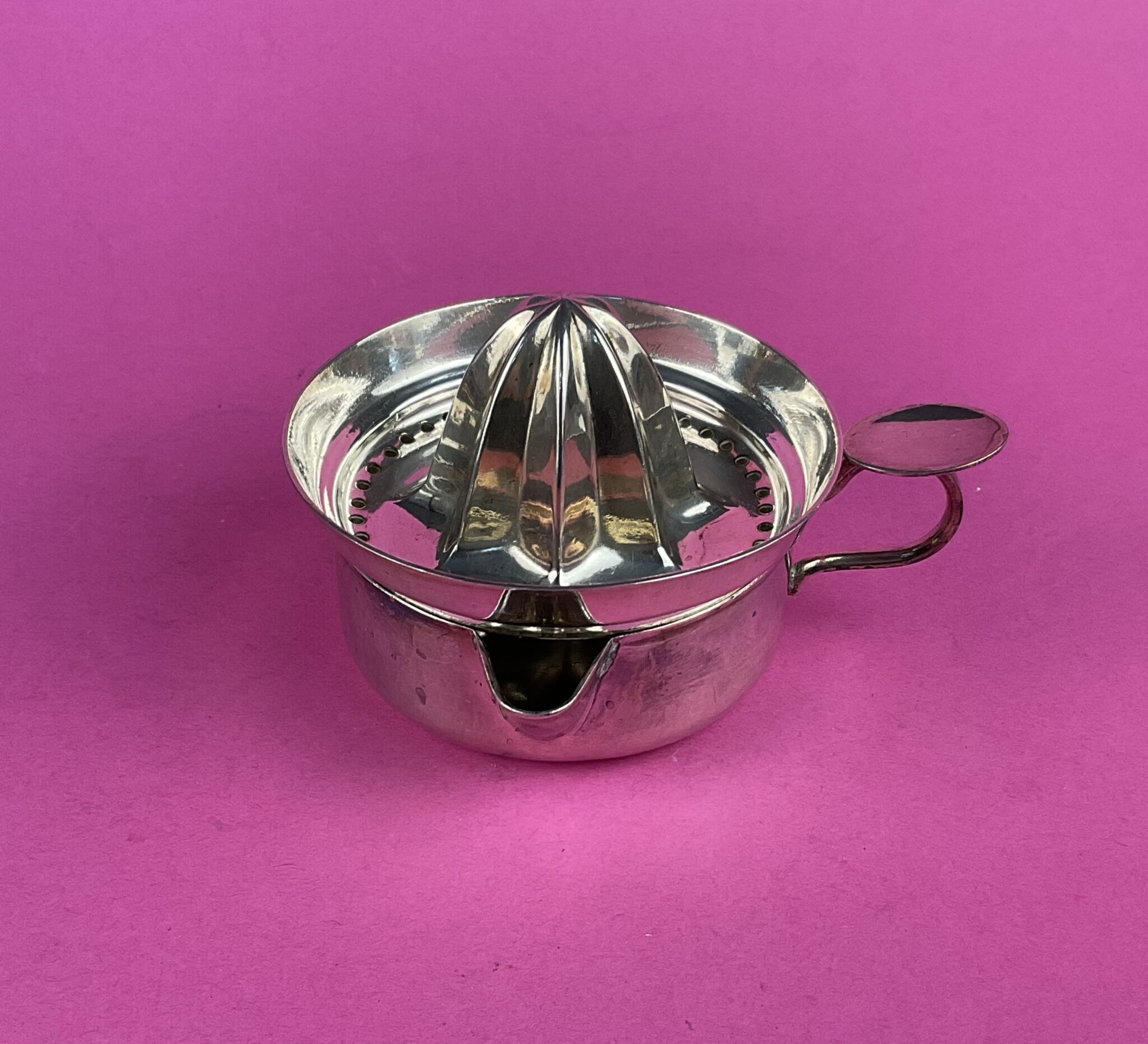 Alpacca, versilbert, runder Saftbehälter mit Pressgupf, Henkel mit Daumenrast, ungemarkt, tadelloser, handpolierter Erhaltungszustand