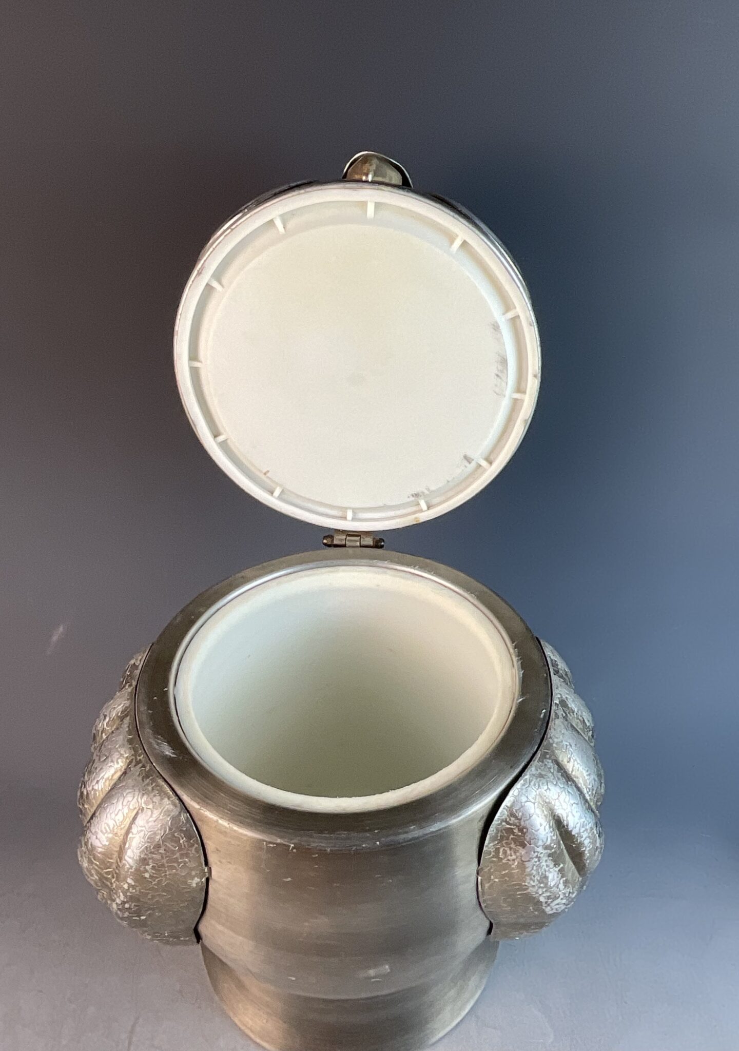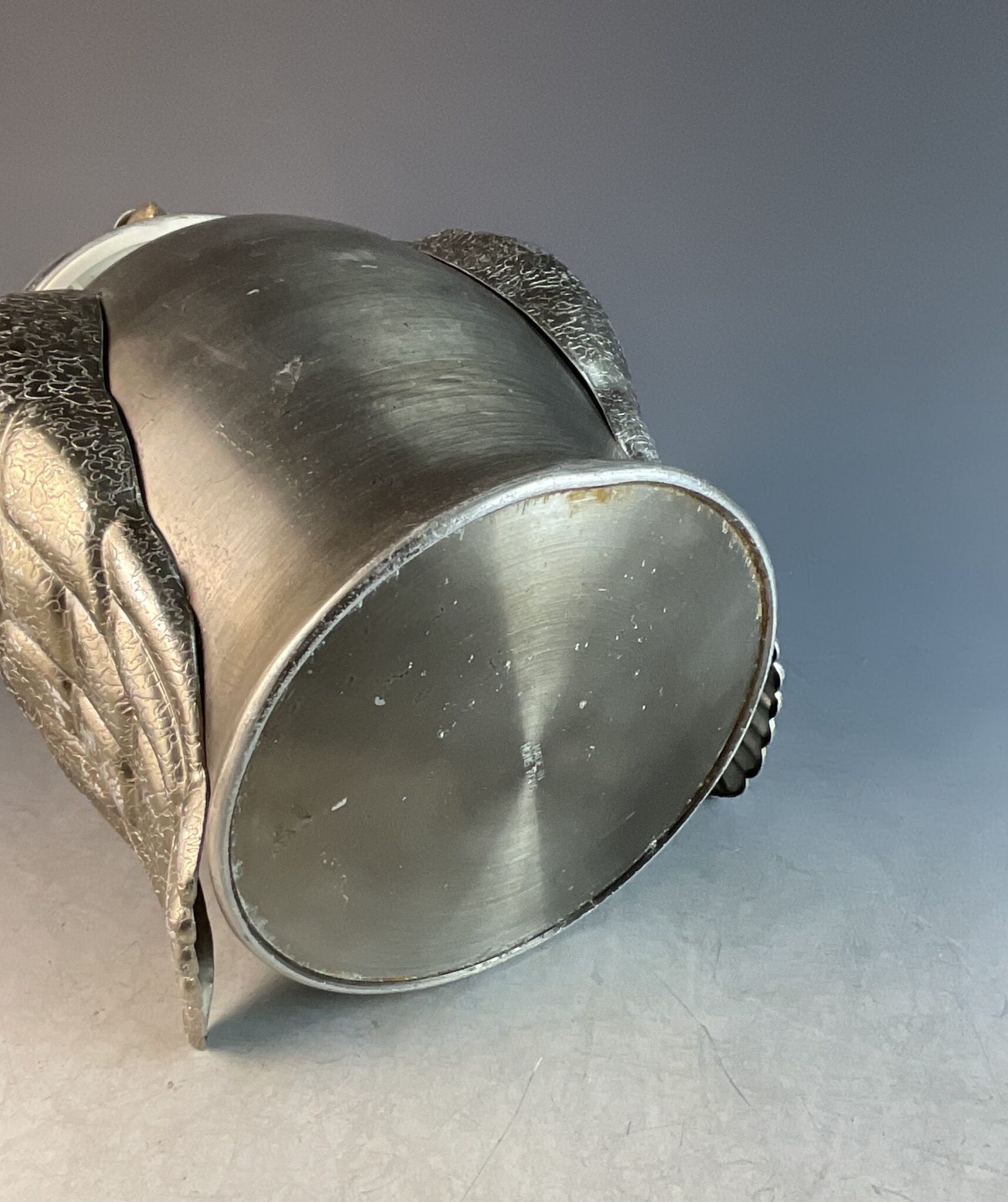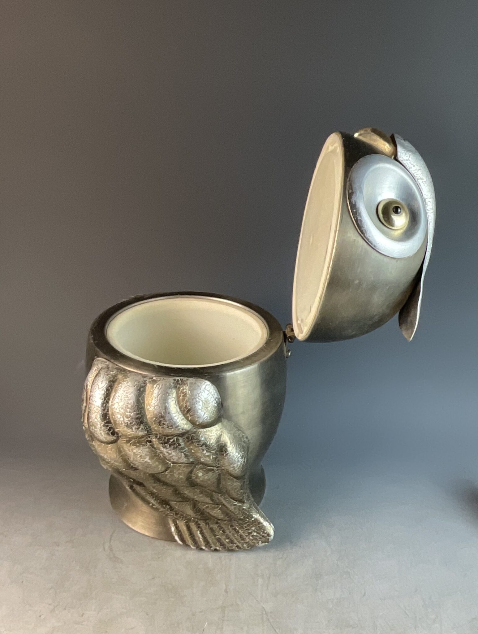 Aluminium, in Gestalt einer sitzenden Eule, Kopf als aufklappbarer Deckel, am Boden gemarkt „MADE IN HONGKONG“, weisses Kunststoffinlay, Gebrauchsspuren