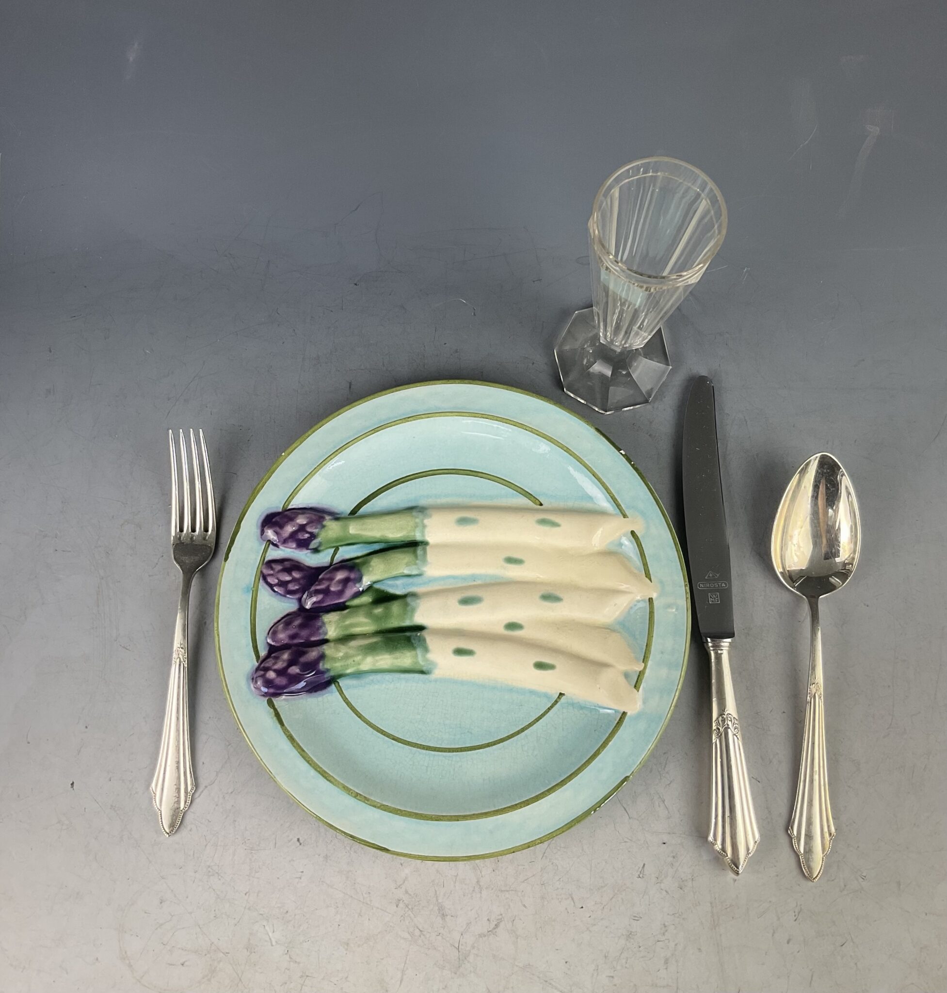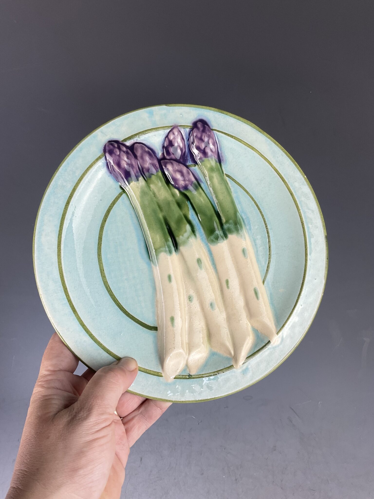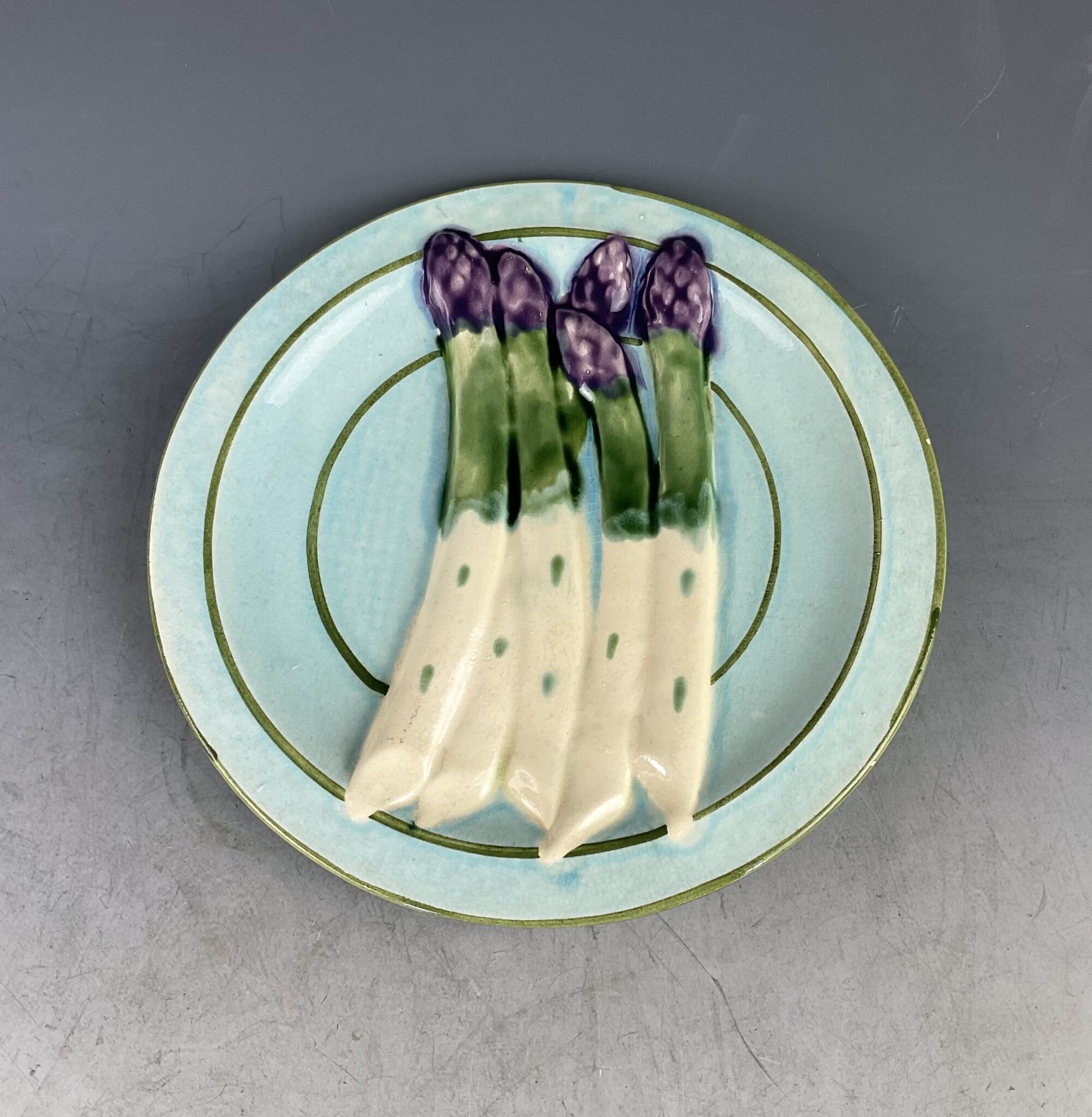 Majolika, bunt glasiert, runder Teller mit Standring, im Spiegel plastisches Relief mit Spargelmotiv, ungemarkt, Erhaltungszustand mit minimalen Altersspuren
