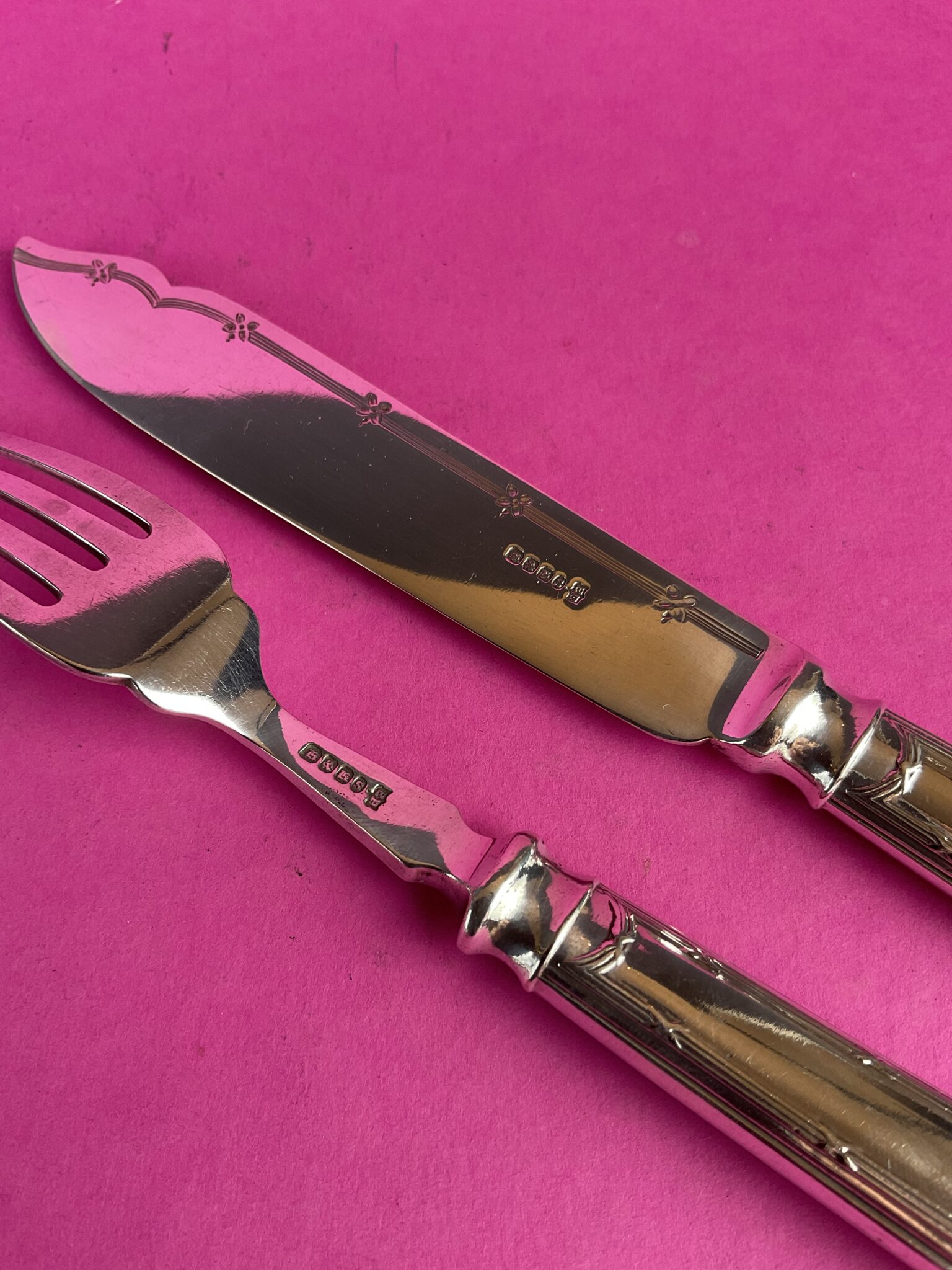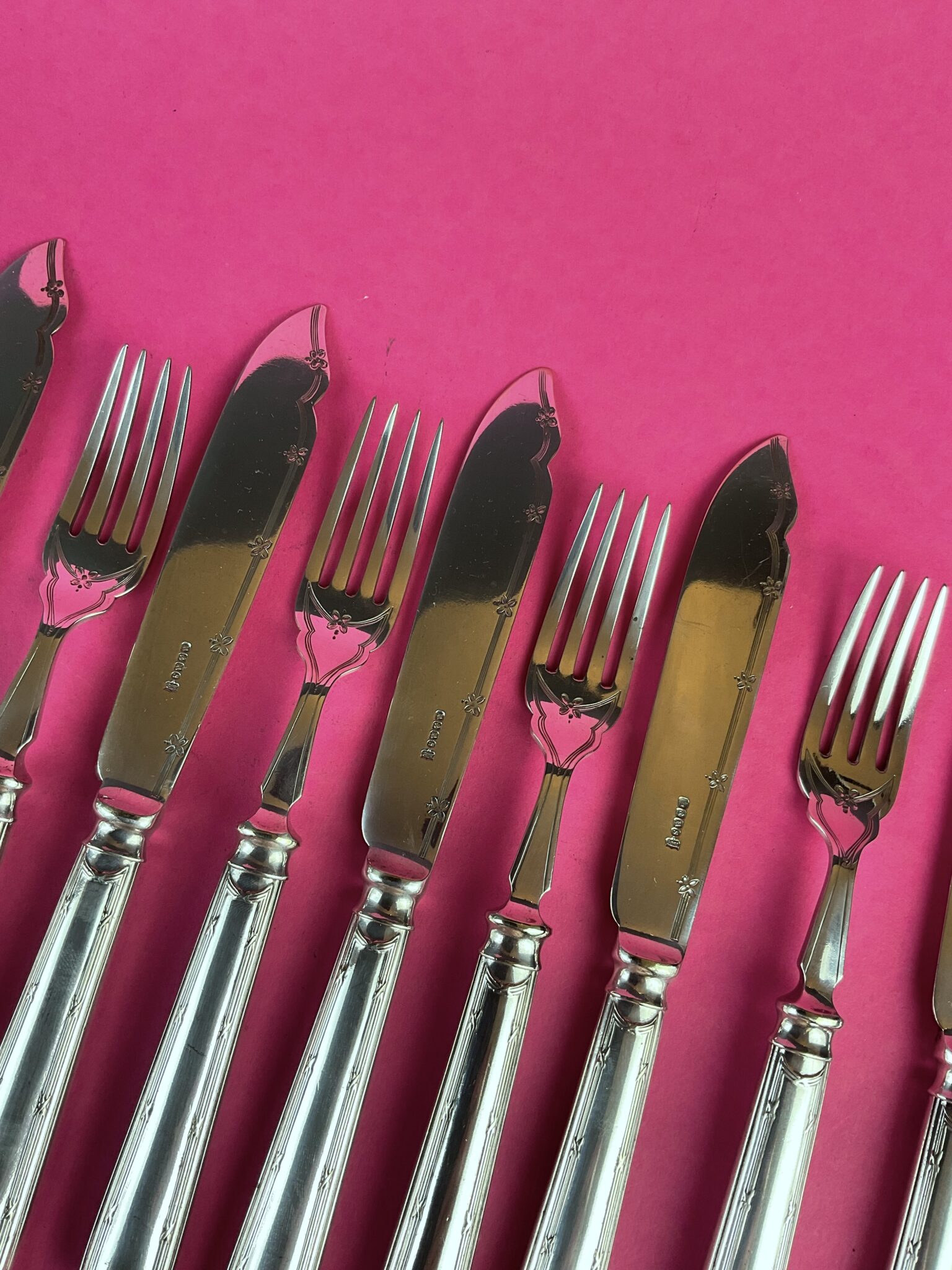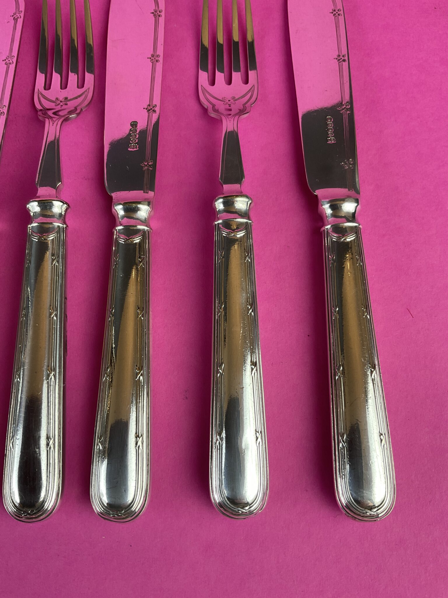 Alpacca, versilbert, 12 Hohlhefte mit Kreuzbanddekor „Rubans“, Aufsätze gemarkt mit englischer Herstellermarke H & HS für Fa. Hukin & Heath, EPNS Electro Plated Nickel Silver), handpolierter Erhaltungszustand