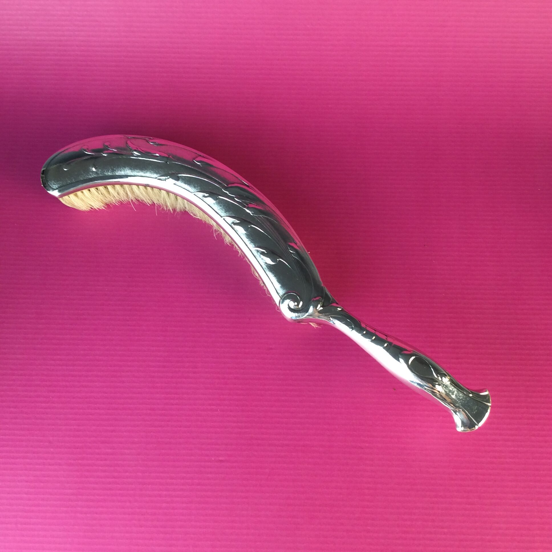 Alpacca, versilbert, rechteckige Schaufel mit Haltegriff, guilochiert, geschwungener Besen „Renaissance“ mit hellen Rosshaarborsten auf Holzkern, Tischbesen mit runder Firmenmarke mit schreitendem Bären, handpolierter Zustand