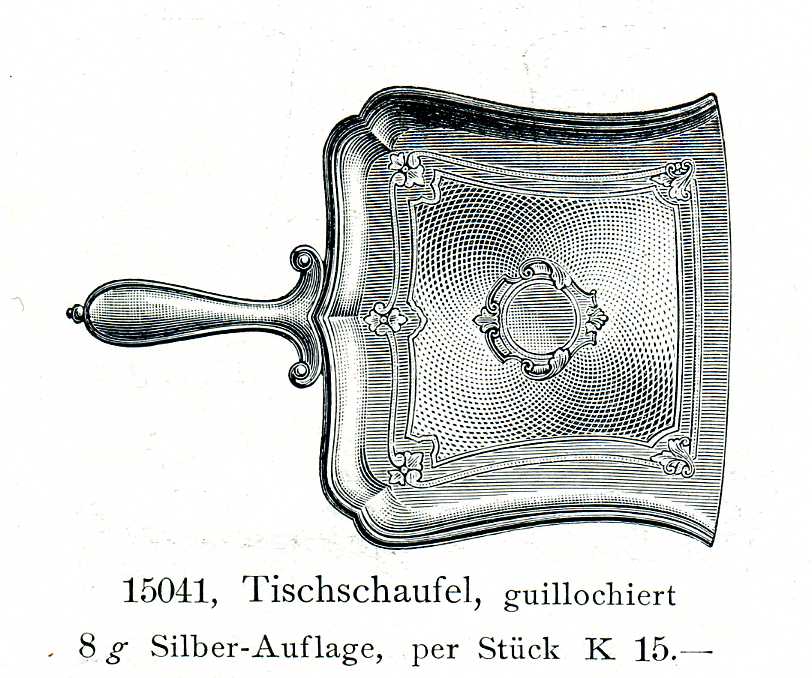 siehe Verkaufskatalog der Firma Berndorf, 1911, Modellnummer 15041 (Tischschaufel) und 15032 (Tischbürste)