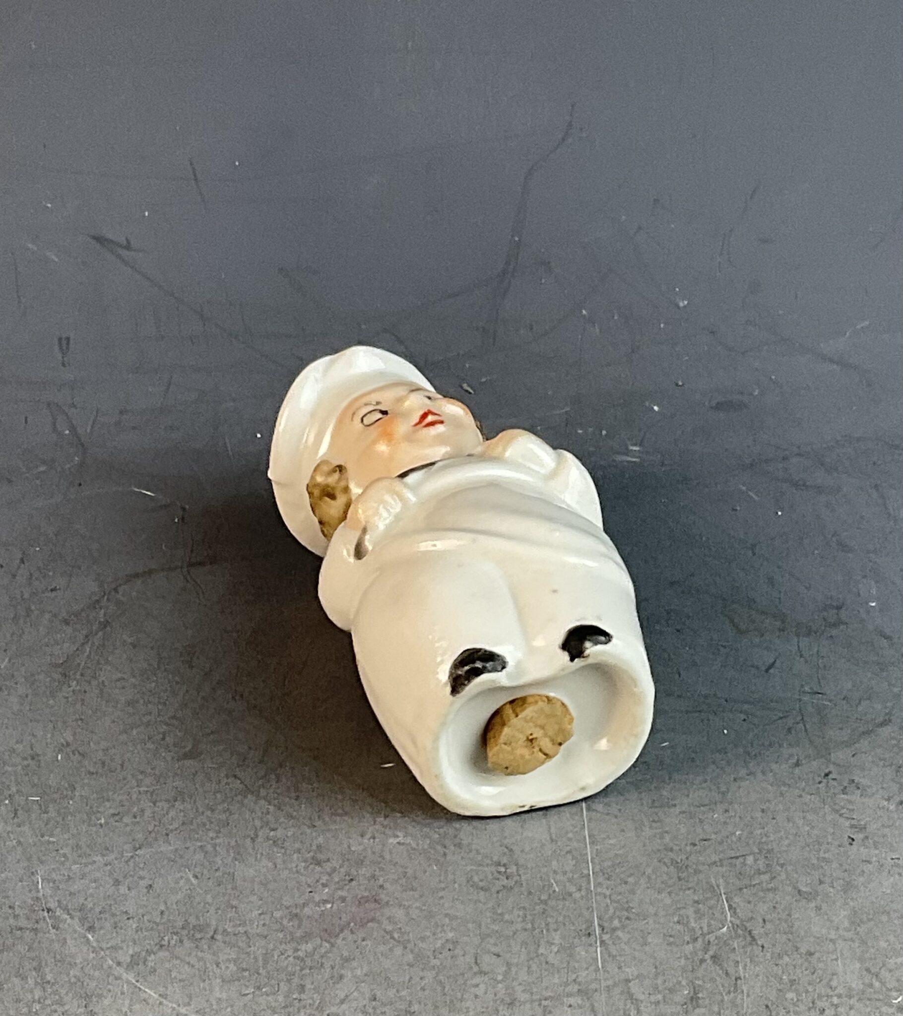 Porzellan, bunt bemalt, in Gestalt eines Kochs mit Schürze, am Kopf Perforierung als Streuer, gemarkt 7200, erneuerter, appetitlicher Stoppl aus Kork