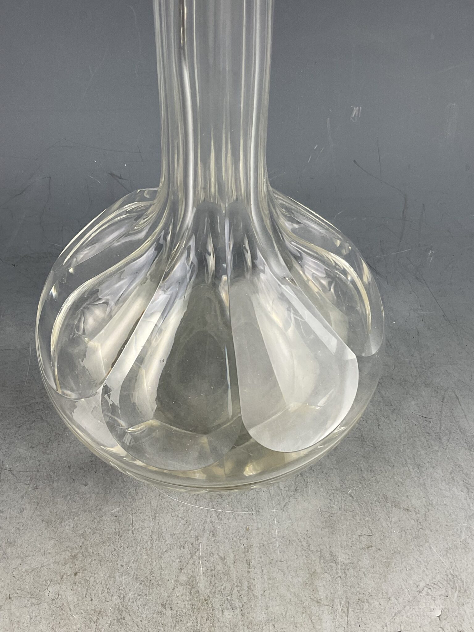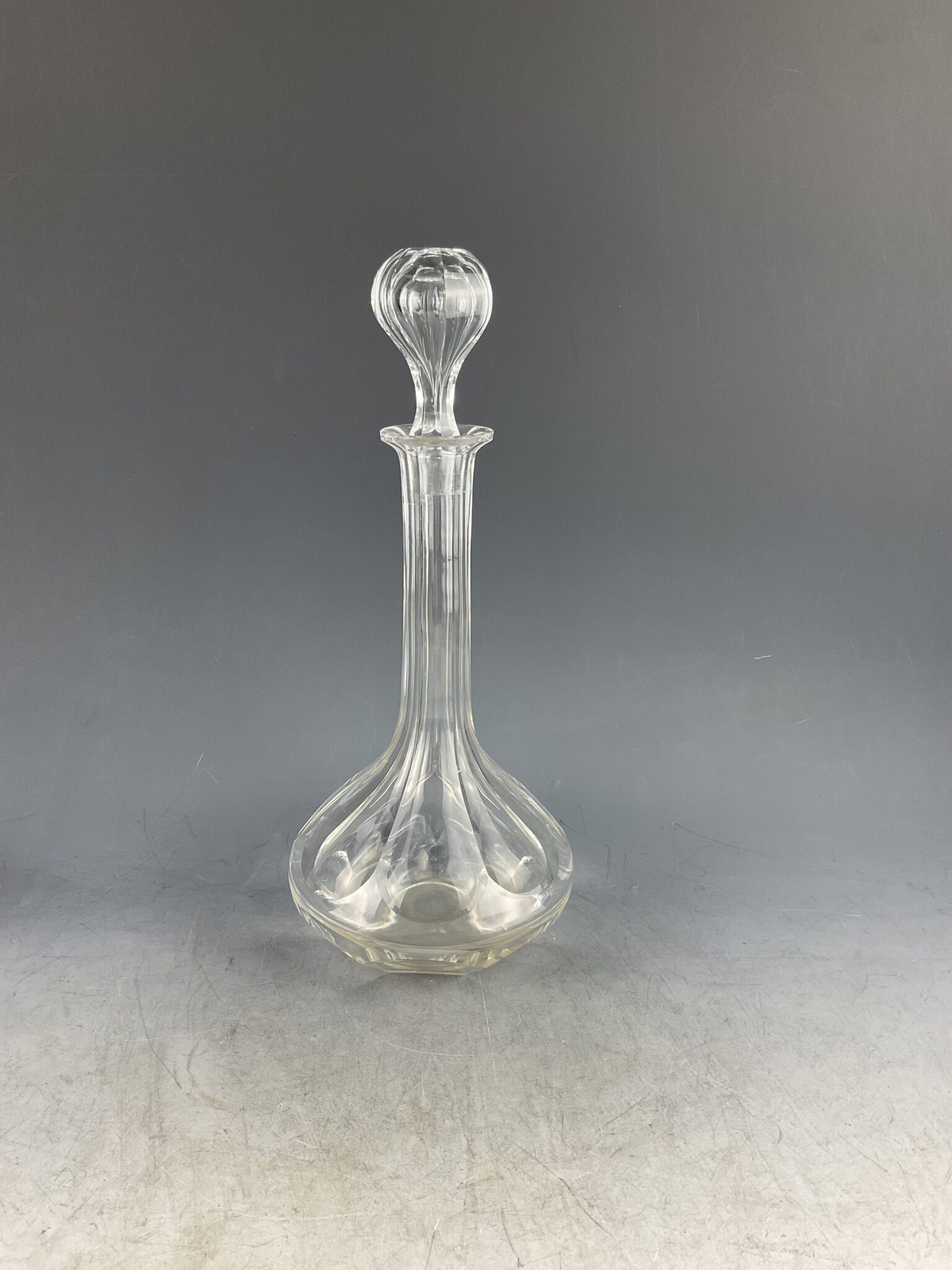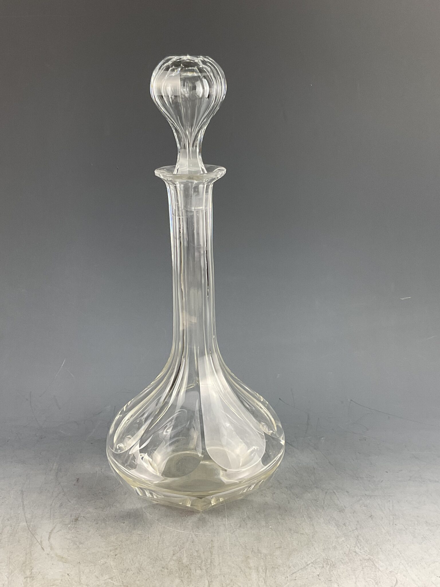 farbloses Kristall-Glas, handgeschliffen, gebauchte Wandung mit Schälschliff, langer Hals, zugehöriger Stoppel mit korrespondierendem Schliff, minimale Altersspuren, tadelloser Erhaltungszustand