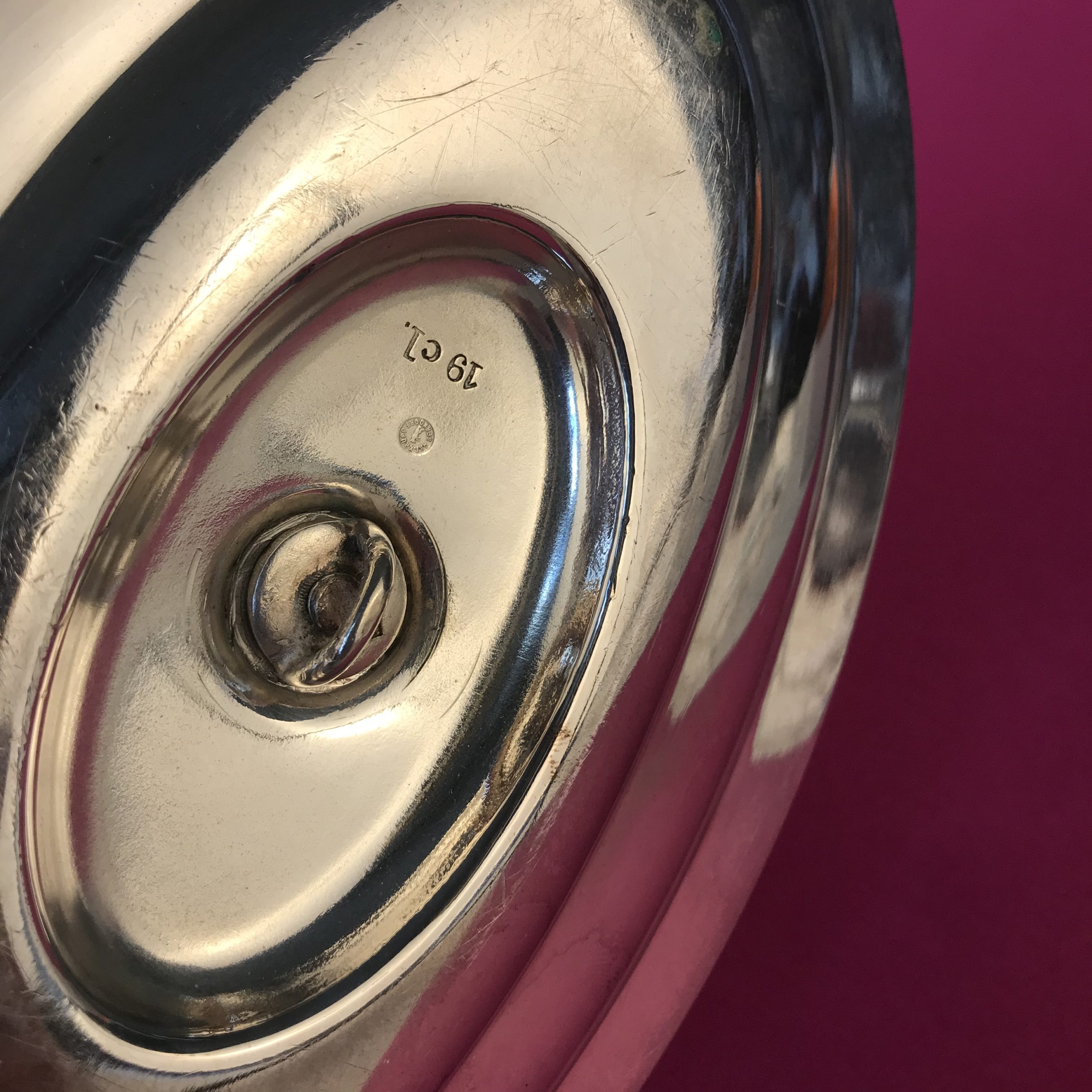 Alpacca, versilbert, hochgezogener Henkel mit Daumenrast, ovaler, abschraubbarer Untersatz mit Feststellschraube, Fahne mit Lorbeerblattdekor, beide Teile gemarkt mit runder Firmenmarke, Fassungsvermögen 19 cl