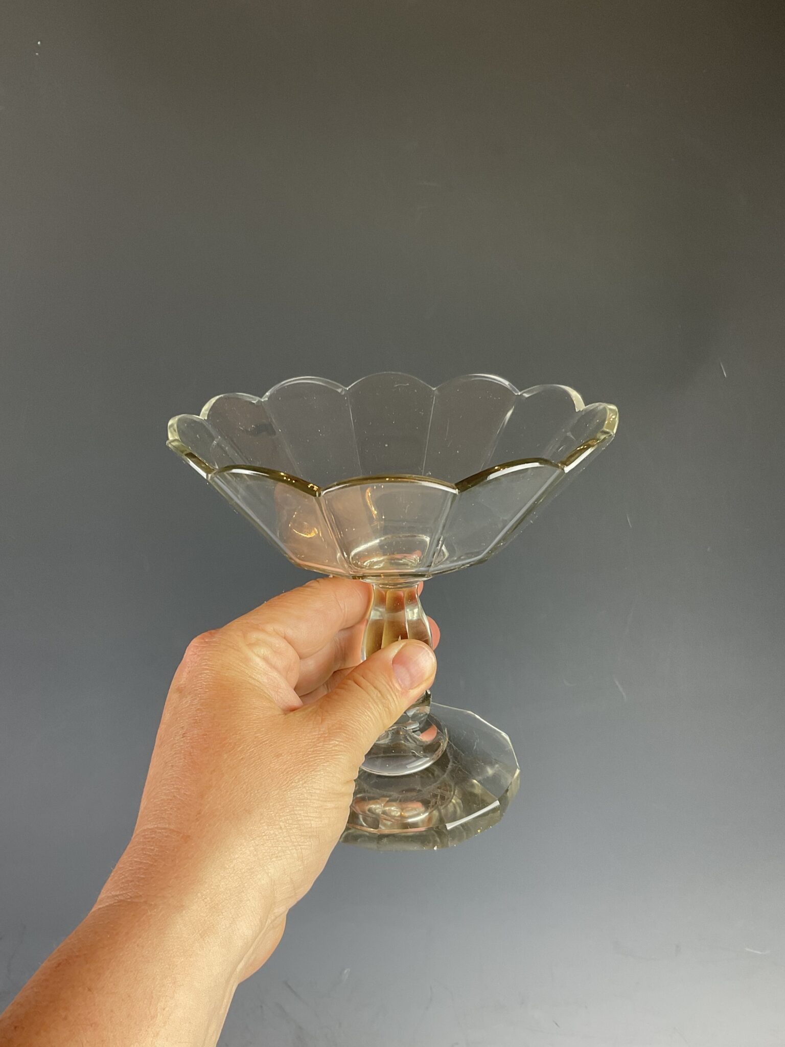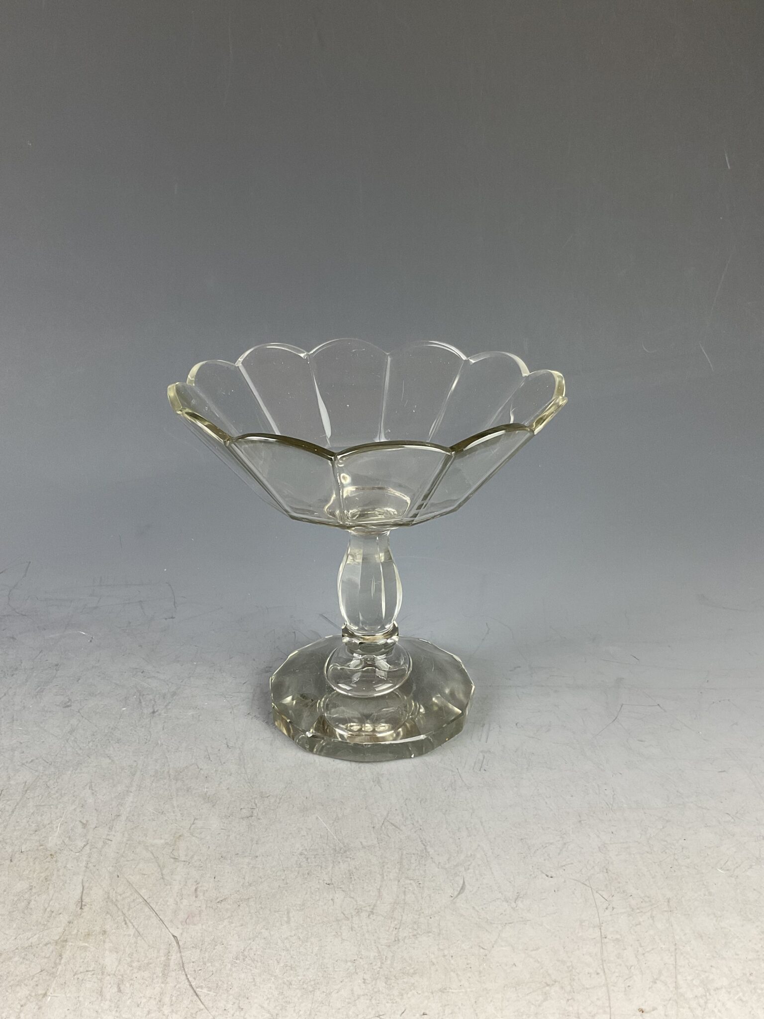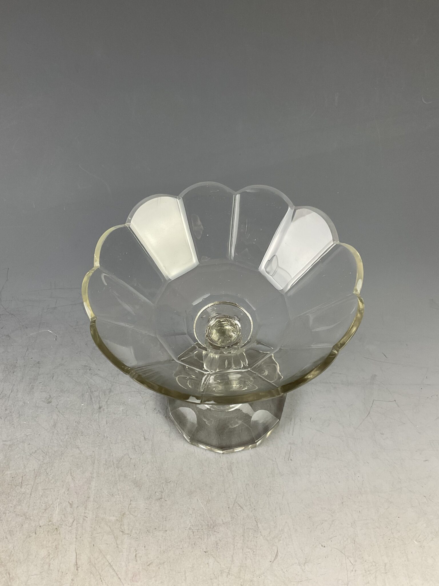 farbloses Glas, handgeschliffen, 8 fach kantiger Fuss mit Bodenschliffstern, geschliffener, hohler Fuss mit abgesetztem Nodus, Aufsatzschale mit rund geschliffener Abschlusskante, aufwendiger Facettenschliff, tadelloser Erhaltungszustand