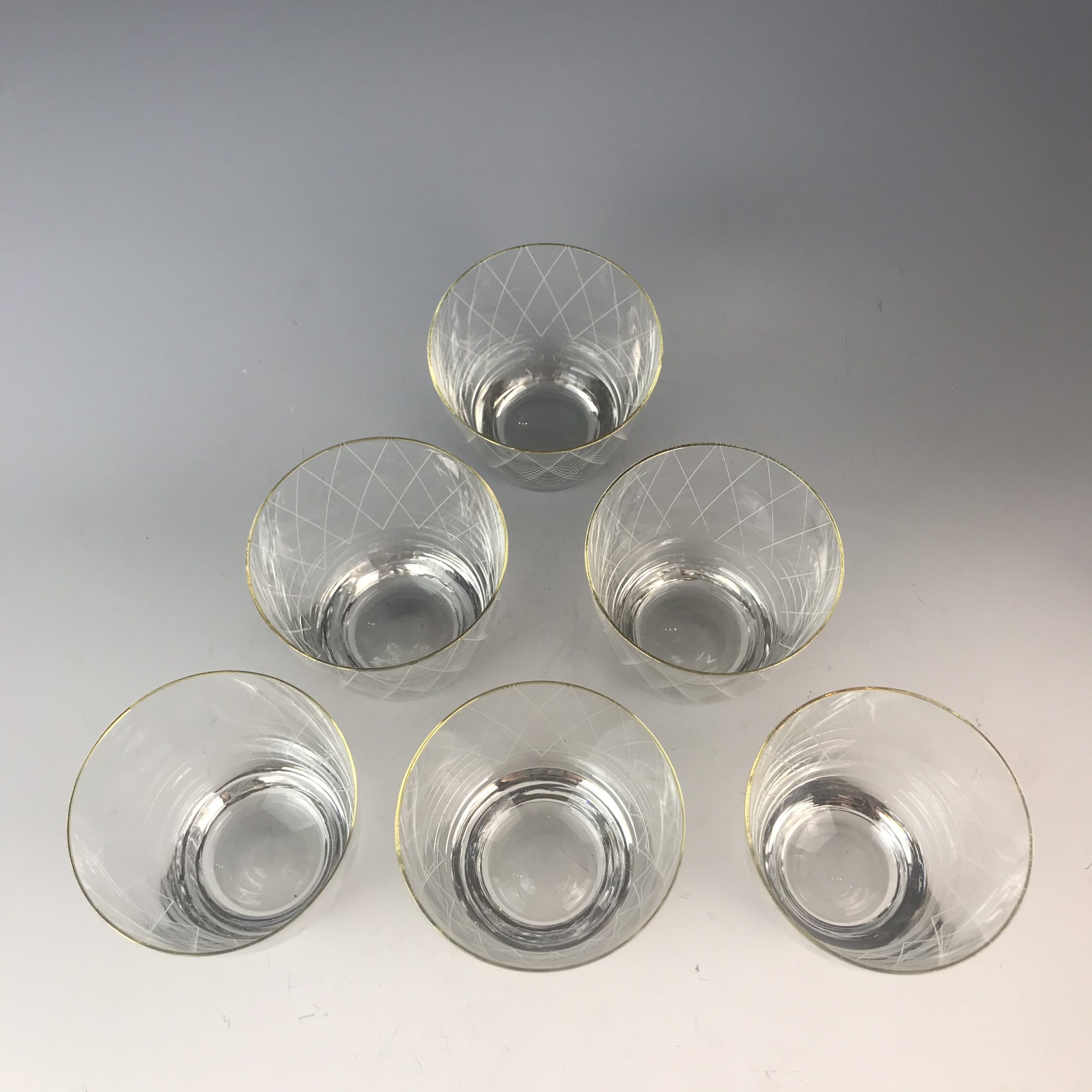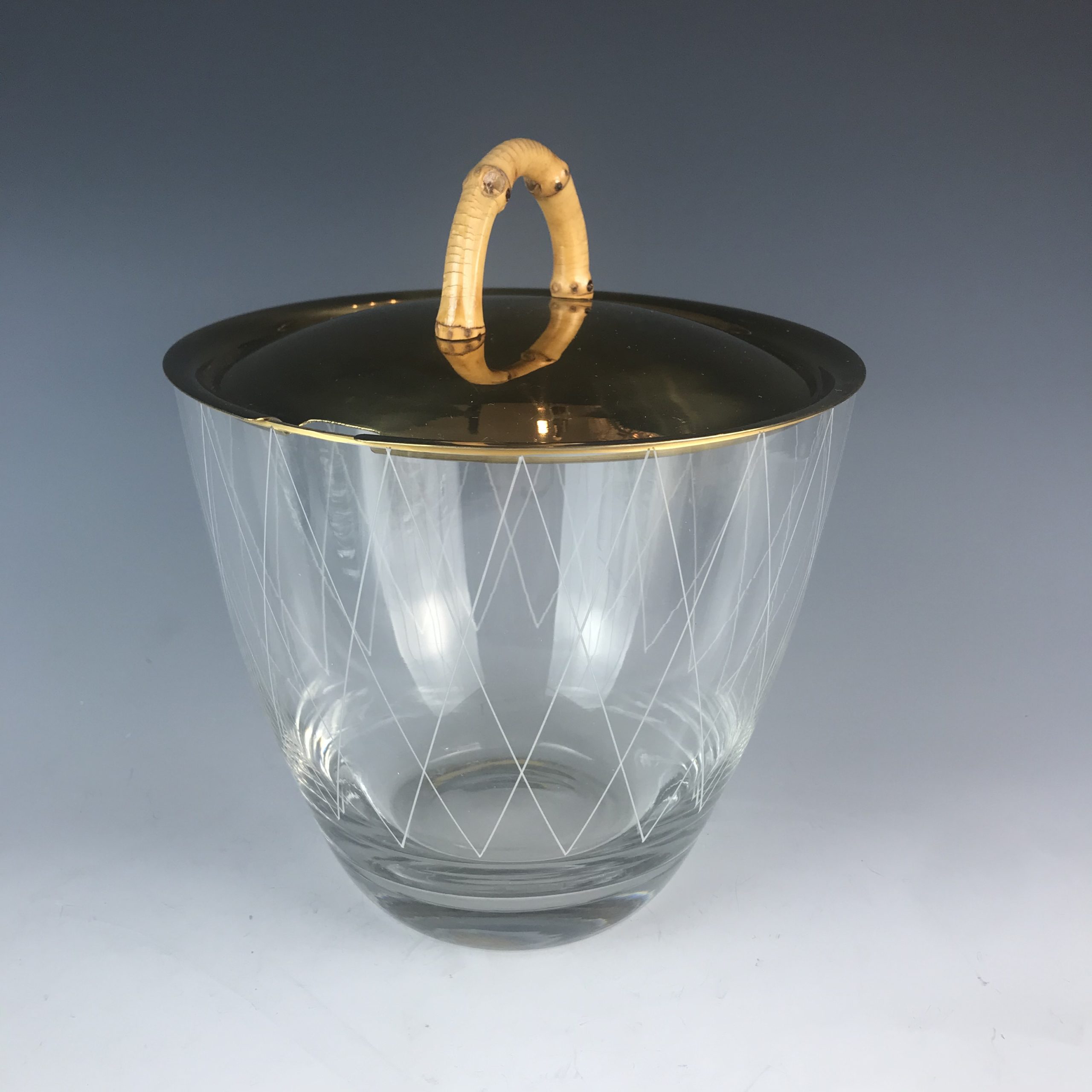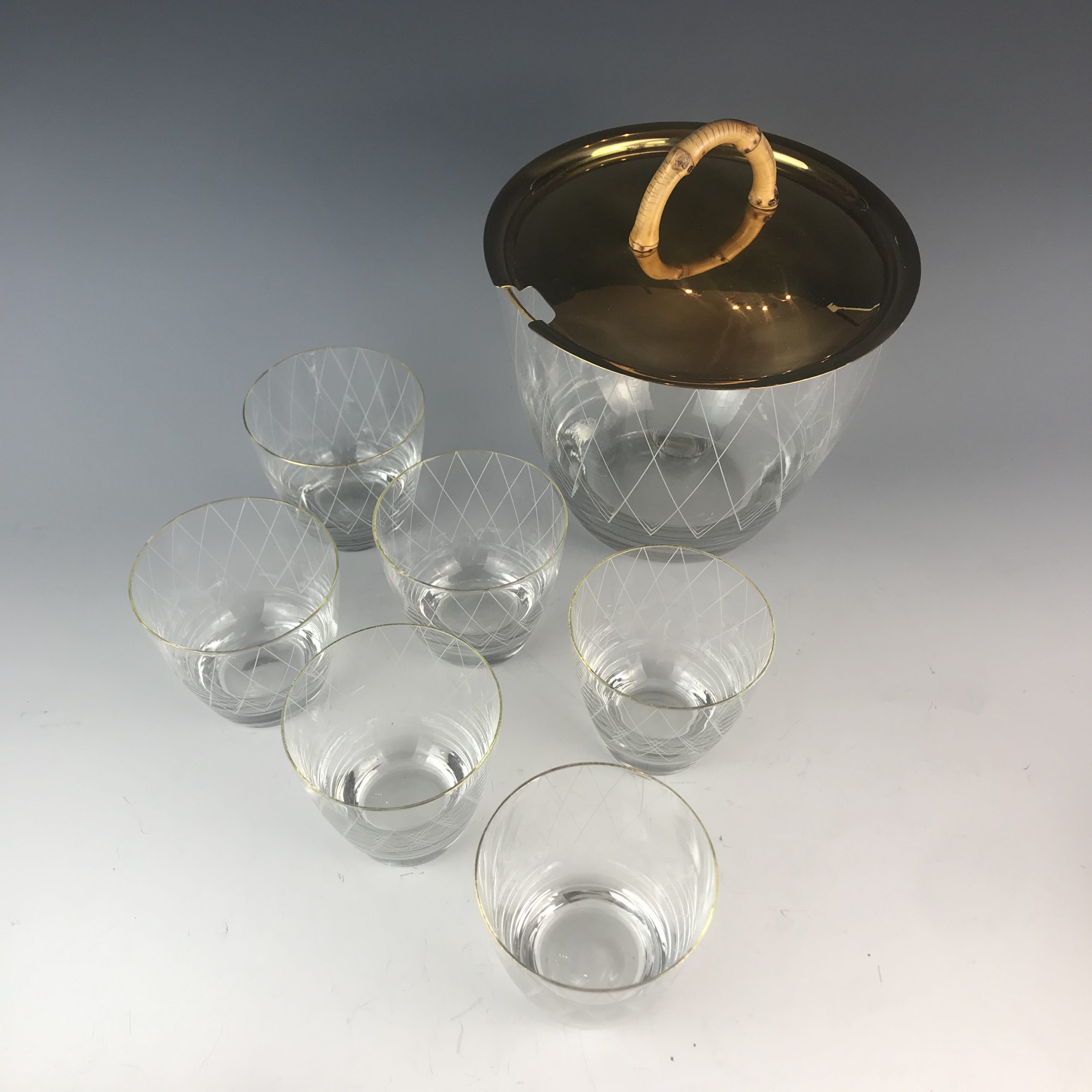 Messingdeckel mit Bambusgriff und Ausnehmung für einen Bowleschöpfer, Bowlegefäß und 6 Gläser mit korrespondierendem Netzdekor an der Wandung, unleserlicher Rest eines Herstelleretiketts